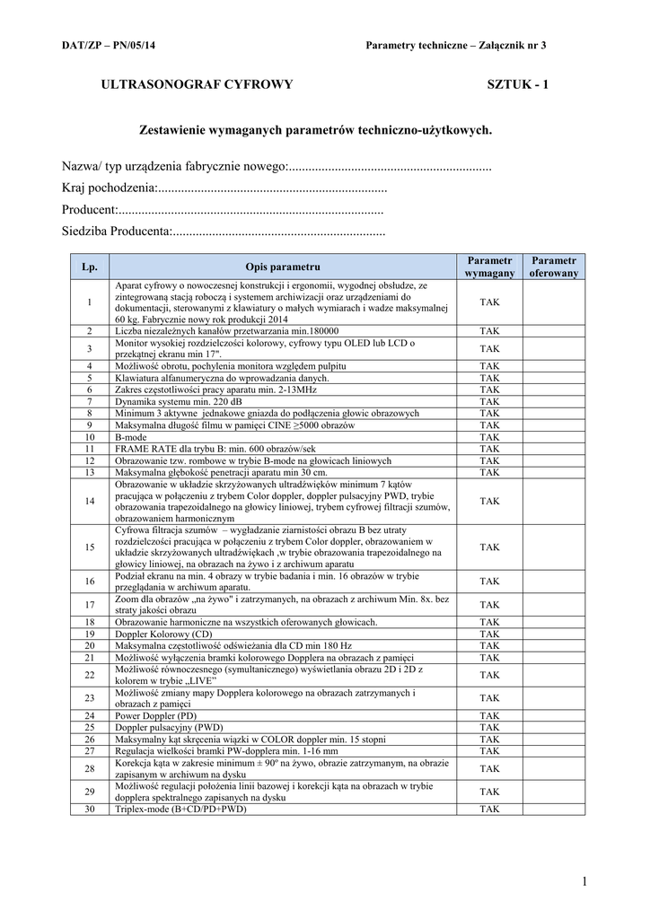 DAT/ZP – PN/05/14 Parametry techniczne – Załącznik nr 3 ULTRASONOGRAF CYFROWY SZTUK - 1 Zestawienie wymaganych parametrów techniczno-użytkowych. Nazwa/ typ urządzenia fabrycznie nowego:.............................................................. Kraj pochodzenia:...................................................................... Producent:................................................................................. Siedziba Producenta:................................................................. Lp. 1 2 3 4 5 6 7 8 9 10 11 12 13 14 15 16 17 18 19 20 21 22 23 24 25 26 27 28 29 30 Opis parametru Aparat cyfrowy o nowoczesnej konstrukcji i ergonomii, wygodnej obsłudze, ze zintegrowaną stacją roboczą i systemem archiwizacji oraz urządzeniami do dokumentacji, sterowanymi z klawiatury o małych wymiarach i wadze maksymalnej 60 kg. Fabrycznie nowy rok produkcji 2014 Liczba niezależnych kanałów przetwarzania min.180000 Monitor wysokiej rozdzielczości kolorowy, cyfrowy typu OLED lub LCD o przekątnej ekranu min 17". Możliwość obrotu, pochylenia monitora względem pulpitu Klawiatura alfanumeryczna do wprowadzania danych. Zakres częstotliwości pracy aparatu min. 2-13MHz Dynamika systemu min. 220 dB Minimum 3 aktywne jednakowe gniazda do podłączenia głowic obrazowych Maksymalna długość filmu w pamięci CINE ≥5000 obrazów B-mode FRAME RATE dla trybu B: min. 600 obrazów/sek Obrazowanie tzw. rombowe w trybie B-mode na głowicach liniowych Maksymalna głębokość penetracji aparatu min 30 cm. Obrazowanie w układzie skrzyżowanych ultradźwięków minimum 7 kątów pracująca w połączeniu z trybem Color doppler, doppler pulsacyjny PWD, trybie obrazowania trapezoidalnego na głowicy liniowej, trybem cyfrowej filtracji szumów, obrazowaniem harmonicznym Cyfrowa filtracja szumów – wygładzanie ziarnistości obrazu B bez utraty rozdzielczości pracująca w połączeniu z trybem Color doppler, obrazowaniem w układzie skrzyżowanych ultradźwiękach ,w trybie obrazowania trapezoidalnego na głowicy liniowej, na obrazach na żywo i z archiwum aparatu Podział ekranu na min. 4 obrazy w trybie badania i min. 16 obrazów w trybie przeglądania w archiwum aparatu. Zoom dla obrazów „na żywo" i zatrzymanych, na obrazach z archiwum Min. 8x. bez straty jakości obrazu Obrazowanie harmoniczne na wszystkich oferowanych głowicach. Doppler Kolorowy (CD) Maksymalna częstotliwość odświeżania dla CD min 180 Hz Możliwość wyłączenia bramki kolorowego Dopplera na obrazach z pamięci Możliwość równoczesnego (symultanicznego) wyświetlania obrazu 2D i 2D z kolorem w trybie „LIVE” Możliwość zmiany mapy Dopplera kolorowego na obrazach zatrzymanych i obrazach z pamięci Power Doppler (PD) Doppler pulsacyjny (PWD) Maksymalny kąt skręcenia wiązki w COLOR doppler min. 15 stopni Regulacja wielkości bramki PW-dopplera min. 1-16 mm Korekcja kąta w zakresie minimum ± 90º na żywo, obrazie zatrzymanym, na obrazie zapisanym w archiwum na dysku Możliwość regulacji położenia linii bazowej i korekcji kąta na obrazach w trybie dopplera spektralnego zapisanych na dysku Triplex-mode (B+CD/PD+PWD) Parametr wymagany Parametr oferowany TAK TAK TAK TAK TAK TAK TAK TAK TAK TAK TAK TAK TAK TAK TAK TAK TAK TAK TAK TAK TAK TAK TAK TAK TAK TAK TAK TAK TAK TAK 1 DAT/ZP – PN/05/14 31 32 33 34 35 36 37 38 39 40 41 42 43 44 45 46 47 48 49 50 51 Parametry techniczne – Załącznik nr 3 Oprogramowanie do badań: położniczych ginekologicznych małych narządów; naczyniowych ; mięśniowo-szkieletowych ; brzusznych; kardiologicznych Raporty do wszystkich wymienionych typów badań z możliwością redagowania przez użytkownika. Minimum wstawianie własnego loga, gotowych komentarzy . Głowica elektroniczna convex , szerokopasmowa, ze zmianą częstotliwości pracy, Zakres częstotliwości obrazowania min. 2,0 – 5,0 MHz Ilość elementów: minimum 128 kryształy Kąt obrazowania w trybie B minimum 55º Głębokość obrazowania minimum 30 cm Obrazowanie w trybie krzyżujących się ultradźwięków (compounding) Głowica elektroniczna endowaginalna ze zmienną częstotliwością Zakres częstotliwości obrazowania min.5,0 – 10,0 MHz Ilość elementów: minimum 128 kryształy Kąt obrazowania w trybie B minimum 125º Obrazowanie w trybie krzyżujących się ultradźwięków (compounding) Videoprinter czarno-biały małego formatu Możliwość podłączenia bezpośrednio do aparatu drukarki kolorowej laserowej do wydruku raportów i obrazów Zapis obrazów na płytach DVD, PEN DRIVE w formatach: jpeg, avi , DICOM. System automatycznie dogrywający do płyty, pamięci pendrive przeglądarkę umożliwiającą odtworzenie na komputerach PC bez konieczności instalowania specjalizowanego programu Możliwość zapisu obrazów na pamięci USB PenDrive w formatach avi i jpeg. DICOM, RAW DICOM. Minimum 2 gniazda USB z przodu aparatu. Gniazdo na dodatkowy monitor w standardzie vga, s-video, composite Wbudowany dysk twardy HDD przeznaczony na archiwizację danych pacjentów, raportów i obrazów >200 GB i wbudowanym napędzie DVD-R/RW Możliwość wykonania funkcji przetwarzania obrazów zatrzymanych i pętli obrazowych oraz obrazów i pętli zarchiwizowanych – minimum : • B/M-Mode Regulacja wzmocnienie 2D gain Regulacja wzmocnienia strefowego suwaków TGC Automatyczna Optymalizacja Powiększenie obrazu x 8 Mapy szarości Koloryzacja Skala osi czasu dla M-Mode • PW-Mode Wzmocnienie Przesuniecie linii bazowej Korekcja kąta Inwersja spektrum Format wyświetlania Automatyczne kalkulacje Modyfikacja obliczeń Czułość obrysu spektrum dopplerowskiego • Color Flow Mode - Przesunięcie Linii bazowej - Zmiana mapy koloru - obrócenie invert - Próg przejścia do analizy koloru Możliwość rozbudowy na dzień składania ofert o: Głowicę convex wolumetryczną do obrazowania: 2D, 3D i 3D w czasie rzeczywistym. Zakres częstotliwości min. 2,0- 6,0 MHz Możliwość rozbudowy