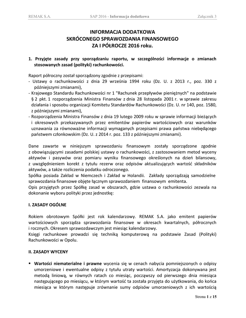 REMAK S.A. SAP 2016 - Informacja dodatkowa Załącznik 3 INFORMACJA DODATKOWA SKRÓCONEGO SPRAWOZDANIA FINANSOWEGO ZA I PÓŁROCZE 2016 roku. 1. Przyjęte zasady przy sporządzaniu raportu, w szczególności informacje o zmianach stosowanych zasad (polityki) rachunkowości. Raport półroczny został sporządzony zgodnie z przepisami: - Ustawy o rachunkowości z dnia 29 września 1994 roku (Dz. U. z 2013 r., poz. 330 z późniejszymi zmianami), - Krajowego Standardu Rachunkowości nr 1 "Rachunek przepływów pieniężnych" na podstawie § 2 pkt. 1 rozporządzenia Ministra Finansów z dnia 28 listopada 2001 r. w sprawie zakresu działania i sposobu organizacji Komitetu Standardów Rachunkowości (Dz. U. nr 140, poz. 1580, z późniejszymi zmianami), - Rozporządzenia Ministra Finansów z dnia 19 lutego 2009 roku w sprawie informacji bieżących i okresowych przekazywanych przez emitentów papierów wartościowych oraz warunków uznawania za równoważne informacji wymaganych przepisami prawa państwa niebędącego państwem członkowskim (Dz. U. z 2014 r. poz. 133 z późniejszymi zmianami). Dane zawarte w niniejszym sprawozdaniu finansowym zostały sporządzone zgodnie z obowiązującymi zasadami polskiej ustawy o rachunkowości, z zastosowaniem metod wyceny aktywów i pasywów oraz pomiaru wyniku finansowego określonych na dzień bilansowy, z uwzględnieniem korekt z tytułu rezerw oraz odpisów aktualizujących wartość składników aktywów, a także rozliczenia podatku odroczonego. Spółka posiada Zakład w Niemczech i Zakład w Holandii. Zakłady sporządzają samodzielne sprawozdania finansowe objęte łącznym sprawozdaniem finansowym emitenta. Opis przyjętych przez Spółkę zasad w obszarach, gdzie ustawa o rachunkowości zezwala na dokonanie wyboru polityki przez jednostkę: I. ZASADY OGÓLNE Rokiem obrotowym Spółki jest rok kalendarzowy. REMAK S.A. jako emitent papierów wartościowych sporządza sprawozdania finansowe w okresach kwartalnych, półrocznych i rocznych. Okresem sprawozdawczym jest miesiąc kalendarzowy. Księgi rachunkowe prowadzi się techniką komputerową na podstawie Zasad (Polityki) Rachunkowości w Opolu. II. ZASADY WYCENY Wartości niematerialne i prawne wycenia się w cenach nabycia pomniejszonych o odpisy umorzeniowe i ewentualne odpisy z tytułu utraty wartości. Amortyzacja dokonywana jest metodą liniową, w równych ratach co miesiąc, począwszy od pierwszego dnia miesiąca następującego po miesiącu, w którym wartość ta została przyjęta do użytkowania, do końca miesiąca w którym następuje zrównanie sumy odpisów umorzeniowych z ich wartością Strona 1 z 15 REMAK S.A. SAP 2016 - Informacja dodatkowa Załącznik 3 początkową lub w którym postawiono je w stan likwidacji, zbyto lub stwierdzono niedobór. Wartości niematerialne wycenia się oraz dokonuje odpisów stosując postanowienia art.31 ust.2 oraz art.32 ust.1-4 i ust 6 ustawy o rachunkowości. Środki trwałe wycenia się w cenach nabycia pomniejszonych o dokonane odpisy umorzeniowe i ewentualne odpisy z tytułu utraty wartości. Środki trwale amortyzuje się metodą liniową począwszy od pierwszego dnia miesiąca następującego po miesiącu, w którym nastąpiło przyjęcie środka trwałego do użytkowania do końca miesiąca, w którym następuje zrównanie odpisów umorzeniowych z wartością początkową środka trwałego lub miesiąca przeznaczenia go do sprzedaży, likwidacji bądź stwierdzenia niedoboru. Ustalając okres i stawkę amortyzacji stosuje się postanowienia art.32 ustawy o rachunkowości. W przypadku prawa wieczystego użytkowania gruntu ujawnionego w księgach, za cenę nabycia uważa się wartość prawa określoną przez rzeczoznawcę majątkowego. Prawo wieczystego użytkowania gruntów będzie umarzane w okresie 20 lat. Środki trwale w budowie wycenia się w wysokości kosztów poniesionych na nabycie lub wytworzenie środków trwałych lub wartości niematerialnych i prawnych, które powstaną w wyniku zakończenia budowy Długoterminowe aktywa finansowe wycenia się w cenach nabycia pomniejszonych o odpisy z tytułu trwałej utraty wartości. W przypadku zbywania akcji, udziałów lub innych aktywów zaliczanych do długoterminowych aktywów stosuje się zasadę „pierwsze przyszłopierwsze wyszło” (FIFO). Długoterminowe rozliczenia międzyokresowe stanowią aktywa z tytułu odroczonego podatku dochodowego. Aktywa z tytułu odroczonego podatku dochodowego ustala się w wysokości kwoty przewidzianej w przyszłości do odliczenia od podatku dochodowego w związku z występującymi ujemnymi różnicami przejściowymi, z uwzględnieniem zasady ostrożności. Zapasy rzeczowych składników aktywów obrotowych wycenia się według cen nabycia lub kosztów wytworzenia nie wyższych od ich cen sprzedaży netto na dzień bilansowy. Spółka stosuje zasadę odpisywania w koszty wartości materiałów na dzień ich zakupu. Ustalenie stanu tych składników aktywów i ich wycena oraz korekta kosztów o wartość materiałów niezużytych następuje na koniec każdego kwartału roku obrotowego. Wycena następuje przy zachowaniu metody FIFO. Należności krótkoterminowe wykazuje się w kwocie wymaganej zapłaty z zachowaniem zasady ostrożności. Wartość należności aktualizuje się uwzględniając stopień prawdopodobieństwa ich zapłaty poprzez dokonanie odpisu aktualizującego. Należności w walutach obcych wycenia się zgodnie z art. 30 ustawy o rachunkowości. Inwestycje krótkoterminowe: - Krótkoterminowe aktywa finansowe w postaci akcji, udziałów i innych papierów wartościowych wycenia się w cenie nabycia nie wyższej niż cena rynkowa na dzień bilansowy. W przypadku zbywania akcji, udziałów lub innych papierów przeznaczonych do obrotu stosuje się zasadę „pierwsze przyszło - pierwsze wyszło” (FIFO). - Instrumenty finansowe pochodne zabezpieczające wprowadza się do ksiąg rachunkowych na dzień zawarcia kontraktu w 