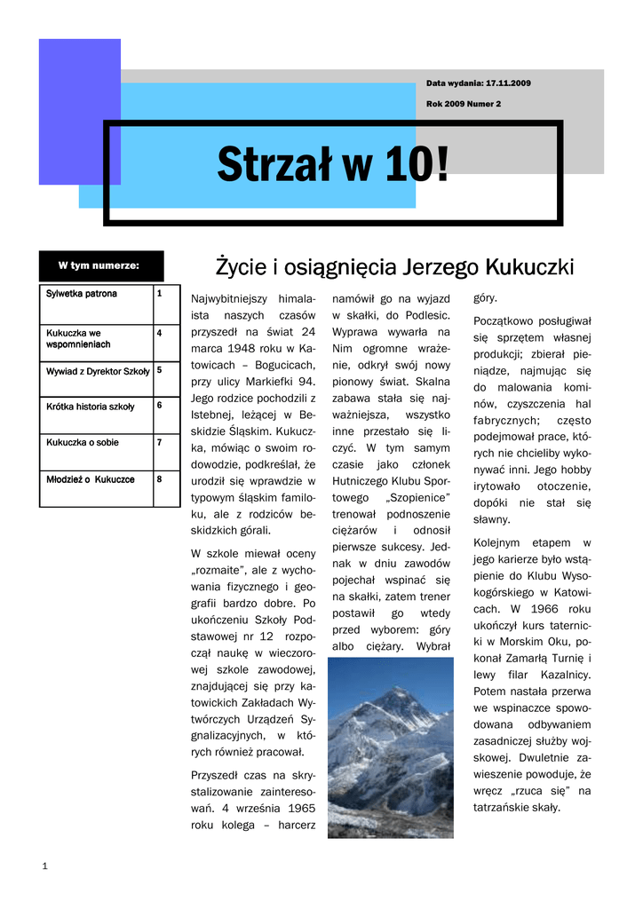 Data wydania: 17.11.2009 Rok 2009 Numer 2 Strzał w 10! Życie i osiągnięcia Jerzego Kukuczki W tym numerze: Sylwetka patrona 1 Kukuczka we wspomnieniach 4 Wywiad z Dyrektor Szkoły 5 Krótka historia szkoły 6 Kukuczka o sobie 7 Młodzież o Kukuczce 8 Najwybitniejszy himalaista naszych czasów przyszedł na świat 24 marca 1948 roku w Katowicach – Bogucicach, przy ulicy Markiefki 94. Jego rodzice pochodzili z Istebnej, leżącej w Beskidzie Śląskim. Kukuczka, mówiąc o swoim rodowodzie, podkreślał, że urodził się wprawdzie w typowym śląskim familoku, ale z rodziców beskidzkich górali. W szkole miewał oceny „rozmaite”, ale z wychowania fizycznego i geografii bardzo dobre. Po ukończeniu Szkoły Podstawowej nr 12 rozpoczął naukę w wieczorowej szkole zawodowej, znajdującej się przy katowickich Zakładach Wytwórczych Urządzeń Sygnalizacyjnych, w których również pracował. Przyszedł czas na skrystalizowanie zainteresowań. 4 września 1965 roku kolega – harcerz 1 namówił go na wyjazd w skałki, do Podlesic. Wyprawa wywarła na Nim ogromne wrażenie, odkrył swój nowy pionowy świat. Skalna zabawa stała się najważniejsza, wszystko inne przestało się liczyć. W tym samym czasie jako członek Hutniczego Klubu Sportowego „Szopienice” trenował podnoszenie ciężarów i odnosił pierwsze sukcesy. Jednak w dniu zawodów pojechał wspinać się na skałki, zatem trener postawił go wtedy przed wyborem: góry albo ciężary. Wybrał góry. Początkowo posługiwał się sprzętem własnej produkcji; zbierał pieniądze, najmując się do malowania kominów, czyszczenia hal fabrycznych; często podejmował prace, których nie chcieliby wykonywać inni. Jego hobby irytowało otoczenie, dopóki nie stał się sławny. Kolejnym etapem w jego karierze było wstąpienie do Klubu Wysokogórskiego w Katowicach. W 1966 roku ukończył kurs taternicki w Morskim Oku, pokonał Zamarłą Turnię i lewy filar Kazalnicy. Potem nastała przerwa we wspinaczce spowodowana odbywaniem zasadniczej służby wojskowej. Dwuletnie zawieszenie powoduje, że wręcz „rzuca się” na tatrzańskie skały. Str. 2 Życie i osiągnięcia Jerzego Kukuczki Bierze udział w pierwszym zimowym przejściu drogi zwanej „Kurtykówką”. W 1971 roku tragicznie ginie w Tatrach wspinaczkowy partner – Piotr Skorupa. oczne Studium Trenerów Alpinizmu. Jego praca dyplomowa nosiła tytuł „Działalność alpinistyczna w subarktycznych Górach Alaska i Górach Świętego Eliasza”. Kolejna zima przynosi kolejne sukcesy. Władze Klubu Wysokogórskiego doceniły osiągnięcia i wytypowały Kukuczkę do uczestniczenia w obozie sportowym w Dolomitach, w których wraz z kolegami poprowadził nową drogę na Torre Trieste. Włosi nazwali ją „diretissima delli Polacci”. Cały zespół został odznaczony za tę wspinaczkę brązowym medalem. Wyprawa w 1976 roku w Hindukusz tak zaabsorbowała Kukuczkę, że zakład jego pracy postanowił dać mu wypowiedzenie. Wyjazd okazał się pechowy, gdyż choroba uniemożliwiła mu udział w atakowaniu Kohe Tez (7015 m), a gdy się wyleczył, koledzy już schodzili ze szczytu. Jego determinacja sprawiła, że wejście powtórzono i tym samym osiągnął rekord wysokości. Od tej pory droga była tylko jedna, jeszcze wyżej. Pierwsza himalajska wyprawa zakończyła się porażką, na Nanga Parbat nie zdołał wejść- z Marianem Piekutowskim osiągnął wówczas wysokość 7950 m, ale dwa lata później zdobył swój pierwszy ośmiotysięcznik – słynną Lhotse, czwartą górę ziemi (8511 m). Podczas jednej ze wypraw na Kukuczkę spadł wielki kamień, mimo poważnego stanu nie przerwał wspinaczki. Po zejściu w doliny spędził sześć dni w szpitalu w Argodo. Lekarze nakazali mu powrót do domu. Kukuczka wrócił, ale do kolegów i wspinania. W 1973 roku wyjechał po raz pierwszy w góry lodowcowe i poprowadził nową drogę na Petit Dru. W następnym roku wyjechał w góry Ameryki Północnej. Tutaj bardzo poważnie się odmroził i zapadł na chorobę wysokościową. Dwa lata później, w 1975 roku, zawarł związek małżeński z Cecylią Ogrodzińską. W podróż poślubną pojechał w Alpy, żona na Mazury. W tym czasie ukończył za- 2 W pamiętnej wyprawie na Everest w 1980 roku nie wziął udziału, ponieważ żona spodziewała się dziecka. Jednak dołączył do kolegów, którzy atakowali szczyt wiosną tego roku. Wspiął się południowym filarem, a we wspinaczce towarzyszył mu Andrzej Czok. W kolejnych trzech latach ilość zdobytych ośmiotysięczników rosła. W 1981 roku zdobył samotnie Makalu (8463 m), a 1982 roku Broad Peak (8047 m), który pokonał z Wojciechem Kurtyką. W kolejnym roku zdobył dwa ośmiotysięczniki – Gasherbrumy I (8068 m) i II (8035 m). Oba szczyty zdobywał z Wojciechem Kurtyką, z którym spędzał dużo czasu. Podczas jednej z rozmów pochwycił pomysł Messnera, aby wejść na wszystkie szczyty powyżej 8000 metrów. W 1985 roku osiągnął Dhaulagiri (8167 m), Cho Oyu (8153 m) i Nanga Parbat (8125 m). W 1986 roku Kukuczka trzy razy pojawił się w Himalajach i Karakorum, w domu był gościem, spędzającym kilka dnia przed kolejną wyprawą. Najpierw wszedł na Kangchenjungę (8598 m), potem w lipcu na K2 w Karakorum i w końcu cztery miesiące później na Manaslu. Str. 3 Życie i osiągnięcia Jerzego Kukuczki Na swoim koncie miał już dwanaście ośmiotysięczników, a Reinhold Messner, wchodząc na Lhotse, zdobył właśnie swój czternasty ośmiotysięcznik. Pozostały do zdobycia Annapurna i Shisha Pangma. Na pierwszy szczyt, niezdobyty jeszcze przez Polaków, udał się zimą 1987 roku. Już od początku wyprawa napotkała na trudności. Z powodu niedopełnienia formalności cofnięto zezwolenie na atakowanie szczytu. Po wielu zabiegach udało się zdobyć nowe pozwolenie. W tym czasie niektóre wyprawy wracały już z zimowych ekspedycji. Ostatecznie szczyt osiągnął Kukuczka razem z Arturem 