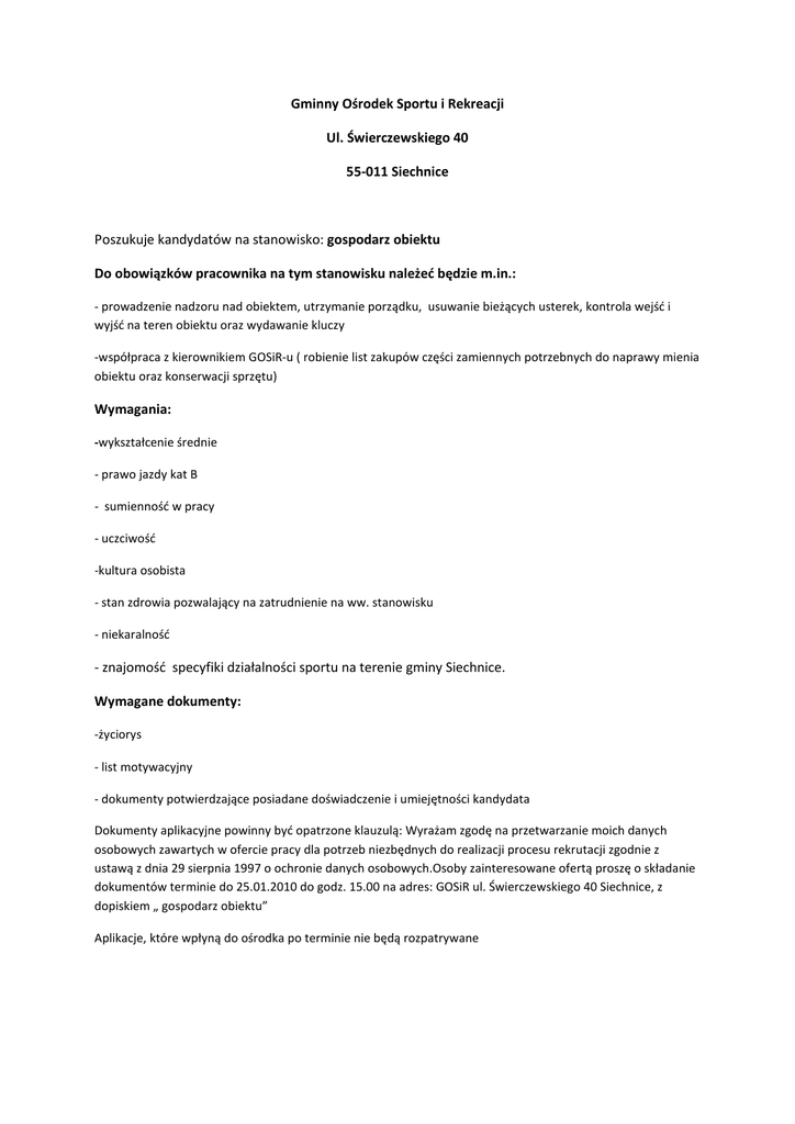 Gminny Ośrodek Sportu i Rekreacji Ul. Świerczewskiego 40 55-011 Siechnice Poszukuje kandydatów na stanowisko: gospodarz obiektu Do obowiązków pracownika na tym stanowisku należeć będzie m.in.: - prowadzenie nadzoru nad obiektem, utrzymanie porządku, usuwanie bieżących usterek, kontrola wejść i wyjść na teren obiektu oraz wydawanie kluczy -współpraca z kierownikiem GOSiR-u ( robienie list zakupów części zamiennych potrzebnych do naprawy mienia obiektu oraz konserwacji sprzętu) Wymagania: -wykształcenie średnie - prawo jazdy kat B - sumienność w pracy - uczciwość -kultura osobista - stan zdrowia pozwalający na zatrudnienie na ww. stanowisku - niekaralność - znajomość specyfiki działalności sportu na terenie gminy Siechnice. Wymagane dokumenty: -życiorys - list motywacyjny - dokumenty potwierdzające posiadane doświadczenie i umiejętności kandydata Dokumenty aplikacyjne powinny być opatrzone klauzulą: Wyrażam zgodę na przetwarzanie moich danych osobowych zawartych w ofercie pracy dla potrzeb niezbędnych do realizacji procesu rekrutacji zgodnie z ustawą z dnia 29 sierpnia 1997 o ochronie danych osobowych.Osoby zainteresowane ofertą proszę o składanie dokumentów terminie do 25.01.2010 do godz. 15.00 na adres: GOSiR ul. Świerczewskiego 40 Siechnice, z dopiskiem „ gospodarz obiektu” Aplikacje, które wpłyną do ośrodka po terminie nie będą rozpatrywane