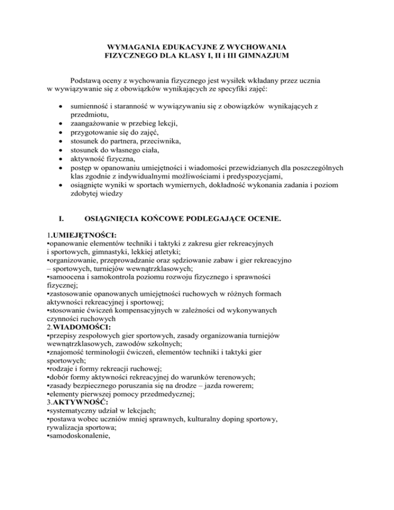 WYMAGANIA EDUKACYJNE Z WYCHOWANIA FIZYCZNEGO DLA KLASY I, II i III GIMNAZJUM Podstawą oceny z wychowania fizycznego jest wysiłek wkładany przez ucznia w wywiązywanie się z obowiązków wynikających ze specyfiki zajęć: I. sumienność i staranność w wywiązywaniu się z obowiązków wynikających z przedmiotu, zaangażowanie w przebieg lekcji, przygotowanie się do zajęć, stosunek do partnera, przeciwnika, stosunek do własnego ciała, aktywność fizyczna, postęp w opanowaniu umiejętności i wiadomości przewidzianych dla poszczególnych klas zgodnie z indywidualnymi możliwościami i predyspozycjami, osiągnięte wyniki w sportach wymiernych, dokładność wykonania zadania i poziom zdobytej wiedzy OSIĄGNIĘCIA KOŃCOWE PODLEGAJĄCE OCENIE. 1.UMIEJĘTNOŚCI: ▪opanowanie elementów techniki i taktyki z zakresu gier rekreacyjnych i sportowych, gimnastyki, lekkiej atletyki; ▪organizowanie, przeprowadzanie oraz sędziowanie zabaw i gier rekreacyjno – sportowych, turniejów wewnątrzklasowych; ▪samoocena i samokontrola poziomu rozwoju fizycznego i sprawności fizycznej; ▪zastosowanie opanowanych umiejętności ruchowych w różnych formach aktywności rekreacyjnej i sportowej; ▪stosowanie ćwiczeń kompensacyjnych w zależności od wykonywanych czynności ruchowych 2.WIADOMOŚCI: ▪przepisy zespołowych gier sportowych, zasady organizowania turniejów wewnątrzklasowych, zawodów szkolnych; ▪znajomość terminologii ćwiczeń, elementów techniki i taktyki gier sportowych; ▪rodzaje i formy rekreacji ruchowej; ▪dobór formy aktywności rekreacyjnej do warunków terenowych; ▪zasady bezpiecznego poruszania się na drodze – jazda rowerem; ▪elementy pierwszej pomocy przedmedycznej; 3.AKTYWNOŚĆ: ▪systematyczny udział w lekcjach; ▪postawa wobec uczniów mniej sprawnych, kulturalny doping sportowy, rywalizacja sportowa; ▪samodoskonalenie, II. KRYTERIA OCENIANIA OCENA CELUJĄCA: uczeń spełnia wszystkie wymagania na ocenę bdb (5); aktywnie uczestniczy w życiu sportowym na terenie szkoły, bądź tez w innych formach działalności związanych z kulturą fizyczną; zajmuje punktowane miejsca w zawodach powiatowych, rejonowych, wojewódzkich, posiada klasę sportową; OCENA BARDZO DOBRA: uczeń całkowicie opanował materiał programowy; jest bardzo sprawny fizycznie; ćwiczenia wykonuje z właściwą techniką, pewnie, w odpowiednim tempie i dokładnie. Zna założenia taktyczne i przepisy dyscyplin sportowych zawartych w programie; posiada duże wiadomości w zakresie kultury fizycznej i umiejętnie wykorzystuje je w praktycznym działaniu; systematycznie doskonali swoja sprawność motoryczną i wykazuje duże postępy w osobistym usprawnianiu; jego postawa społeczna, zaangażowanie i stosunek do wychowania fizycznego nie budzą najmniejszych zastrzeżeń; bierze aktywny udział w zajęciach pozalekcyjnych, zawodach sportowych, nie jest to jednak działalność systematyczna. OCENA DOBRA: uczeń w zasadzie opanował materiał programowy; dysponuje dobrą sprawnością motoryczną; ćwiczenia wykonuje prawidłowo, lecz nie dość dokładnie z małymi błędami technicznymi; posiadane wiadomości potrafi wykorzystać w praktyce przy pomocy nauczyciela; nie potrzebuje większych bodźców do pracy nad osobistym usprawnianiem, wykazuje stałe i dość dobre postępy w tym zakresie; jego postawa społeczna i stosunek do kultury fizycznej nie budzi większych zastrzeżeń; nie bierze udział u w zajęciach pozalekcyjnych. OCENA DOSTATECZNA: uczeń opanował materiał programowy na przeciętnym poziomie ze znacznymi lukami; dysponuje przeciętna sprawnością fizyczną; ćwiczenia wykonuje niepewnie, w nieodpowiednim tempie i z większymi błędami technicznymi; w jego wiadomościach z zakresu kultury fizycznej są znaczne luki, a tych które ma nie potrafi wykorzystać w praktyce; wykazuje małe postępy w usprawnianiu; przejawia pewne braki w zakresie wychowania społecznego, w postawie i stosunku do kultury fizycznej; OCENA DOPUSZCZAJĄCA: uczeń nie opanował materiału programowego w stopniu dostatecznym i ma poważne luki; jest mało sprawny fizycznie; ćwiczenia wykonuje niechętnie i z dużymi błędami technicznymi; posiada małe wiadomości z zakresu kultury fizycznej, nie potrafi wykonać prostych zadań związanych z samooceną; nie jest pilny i wykazuje bardzo małe postępy w usprawnianiu; na lekcjach wychowania fizycznego przejawia braki w zakresie wychowania społecznego, ma niechętny stosunek do ćwiczeń. OCENA NIEDOSTATECZNA: uczeń jest daleki od spełniania wymagań stawianych przez program nauczania; posiada bardzo niska sprawność fizyczną; wykonuje jedynie najprostsze ćwiczenia i w dodatku z rażącymi błędami; nie posiada żadnej wiedzy w zakresie kultury fizycznej; ma lekceważący stosunek do zajęć nie wykazuje żadnych postępów w usprawnianiu; na zajęciach wychowania fizycznego wykazuje duże i rażące braki w zakresie wychowania społecznego. III. ZWOLNIENIA Z WYCHOWANIA FIZYCZNEGO. uczeń posiadający zwolnienie lekarskie z wychowania fizycznego (jeśli nie jest zwolniony z zajęć decyzją Dyrektora Szkoły) ma obowiązek przebywać ze swoją grupą na zajęciach wychowania fizycznego; respektowane są zwolnienia napisane i podpisane osobiście przez rodzica dotyczące ważnych powodów, dla których uczeń (uczennica) nie może aktywnie uczestniczyć w lekcji i nie dłuższe niż na tydzień; uczennica w okresie niedyspozycji fizycznej powinna być przygotowana do lekcji wychowania fizycznego tak samo jak przy pełnej dyspozycji, tzn.: jest przebrana w strój sportowy, lecz bierze ograniczony udział w zajęciach ( nie wykonuje ćwiczeń „ciężkich”: biegi długie, skoki, dźwiganie itp.). W szczególnych przypadkach może nie uczestniczyć aktywnie w lekcji.