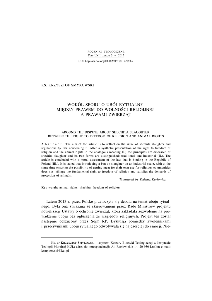 ROCZNIKI TEOLOGICZNE Tom LXII, zeszyt 3 − 2015 DOI: http://dx.doi.org/10.18290/rt.2015.62.3-7 KS. KRZYSZTOF SMYKOWSKI WOKÓŁ SPORU O UBÓJ RYTUALNY. MIE˛ DZY PRAWEM DO WOLNOŚCI RELIGIJNEJ A PRAWAMI ZWIERZAT ˛ AROUND THE DISPUTE ABOUT SHECHITA SLAUGHTER. BETWEEN THE RIGHT TO FREEDOM OF RELIGION AND ANIMAL RIGHTS A b s t r a c t. The aim of the article is to reflect on the issue of shechita slaughter and regulations by law concerning it. After a synthetic presentation of the right to freedom of religion and the animal rights in the analogous meaning (I.) the principles are discussed of shechita slaughter and its two forms are distinguished: traditional and industrial (II.). The article is concluded with a moral assessment of the law that is binding in the Republic of Poland (III.). It is stated that introducing a ban on slaughter on an industrial scale, with at the same time ensuring the possibility of getting meat for their own use for religious communities does not infringe the fundamental right to freedom of religion and satisfies the demands of protection of animals. Translated by Tadeusz Karłowicz Key words: animal rights, shechita, freedom of religion. Latem 2013 r. przez Polske˛ przetoczyła sie˛ debata na temat uboju rytualnego. Była ona zwiazana ˛ ze skierowaniem przez Rade˛ Ministrów projektu nowelizacji Ustawy o ochronie zwierzat, ˛ która zakładała zezwolenie na prowadzenie uboju bez ogłuszenia ze wzgle˛ dów religijnych. Projekt ten został naste˛ pnie odrzucony przez Sejm RP. Dyskusja pomie˛ dzy zwolennikami i przeciwnikami uboju rytualnego odwoływała sie˛ najcze˛ ściej do emocji. Nie- Ks. dr KRZYSZTOF SMYKOWSKI – asystent Katedry Bioetyki Teologicznej w Instytucie Teologii Moralnej KUL; adres do korespondencji: Al. Racławickie 14, 20-950 Lublin; e-mail: [email protected] 120 KS. KRZYSZTOF SMYKOWSKI wiele pojawiło sie˛ w niej argumentów merytorycznych. Warto zatem w sposób metodologicznie uporzadkowany ˛ przyjrzeć sie˛ etycznym aspektom tego zagadnienia i wyprowadzić konkretne wskazania jego dotyczace. ˛ Na wste˛ pie należy wspomnieć, że nie jest to pierwsza odsłona sporu dotyczacego ˛ uboju rytualnego. Jego korzeni należy szukać na poczatku ˛ XX w. na terenach znajdujacych ˛ sie˛ pod panowaniem Cesarstwa Austro-We˛ gierskiego. Odżył on naste˛ pnie w Polsce mie˛ dzywojennej. Jego owocem były zabiegi licznych środowisk zmierzajace ˛ do prawnego zakazu prowadzenia uboju ry1 tualnego . Były one skutkiem silnych nastrojów antysemickich, które zostały spote˛ gowane przez fakt opanowania przez środowiska żydowskie znacznej cze˛ ści rynku, co miało wpływ na rosnace ˛ ceny mie˛ sa i przetworów mie˛ snych2. Od każdej bowiem sztuki poddanej ubojowi wynagrodzenie pobierał nie tylko rzezak. Odprowadzany był także swego rodzaju podatek na rzecz gmin żydowskich, który stanowił jedno z podstawowych źródeł ich dochodu3. Współczesne żadania ˛ wprowadzenia ograniczeń w zakresie tego rodzaju uboju sa˛ motywowane raczej troska˛ o zwierze˛ ta rzeźne i wrażliwościa˛ na ich los. Stanowia˛ także ponadto przejaw sprzeciwu wobec uboju dokonywanego głównie dla celów komercyjnych4. I. PRAWO DO WOLNOŚCI RELIGIJNEJ A PRAWA ZWIERZAT ˛ W dyskusji na temat uboju rytualnego pojawiało sie˛ cze˛ sto stwierdzenie, iż w tym przypadku ma miejsce kolizja prawa do wolności religijnej i praw zwierzat. ˛ W tym kontekście należy syntetycznie przyjrzeć sie˛ tym dwóm zagadnieniom, by w ich świetle ocenić już samo zagadnienie uboju rytualnego. Prawo do wolności w sferze życia religijnego jest obecnie uznawane za jedno z podstawowych uprawnień każdego człowieka. Jest ono potwierdzone 1 Por. A. DZIADZIO. Zakaz uboju rytualnego jako naruszenie konstytucyjnej zasady wolności religijnej. Kontekst współczesny i historyczny. „Forum Prawnicze” 2014 nr 1 s. 7-8. 2 Por. S. TRZECIAK. Ubój rytualny w świetle Biblji i Talmudu. Warszawa: Salezjańska Szkoła Rzemiosł 1935 s. 38-46. 3 Por. W. WIERZBIENIEC. Problem uboju rytualnego na terenie Galicji Wschodniej w świetle „Instrukcji dla rzezaków izraelickiej gminy wyznaniowej w Przemyślu” z dnia 22 września 1908 roku. „Prace Historyczno-Archiwalne” 14:2004 s. 163. 4 Por. A. DZIADZIO. Zakaz s. 8; M. STARNAWSKI. Biedni Polacy patrza˛ na ubój rytualny. „Bez Dogmatu” 2013 nr 3 s. 1. WOKÓŁ SPORU O UBÓJ RYTUALNY 121 przez niemal wszystkie najważniejsze akty prawne o zasie˛ gu zarówno mie˛ dzynarodowym5, jak i krajowym6. Do poszanowania wolności wyznania wielokrotnie wzywał także Kościół katolicki w swoich licznych wypowiedziach. Wśród nich na szczególna˛ uwage˛ zasługuje nauczanie Soboru Watykańskiego II. Deklaracja o wolności religijnej Dignitatis humanae stwierdza w sposób wyraźny, że prawo to ma podwójne źródło. Wszyscy ludzie z racji swojej osobowej godności, której przejawem jest rozum, wolna wola oraz zdolność ponoszenia odpowiedzialności, sa˛ zobowiazani ˛ do poszukiwania prawdy i trwania przy niej. Imperatyw ten odnosi sie˛ nade wszystko do sfery życia religijnego7. Nauka na temat wolności ma także swoje korzenie w Objawieniu. Człowiek jest bowiem powołany, by odpowiadać Stwórcy wiara˛ w sposób całkowicie wolny. Akt wiary ze swej istoty jest dobrowolny. Poucza o tym sam Chrystus Pan. Sobór przypomina Jego szacunek dla ludzkiej wolności przy wypełnianiu obowiazku ˛ uwierzenia Słowu Bożemu. Postawa Zbawiciela jest zaproszeniem dla chrześcijan, aby w tym samym duchu naśladowali swojego Mistrza8. Wszystkie religie staraja˛ sie˛ udzielić poszukujacemu ˛ prawdy człowiekowi odpowiedzi na najbardziej istotne nurtujace ˛ go pytania dotyczace ˛ sensu i celu życia, dobra i zła oraz sposobu osiagnie ˛ ˛ cia szcze˛ ścia. Z tego wie˛ c powodu Kościół katolicki ze szczerym szacunkiem odnosi sie˛ do wszystkich religii, mimo iż ich doktryna niejednokrotnie w sposób bardzo istotny róż