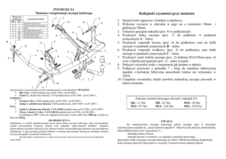 INSTRUKCJA Montażu i eksploatacji zaczepu kulowego Oznaczenie zacisku wg ISO PN 1 L 2 + 3 31 4 R 5 58R 6 54 7 58L B Łączenie przewodów 9 12 C 9 A 12 Kierunkowskazy lewe Tylne światła przeciwmgłowe Masa Kierunkowskazy prawe Światła pozycyjne prawe Światła hamowania Światła pozycyjne lewe Kolejność czynności przy montażu 12 9 8 8 A 8 5 8 12 A 8 4 A 8 C 8 1 6 17 3 2 B 7 1. Opuścić koło zapasowe i kolektor wydechowy. 2. Wykonać wycięcie w zderzaku w jego osi o szerokości 50mm i głębokości 50mm. 3. Umieścić specjalne nakrętki (poz. 9) w podłużnicach. 4. Przykręcić belkę zaczepu (poz. 1) do podłużnic w punktach oznaczonych A – luźno. 5. Przykręcić wspornik boczny (poz. 4) do podłużnicy oraz do belki zaczepu w punktach oznaczonych B – luźno. 6. Przykręcić wspornik środkowy (poz. 5) do podłużnicy oraz belki zaczepu w punktach oznaczonych C - luźno 7. Przykręcić część kulista zaczepu (poz. 2) śrubami M12x70mm (poz. 6) wraz z blachę pod gniazdo (poz. 3) – patrz rysunek. 8. Dokręcić wszystkie śruby z momentem jak podano w tabelce. 9. Podłączyć przewody z gniazdka 7 – bieg. do instalacji elektrycznej zgodnie z instrukcją fabryczną samochodu (zaleca się wykonanie w ASO). 10. Uzupełnić ewentualne ubytki powłoki malarskiej zaczepu powstałe w trakcie montażu. 11 Zaczep kulowy przeznaczony jest do zamontowania w samochodach: PEUGEOT 806, 5 drz., VAN produkowany od 06.1994 r. do 08.2002 r. Expert I, zabudowany blaszak, VAN produkowany od 02.1996 r. do 01.2007 r. CITROEN Evasion, 5 drz., VAN produkowany od 06.1994 r. do 08.2002 r. Jumpy I, zabudowany blaszak, VAN produkowany od 09.1994 r. do 01.2007 r. FIAT Scudo I, zabudowany blaszak, VAN (220P) produkowany od 02.1996 r. do 01.2007 r. Ulysse, Lancia Z, 5 drz., VAN (220/2) produkowany od 1994 r. do 08.2002 r. nr katalogowy R17 i służy do ciągnięcia przyczep o masie całkowitej 1800 kg i nacisku na kulę max 80 kg. OD PRODUCENTA Dziękujemy za wybór produkowanego przez naszą firmę zaczepu kulowego. Jego niezawodność została potwierdzona licznymi testami oraz opiniami zadowolonych klientów. Jednakże niezawodność zaczepów kulowych jest zależna również od prawidłowego montażu oraz prawidłowej eksploatacji. Z tego powodu prosimy Państwa o staranne przeczytanie niniejszej instrukcji montażu oraz przestrzeganie zawartych wskazówek. Zaczep należy zamontować w miejscach do tego celu przeznaczonych przez producenta samochodu. Zalecany moment skręcający dla śrub i nakrętek 8,8: M6 - 11 Nm M8 - 25 Nm M10 - 50 Nm M12 - 87 Nm M14 - 138 Nm M16 - 210 Nm UWAGA Po zamontowaniu zaczepu kulowego należy uzyskać wpis w dowodzie rejestracyjnym pojazdu na „stacji kontroli pojazdów” właściwej dla miejsca zamieszkania. Samochód powinien być wyposażony w : -kierunkowskazy boczne -lusterka boczne o rozstawie, co najmniej szerokości przyczepy. Sprawdzać śruby mocujące zaczepu kulowego po około 1000 km przebiegu eksploatacji. Kula zaczepu musi być utrzymana w czystości i konserwowana smarem stałym PPUH AUTO-HAK Sp.J. Wyposażenie zaczepu: Produkcja Zaczepów Kulowych Henryk & Zbigniew Nejman 76-200 SŁUPSK ul. Słoneczna 16K tel/fax (059) 8-414-414; 8-414-413 E-mail: [email protected] www.autohak.com.pl Zaczep kulowy bez wyposażenia elektrycznego Klasa: A50-X Nr kat. R17 KARTA GWARANCYJNA Producent udziela gwarancji niniejszą kartą gwarancyjną na okres 24 miesięcy licząc od dnia zakupu zaczepu kulowego do samochodów: PEUGEOT 806 i CITROEN EVASION produkowanych od 06.1994 r. do 08.2002 r. PEUGEOT EXPERT I i FIAT SCUDO produkowanych od 02.1996 r. do 01.2007 r. CITROEN JUMPY produkowany od 09.1994 r. do 01.2007 r. FIAT ULYSSE i LANCIA Z produkowanych od 1994r. do 08.2002r. Data produkcji .............................. Data zakupu...................................... Zakres gwarancji obejmuje wyłącznie wady jakościowe wynikające z winy producenta. Gwarancja nie obejmuje natomiast uszkodzeń zawinionych przez nabywcę, wynikających z niewłaściwego montażu, użytkowania lub konserwacji, uszkodzeń mechanicznych, normalnego zużycia podczas eksploatacji itp. Gwarancja udzielona na zakupiony towar nie wyłącza, nie ogranicza ani nie zawiesza uprawnień kupującego wynikających z niezgodności towaru z umową. Reklamacje należy zgłaszać w punkcie sprzedaży, składając jednocześnie kartę gwarancyjną. Usunięcie "wady" następuje po stwierdzeniu przez punkt sprzedaży wspólnie z producentem słuszności złożonej reklamacji. Reklamacja powinna być załatwiona w ciągu czternastu dni od dnia uznania reklamacji. Karta gwarancyjna jest nieważna jeżeli nie jest wypełniona i podpisana. Data zgłoszenia reklamacji: ................................................................... Przeznaczony do zamontowania w samochodach: PEUGEOT 806, 5 drz., VAN produkowany od 06.1994 r. do 08.2002 r. Expert I, zabudowany blaszak, VAN produkowany od 02.1996 r. do 01.2007 r. CITROEN Evasion, 5 drz., VAN produkowany od 06.1994 r. do 08.2002 r. Jumpy I, zabudowany blaszak, VAN produkowany od 09.1994 r. do 01.2007 r. FIAT Scudo I, zabudowany blaszak, VAN (220P) produkowany od 02.1996 r. do 01.2007 r. Ulysse, Lancia Z, 5 drz., VAN (220/2) produkowany od 1994 r. do 08.2002 r. Dane techniczne: Wartość siły D : 10,20 kN maksymalna masa przyczepy: 1800 kg maksymalny nacisk na kulę: 80 kg Numer homologacji zgodnie z wytycznymi regulaminu EKG/ONZ 55.01: E20-55R-01 1110 INFORMACJA WSTĘPNA Zaczep kulowy jest skonstruowany zgodnie z zasadami bezpieczeństwa ruchu drogowego. Zaczep kulowy jest elementem wpływającym na bezpieczeństwo jazdy i może zostać zainstalowany wyłącznie przez personel wyspecjalizowany. Niedopuszczalne jest dokonywanie jakichkolwiek zmian w konstrukcji zaczepu. Powoduje to wygaśniecie dopuszczenia do stosowania. W przypadku obecności masy izolacyjnej lub osłony podwozia w miejscu przylegania zaczepu, należy ją usunąć. Nieosłonięte 