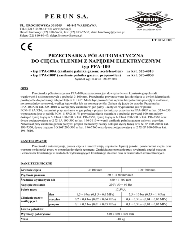 P E R U N S.A. UL. GROCHOWSKA 301/305 03-842 WARSZAWA Tel.: (22) 810-80-41÷46; www.perun.pl Dział Handlowy: (22) 810-56-39, fax: (22) 813-52-33; [email protected] Sklep: (22) 810-80-47; [email protected] UT 001-U:08 PRZECINARKA PÓŁAUTOMATYCZNA DO CIĘCIA TLENEM Z NAPĘDEM ELEKTRYCZNYM typ PPA-100 - typ PPA-100A (zasilanie palnika gazem: acetylen-tlen) nr kat. 525-4010 - typ PPA-100P (zasilanie palnika gazem: propan-tlen) nr kat. 525-4050 Symbol wg PKWiU 28.29.70.0 OPIS Przecinarka półautomatyczna PPA-100 przeznaczona jest do cięcia tlenem konstrukcyjnych stali węglowych i niskostopowych o grubości 3-100 mm. Przecinarka przystosowana jest do cięcia w dwóch kierunkach, prostopadle do podstawy lub pod kątem 0 ÷ 45°. Może być prowadzona ręcznie bezpośrednio po ciętym materiale, po prowadnicy szynowej, według kątownika lub za pomocą cyrkla. Zaleca się jazdę do przodu. Przecinarka PPA-100A nr kat. 525-4010 w wersji przy zasilaniu w gaz palny - acetylen wyposażona jest w palnik PCM-118A/X16, natomiast przy zasilaniu w gaz palny - propan techniczny przecinarka PPA-100P nr kat. 525-4050 wyposażona jest w palnik PCM-118P/X16. W przypadku cięcia materiału o grubości powyżej 100 mm należy dokupić dyszę tnącą nr 5 X16A 100-200 nr kat. 196-3550, dyszę tnącą nr 6 X16A 200-300 nr kat. 196-3560 oraz dyszę podgrzewającą nr 2 X16A 100-300 nr kat. 196-3610 w wersji zasilania palnika gazem palnym: acetylen. Natomiast przy zasilaniu gazem palnym: propan techniczny należy dokupić dyszę tnącą nr 5 X16P 100-200 nr kat. 196-7550, dyszę tnącą nr 6 X16P 200-300 nr kat. 196-7560 oraz dyszę podgrzewającą nr 2 X16P 100-300 nr kat. 196-7610. ZASTOSOWANIE Przecinarki automatyzują proces cięcia i umożliwiają uzyskanie lepszej jakości powierzchni cięcia oraz wzrostu wydajności pracy w stosunku do cięcia ręcznego. Znajdują zastosowanie przy wycinaniu części maszyn i elementów konstrukcji w zakładach wytwarzających konstrukcje stalowe oraz w warsztatach rzemieślniczych. DANE TECHNICZNE 3÷100 mm Grubość cięcia 100÷300 mm 80 ÷ 11 00 mm/min Prędkość posuwu Średnica wycinanych kół 650 ÷ 1 700 mm Napięcie zasilania 230V 50 ÷ 60 Hz 17,5VA Pobór mocy 1,5 ÷ 6 bar (0,1 5 ÷ 0,6 MPa) 5,5 ÷ 10 bar (0,55 ÷ 1 MPa) acetylen 0,2 ÷ 0,4 bar (0,02 ÷ 0,04 MPa) 0,4 ÷ 0,5 bar (0,04 ÷ 0,05 MPa) propan 0,1 ÷ 0,3 bar (0,01 ÷ 0,03 MPa) 0,1 ÷ 0,3 bar (0,01 ÷ 0,03 MPa) tlen Ciśnienie gazów zasilających Liczba palników Wymiary gabarytowe Masa 1 540 x 440 x 400 mm ~18 kg 2 UT 001-U:08 SKŁAD KOMPLETU W skład przecinarki półautomatycznej PPA-100A i PPA-100P wchodzi: 1. Wózek z rozdzielaczem gazów, rolkami prowadzącymi i osłoną termiczną 2. Palnik PCM 118A/X16 (acetylen) lub PCM 118P/X16 (propan techniczny) 3. Prowadnica 4. Suport palnika 5. Szyna 6. Cyrkiel 7. Kulka podpierająca INFORMACJE DODATKOWE 1. Do kompletu przecinarki jest załączona „Dokumentacja Techniczno - Ruchowa" wg nr PD 001-U:08. 2. Dla każdej przecinarki udziela się gwarancji na okres 12 miesięcy od daty sprzedaży ( z wyjątkiem części szybko zużywających się).