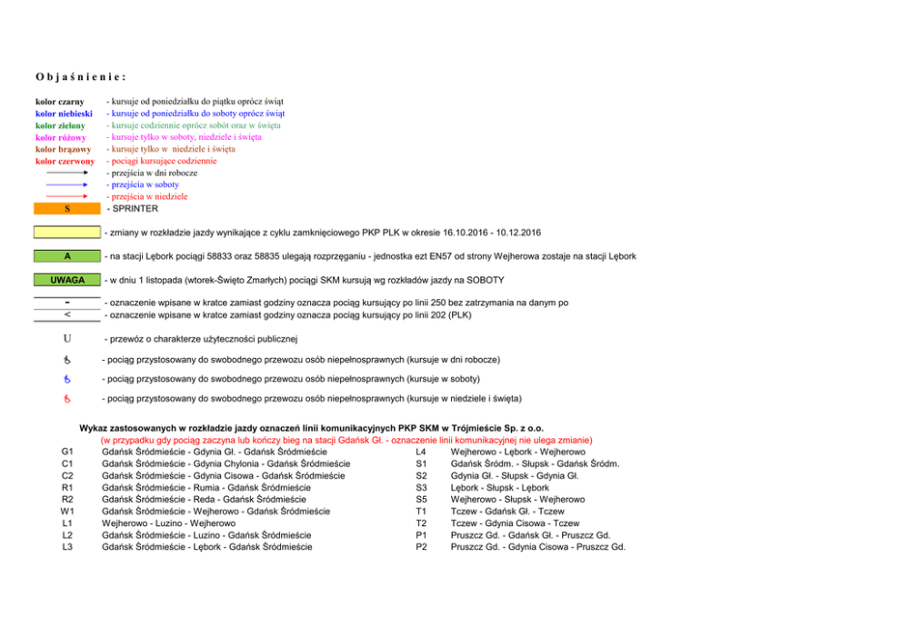 Objaśnienie: kolor czarny kolor niebieski kolor zielony kolor różowy kolor brązowy kolor czerwony S - kursuje od poniedziałku do piątku oprócz świąt - kursuje od poniedziałku do soboty oprócz świąt - kursuje codziennie oprócz sobót oraz w święta - kursuje tylko w soboty, niedziele i święta - kursuje tylko w niedziele i święta - pociągi kursujące codziennie - przejścia w dni robocze - przejścia w soboty - przejścia w niedziele - SPRINTER - zmiany w rozkładzie jazdy wynikające z cyklu zamknięciowego PKP PLK w okresie 16.10.2016 - 10.12.2016 A - na stacji Lębork pociągi 58833 oraz 58835 ulegają rozprzęganiu - jednostka ezt EN57 od strony Wejherowa zostaje na stacji Lębork UWAGA - - w dniu 1 listopada (wtorek-Święto Zmarłych) pociągi SKM kursują wg rozkładów jazdy na SOBOTY < - oznaczenie wpisane w kratce zamiast godziny oznacza pociąg kursujący po linii 250 bez zatrzymania na danym po - oznaczenie wpisane w kratce zamiast godziny oznacza pociąg kursujący po linii 202 (PLK) U - przewóz o charakterze użyteczności publicznej - pociąg przystosowany do swobodnego przewozu osób niepełnosprawnych (kursuje w dni robocze) - pociąg przystosowany do swobodnego przewozu osób niepełnosprawnych (kursuje w soboty) - pociąg przystosowany do swobodnego przewozu osób niepełnosprawnych (kursuje w niedziele i święta) G1 C1 C2 R1 R2 W1 L1 L2 L3 Wykaz zastosowanych w rozkładzie jazdy oznaczeń linii komunikacyjnych PKP SKM w Trójmieście Sp. z o.o. (w przypadku gdy pociąg zaczyna lub kończy bieg na stacji Gdańsk Gł. - oznaczenie linii komunikacyjnej nie ulega zmianie) Gdańsk Śródmieście - Gdynia Gł. - Gdańsk Śródmieście L4 Wejherowo - Lębork - Wejherowo Gdańsk Śródmieście - Gdynia Chylonia - Gdańsk Śródmieście S1 Gdańsk Śródm. - Słupsk - Gdańsk Śródm. Gdańsk Śródmieście - Gdynia Cisowa - Gdańsk Śródmieście S2 Gdynia Gł. - Słupsk - Gdynia Gł. Gdańsk Śródmieście - Rumia - Gdańsk Śródmieście S3 Lębork - Słupsk - Lębork Gdańsk Śródmieście - Reda - Gdańsk Śródmieście S5 Wejherowo - Słupsk - Wejherowo Gdańsk Śródmieście - Wejherowo - Gdańsk Śródmieście T1 Tczew - Gdańsk Gł. - Tczew Wejherowo - Luzino - Wejherowo T2 Tczew - Gdynia Cisowa - Tczew Gdańsk Śródmieście - Luzino - Gdańsk Śródmieście P1 Pruszcz Gd. - Gdańsk Gł. - Pruszcz Gd. Gdańsk Śródmieście - Lębork - Gdańsk Śródmieście P2 Pruszcz Gd. - Gdynia Cisowa - Pruszcz Gd.