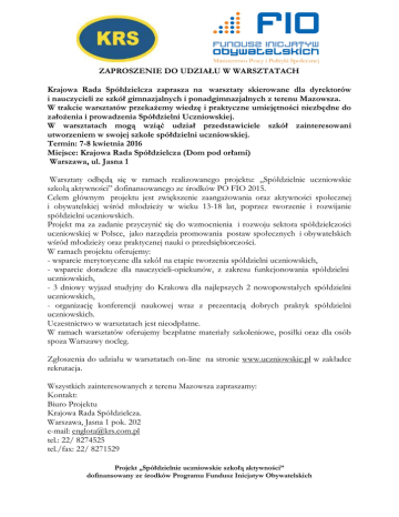 ZAPROSZENIE DO UDZIAŁU W WARSZTATACH Krajowa Rada Spółdzielcza zaprasza na warsztaty skierowane dla dyrektorów i nauczycieli ze szkół gimnazjalnych i ponadgimnazjalnych z terenu Mazowsza. W trakcie warsztatów przekażemy wiedzę i praktyczne umiejętności niezbędne do założenia i prowadzenia Spółdzielni Uczniowskiej. W warsztatach mogą wziąć udział przedstawiciele szkół zainteresowani utworzeniem w swojej szkole spółdzielni uczniowskiej. Termin: 7-8 kwietnia 2016 Miejsce: Krajowa Rada Spółdzielcza (Dom pod orłami) Warszawa, ul. Jasna 1 Warsztaty odbędą się w ramach realizowanego projektu: „Spółdzielnie uczniowskie szkołą aktywności” dofinansowanego ze środków PO FIO 2015. Celem głównym projektu jest zwiększenie zaangażowania oraz aktywności społecznej i obywatelskiej wśród młodzieży w wieku 13-18 lat, poprzez tworzenie i rozwijanie spółdzielni uczniowskich. Projekt ma za zadanie przyczynić się do wzmocnienia i rozwoju sektora spółdzielczości uczniowskiej w Polsce, jako narzędzia promowania postaw społecznych i obywatelskich wśród młodzieży oraz praktycznej nauki o przedsiębiorczości. W ramach projektu oferujemy: - wsparcie merytoryczne dla szkół na etapie tworzenia spółdzielni uczniowskich, - wsparcie doradcze dla nauczycieli-opiekunów, z zakresu funkcjonowania spółdzielni uczniowskich, - 3 dniowy wyjazd studyjny do Krakowa dla najlepszych 2 nowopowstałych spółdzielni uczniowskich, - organizację konferencji naukowej wraz z prezentacją dobrych praktyk spółdzielni uczniowskich. Uczestnictwo w warsztatach jest nieodpłatne. W ramach warsztatów oferujemy bezpłatne materiały szkoleniowe, posiłki oraz dla osób spoza Warszawy nocleg. Zgłoszenia do udziału w warsztatach on-line na stronie www.uczniowskie.pl w zakładce rekrutacja. Wszystkich zainteresowanych z terenu Mazowsza zapraszamy: Kontakt: Biuro Projektu Krajowa Rada Spółdzielcza. Warszawa, Jasna 1 pok. 202 e-mail: [email protected] tel.: 22/ 8274525 tel./fax: 22/ 8271529 Projekt „Spółdzielnie uczniowskie szkołą aktywności” dofinansowany ze środków Programu Fundusz Inicjatyw Obywatelskich