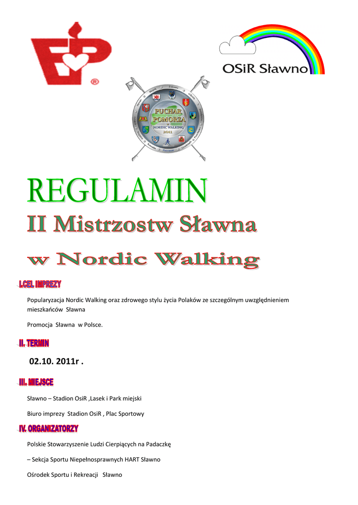 Popularyzacja Nordic Walking oraz zdrowego stylu życia Polaków ze szczególnym uwzględnieniem mieszkaoców Sławna Promocja Sławna w Polsce. 02.10. 2011r . Sławno – Stadion OsiR ,Lasek i Park miejski Biuro imprezy Stadion OsiR , Plac Sportowy Polskie Stowarzyszenie Ludzi Cierpiących na Padaczkę – Sekcja Sportu Niepełnosprawnych HART Sławno Ośrodek Sportu i Rekreacji Sławno V.ZAPISY : a) on-line. Odbywad się będą do dnia 29.09.2011r. do godz. 22:00 przez formularz zgłoszeniowy dostępny na stronach : WWW.padaczka.slawno.webd.pl - www.chodzezkijami.pl b) w dniu imprezy będzie można się zapisad osobiście w biurze zawodów od godz. 08:00do 10.00. VI.PROGRAM MINUTOWY ZAWODÓW : - 10:00 – 12:00 rejestracja zawodników - 12:00 – otwarcie imprezy, rozgrzewka -12:30 – start VIPów na dystansie 2 km - 12:40 start na dystansie 5km - 13:00 start na dystansie 10 km - 15:00 zakooczenie zawodów na 5 i 10 km - 15:30 ogłoszenie wyników , wręczenie pucharów, losowanie upominków VII. ZASADY UCZESTNICTWA I TECHNIKA MARSZU: 1. Podczas imprezy obowiązują przepisy zawodów Polskiej Federacji Nordic Walking 2. Pomiar czasu i ustalenie kolejności zawodników na mecie będzie dokonywane przez sędziów. 3. Uczestnicy startują na dystansach 5km oraz 10km w kategoriach - Dziewczęta/Chłopcy ≤ 13 - Juniorki/Juniorzy 14-17 - Seniorki/Seniorzy 18-29 - K30 / M30 30-39 - K40/ M40 40-49 - K50/ M50 50-59 - K60/ M60 60-69 - K70/ M70 ≥ 70 oraz VIP na dystansie 2 km (bez podziału na kategorie wiekowe) UWAGA! O przynależności do danej kategorii wiekowej decyduje rok urodzenia . 4.Zawodników obowiązuje limit czasu na pokonanie dystansu. META zostaje zamknięta o godz.15:30. Po tym terminie zawodnicy nie będą klasyfikowani. 5. W marszu na 5 km mogą uczestniczyd osoby niepełnosprawne. Osoby te są klasyfikowane w osobnej kategorii z podziałem na kobiety i mężczyźni bez podziału na wiek i rodzaj niepełnosprawności. Osoby niepełnosprawne startujące na dystansie 10 km są klasyfikowane z innymi kategoriami. 6. Wszyscy zawodnicy startujący w Marszu muszą zostad zweryfikowani ( z dowodem tożsamości ze zdjęciem , a osoby niepełnosprawne również z orzeczeniem o niepełnosprawności) w Biurze Marszu. Biuro będzie czynne 02.10.2011 roku w godz. 10:00– 12:00 . Podczas weryfikacji zostanie przekazany numer startowy , za który odpowiada zawodnik ( od momentu odebrania z biura). 7.Uczestnicy , którzy nie ukooczyli 18 roku życia muszą posiadad pisemną zgodę opiekuna na udział w imprezie. 8.Podpisując listę startową uczestnik bierze pełną odpowiedzialnośd za swoje uczestnictwo w Marszu. Zawodnicy dokonując rejestracji i startując w zawodach oświadczają, że biorą w nich udział na własną odpowiedzialnośd. 9. Każdy zawodnik ma obowiązek zapoznad się z regulaminem marszu i jest zobowiązany do jego przestrzegania. 10. Rejestracja oraz pobranie numeru startowego przez zawodnika jest równoznaczne z akceptacją niniejszego regulaminu. 11. Każdy uczestnik zobowiązany jest posiadad strój sportowy stosowny do warunków pogodowych . Zaleca się posiadanie własnych kijów do NW. Posiadanie kijów składanych wymaga od uczestnika zwrócenia uwagi na dokładne dokręcenie części składowych kija. 12. Podczas marszu wszyscy zawodnicy muszą mied numery startowe przymocowane do koszulek sportowych na klatce piersiowej i na plecach . Zasłanianie numeru startowego w części lub w całości lub jego modyfikacja jest zabroniona pod karą dyskwalifikacji. Nie można używad własnych numerów startowych. 13. Istnieje możliwośd wypożyczenia kijów w Biurze Marszu. Kaucja zwrotna za wypożyczenie kijów wynosi 50zł ,opłata za wypożyczenie 5 zł. Uczestnicy wypożyczający kije powinni zapoznad się z zaleceniami producenta kijów oraz zastosowad się do poleceo wypożyczającego. 14. Zawodnicy zobowiązani są zwrócid szczególna uwagę na bezpieczeostwo podczas rozgrzewki, aby nie uderzyd lub nie ukłud kijkiem współdwiczącego. 15. W Mistrzostwach Sławna mogą brad udział osoby, które nie posiadają obywatelstwa polskiego . VIII . OPŁATA STARTOWA: 1. Uczestnictwo w Marszu jest płatne i w zależności od terminu wpłaty wynosi odpowiednio : ■ 30 zł – rejestracja internetowa do dnia 28 września 2011 r. ■ 40 zł – przy zapisach w dzieo zawodów 2. Opłata raz uiszczona nie podlega zwrotowi. Nie ma możliwości przenoszenia raz wniesionej opłaty na rzecz innego zawodnika. 3. Opłata nie dotyczy osób niepełnoletnich . 4. Osoby niepełnosprawne uiszczają opłatę symboliczna w kwocie 5 zł 5. Opłatę startową należy wpłacad na następujące konto bankowe podane na stronie internetowej Organizatora : Polskie Stowarzyszenie Ludzi Cierpiących na Padaczkę Oddział w Sławnie NR 64 9317 0002 0000 0478 2000 0010 z dopiskiem wpłata na Mistrzostwa Sławna NW - Puchar Pomorza W przypadku wniesienia opłaty startowej w niewystarczającej wysokości (np. w wyniku przekroczenia terminu wpłaty określonego w niniejszym regulaminie) zawodnik jest zobowiązany do dopłacenia różnicy do wysokości kwoty, jaką winien on był wnieśd zgodnie z terminem, w jakim dokonywał swojej pierwszej wpłaty. 6.Opłata startowa obejmuje : numer startowy , pakiet uczestnika, gorący posiłek IX. NAGRODY: 1. Ogłoszenie wyników odbędzie się po zakooczeniu marszu na 5 i 10 km 2. Zdobywcy miejsc I - III w poszczególnych klasyfikacjach wiekowych w kategorii kobiet i mężczyzn na dystansie 5 i 10 km otrzymują nagrody, a każdy z uczestników pamiątkowy medal X. TRASA: 1.START i META znajduje się na terenie Stadionu OSiR przy ul. Plac Sportowy w Sławnie 2.Na trasie znajduje się punkt pomocy medycznej. W przypadku kontuzji uczestnika , powiadamiana jest obsługa trasy , która przekazuje informacje do punktu pomocy medycznej. 3.Na trasie będą punkty z wodą. 4.Na trasie znajdują się sędziowie , którzy będą dokonywali oceny techniki marszu NW ora