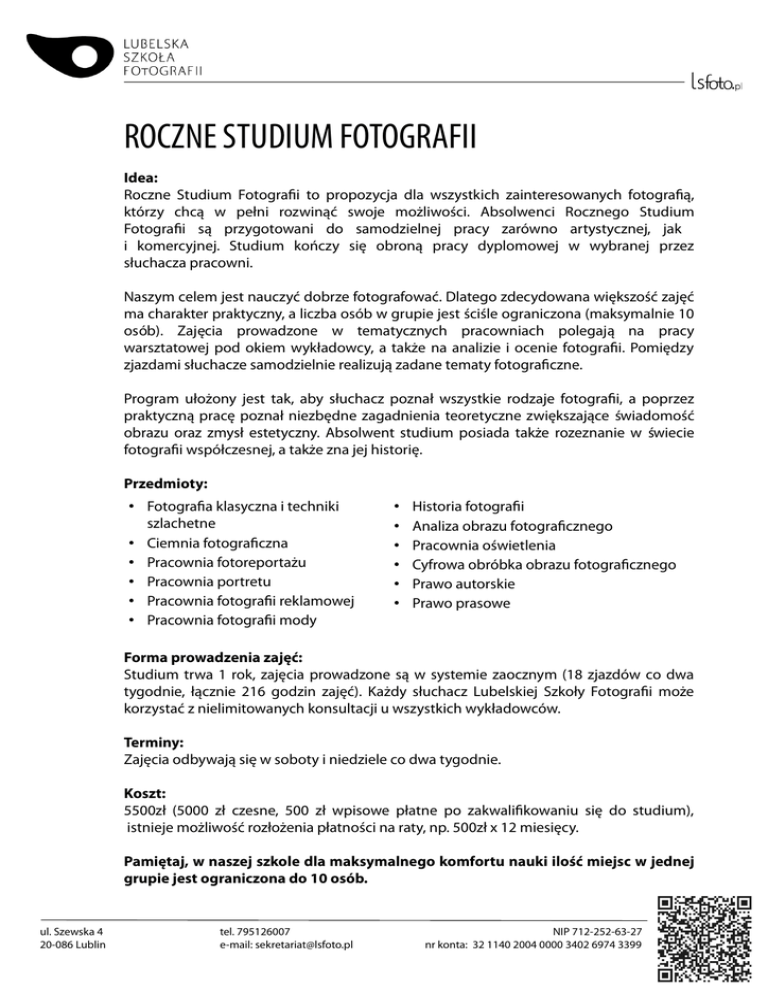 ROCZNE STUDIUM FOTOGRAFII Idea: Roczne Studium Fotografi to propozycja dla wszystkich zainteresowanych fotografa, ktorzy chca w pełni rozwinac swoje mozliwosci. Absolwenci Rocznego Studium Fotografi sa przygotowani do samodzielnej pracy zarowno artystycznej, jak i komercyjnej. Studium konczy sie obrona pracy dyplomowej w wybranej przez słuchacza pracowni. Naszym celem jest nauczyc dobrze fotografowac. Dlatego zdecydowana wiekszosc zajec ma charakter praktyczny, a liczba osob w grupie jest scisle ograniczona (maksymalnie 10 osob). Zajecia prowadzone w tematycznych pracowniach polegaja na pracy warsztatowej pod okiem wykładowcy, a takze na analizie i ocenie fotografi. Pomiedzy zjazdami słuchacze samodzielnie realizuja zadane tematy fotografczne. Program ułozony jest tak, aby słuchacz poznał wszystkie rodzaje fotografi, a poprzez praktyczna prace poznał niezbedne zagadnienia teoretyczne zwiekszajace swiadomosc obrazu oraz zmysł estetyczny. Absolwent studium posiada takze rozeznanie w swiecie fotografi wspołczesnej, a takze zna jej historie. Przedmioty: • Fotografa klasyczna i techniki szlachetne • Ciemnia fotografczna • Pracownia fotoreportazu • Pracownia portretu • Pracownia fotografi reklamowej • Pracownia fotografi mody • • • • • • Historia fotografi Analiza obrazu fotografcznego Pracownia oswietlenia Cyfrowa obrobka obrazu fotografcznego Prawo autorskie Prawo prasowe Forma prowadzenia zajęć: Studium trwa 1 rok, zajecia prowadzone sa w systemie zaocznym (18 zjazdow co dwa tygodnie, łacznie 216 godzin zajec). Kazdy słuchacz Lubelskiej Szkoły Fotografi moze korzystac z nielimitowanych konsultacji u wszystkich wykładowcow. Terminy: Zajecia odbywaja sie w soboty i niedziele co dwa tygodnie. Koszt: 5500zł (5000 zł czesne, 500 zł wpisowe płatne po zakwalifkowaniu sie do studium), istnieje mozliwosc rozłozenia płatnosci na raty, np. 500zł x 12 miesiecy. Pamiętaj, w naszej szkole dla maksymalnego komfortu nauki ilosć miejsc w jednej grupie jest ograniczona do 10 osób. ul. Szewska 4 20-086 Lublin tel. 795126007 e-mail: [email protected] NIP 712-252-63-27 nr konta: 32 1140 2004 0000 3402 6974 3399
