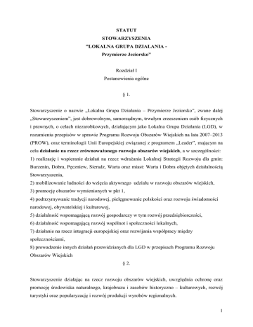STATUT STOWARZYSZENIA ”LOKALNA GRUPA DZIAŁANIA Przymierze Jeziorsko” Rozdział I Postanowienia ogólne § 1. Stowarzyszenie o nazwie „Lokalna Grupa Działania – Przymierze Jeziorsko”, zwane dalej „Stowarzyszeniem”, jest dobrowolnym, samorządnym, trwałym zrzeszeniem osób fizycznych i prawnych, o celach niezarobkowych, działającym jako Lokalna Grupa Działania (LGD), w rozumieniu przepisów w sprawie Programu Rozwoju Obszarów Wiejskich na lata 2007–2013 (PROW), oraz terminologii Unii Europejskiej związanej z programem „Leader”, mającym na celu działanie na rzecz zrównoważonego rozwoju obszarów wiejskich, a w szczególności: 1) realizację i wspieranie działań na rzecz wdrażania Lokalnej Strategii Rozwoju dla gmin: Burzenin, Dobra, Pęczniew, Sieradz, Warta oraz miast: Warta i Dobra objętych działalnością Stowarzyszenia, 2) mobilizowanie ludności do wzięcia aktywnego udziału w rozwoju obszarów wiejskich, 3) promocję obszarów wymienionych w pkt 1, 4) podtrzymywanie tradycji narodowej, pielęgnowanie polskości oraz rozwoju świadomości narodowej, obywatelskiej i kulturowej, 5) działalność wspomagającą rozwój gospodarczy w tym rozwój przedsiębiorczości, 6) działalność wspomagającą rozwój wspólnot i społeczności lokalnych, 7) działanie na rzecz integracji europejskiej oraz rozwijania współpracy między społecznościami, 8) prowadzenie innych działań przewidzianych dla LGD w przepisach Programu Rozwoju Obszarów Wiejskich § 2. Stowarzyszenie działając na rzecz rozwoju obszarów wiejskich, uwzględnia ochronę oraz promocję środowiska naturalnego, krajobrazu i zasobów historyczno – kulturowych, rozwój turystyki oraz popularyzację i rozwój produkcji wyrobów regionalnych. 1 § 3. Stowarzyszenie działa na podstawie przepisów : 1) ustawy z 7 kwietnia 1989 r Prawo o stowarzyszeniach (Dz.U.z 2001 r. Nr 79, poz.855 z późniejszymi zmianami) 2) ustawy z 7 marca 2007 r o wspieraniu rozwoju obszarów wiejskich z udziałem środków Europejskiego Funduszu Rolnego na rzecz Rozwoju Obszarów Wiejskich 3) rozporządzenia Rady (WE) nr 1698/2005 z dnia 20 września 2005 r w sprawie wsparcia rozwoju obszarów wiejskich przez Europejski Fundusz Rolny na rzecz Rozwoju Obszarów Wiejskich (Dz.Urz. UE L 277 z 21.10.2005 str.1) §4 1. Siedzibą Stowarzyszenia jest miasto Warta. 2. Stowarzyszenie może używać skrótu nazwy w brzmieniu „LGD – Przymierze Jeziorsko”. §5 1. Stowarzyszenie może być członkiem krajowych i międzynarodowych organizacji o podobnym celu działania. 2. Stowarzyszenie prowadzi działalność na obszarze Rzeczpospolitej Polskiej. W przypadku, gdy wymaga tego realizacja celów statutowych Stowarzyszenie może prowadzić działalność poza granicami kraju, zgodnie z obowiązującym przepisami prawa. 3. Czas trwania Stowarzyszenia jest nieograniczony. 4. Nadzór nad LGD sprawuje Marszałek Województwa Łódzkiego . Rozdział II Zasady działania Stowarzyszenia § 6. Stowarzyszenie realizuje swój cel w szczególności poprzez: 1) organizowanie i finansowanie: a) przedsięwzięć o charakterze informacyjnym lub szkoleniowym, w tym seminariów, 2 szkoleń, warsztatów, wizyt studyjnych, konferencji i konkursów, b) imprez kulturalnych, takich jak festiwale, przeglądy, happeningi, festyny, targi, pokazy i wystawy, służących zwłaszcza promocji regionu i jego tożsamości kulturowej, c) działalności propagandowej, promocyjnej, informacyjnej i poligraficznej, w tym: - opracowywanie i druk broszur, folderów, plakatów, - opracowywanie i rozpowszechnianie materiałów audiowizualnych, - tworzenie stron internetowych, - przygotowywanie i rozpowszechnianie innych materiałów o charakterze reklamowym lub promocyjnym, 2) prowadzenie bezpłatnego doradztwa w zakresie przygotowywania projektów inwestycyjnych związanych z realizacją LSR, 3) współpracę i wymianę doświadczeń z instytucjami publicznymi i organizacjami pozarządowymi działającymi w zakresie objętym celem Stowarzyszenia na poziomie krajowym i międzynarodowym, 4) prowadzenie innych działań przewidzianych dla LGD określonych w prawie polskim i prawie Unii Europejskiej. 5) działalność charytatywną i dobroczynną, 6) tworzenie, prowadzenie i wspieranie projektów i placówek pomocnych do realizacji celów statutowych, § 7. 1. Realizując cel statutowy Stowarzyszenie opiera się na społecznej pracy członków i zatrudnionych pracownikach. 2. Stowarzyszenie może prowadzić działalność gospodarczą zgodnie z obowiązującymi przepisami prawa w zakresie określonym w Polskiej Klasyfikacji Działalności: 3. Dochód z działalności gospodarczej Stowarzyszenia służy realizacji celów statutowych i nie może być przeznaczony do podziału między jego członków. 4. Stowarzyszenie realizując cele statutowe może powołać inne jednostki organizacyjne w granicach prawem dopuszczalnych. 3 Rozdział III Członkowie Stowarzyszenia § 8. Członkowie Stowarzyszenia dzielą się na: 1) Członków Zwyczajnych, 2) Członków Wspierających, 3) Członków Honorowych. §9 1. Nabycie i stwierdzenie utraty członkostwa w Stowarzyszeniu następuje na podstawie uchwały Zarządu Stowarzyszenia przyjętej zwykłą większością głosów, w obecności co najmniej połowy członków Zarządu. 2. O przyjęciu lub odmowie przyjęcia nowego członka Stowarzyszenia Zarząd zawiadamia zainteresowanego pisemnie w ciągu 21 dni. 3. Od odmowy członkostwa w Stowarzyszeniu nie przysługuje odwołanie. § 10 1.Członkiem zwyczajnym Stowarzyszenia może być pełnoletnia osoba fizyczna lub osoba prawna, która: 1) spełnia warunki określone w ustawie – Prawo o stowarzyszeniach, 2) działa na rzecz rozwoju obszarów wiejskich, 3) złoży deklarację członkowską wraz z pisemną rekomendacją co najmniej jednego członka wprowadzającego. Członkiem wprowadzającym może być członek Stowarzyszenia o przynajmniej 2 letnim stażu w Stowarzyszeniu. 2. C