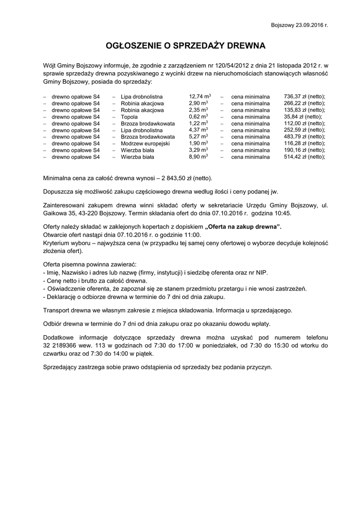 Bojszowy 23.09.2016 r. OGŁOSZENIE O SPRZEDAŻY DREWNA Wójt Gminy Bojszowy informuje, że zgodnie z zarządzeniem nr 120/54/2012 z dnia 21 listopada 2012 r. w sprawie sprzedaży drewna pozyskiwanego z wycinki drzew na nieruchomościach stanowiących własność Gminy Bojszowy, posiada do sprzedaży: drewno opałowe S4 drewno opałowe S4 drewno opałowe S4 drewno opałowe S4 drewno opałowe S4 drewno opałowe S4 drewno opałowe S4 drewno opałowe S4 drewno opałowe S4 drewno opałowe S4 Lipa drobnolistna Robinia akacjowa Robinia akacjowa Topola Brzoza brodawkowata Lipa drobnolistna Brzoza brodawkowata Modrzew europejski Wierzba biała Wierzba biała 12,74 m3 2,90 m3 2,35 m3 0,62 m3 1,22 m3 4,37 m3 5,27 m3 1,90 m3 3,29 m3 8,90 m3 cena minimalna cena minimalna cena minimalna cena minimalna cena minimalna cena minimalna cena minimalna cena minimalna cena minimalna cena minimalna 736,37 zł (netto); 266,22 zł (netto); 135,83 zł (netto); 35,84 zł (netto); 112,00 zł (netto); 252,59 zł (netto); 483,79 zł (netto); 116,28 zł (netto); 190,16 zł (netto); 514,42 zł (netto); Minimalna cena za całość drewna wynosi – 2 843,50 zł (netto). Dopuszcza się możliwość zakupu częściowego drewna według ilości i ceny podanej jw. Zainteresowani zakupem drewna winni składać oferty w sekretariacie Urzędu Gminy Bojszowy, ul. Gaikowa 35, 43-220 Bojszowy. Termin składania ofert do dnia 07.10.2016 r. godzina 10:45. Oferty należy składać w zaklejonych kopertach z dopiskiem „Oferta na zakup drewna”. Otwarcie ofert nastąpi dnia 07.10.2016 r. o godzinie 11:00. Kryterium wyboru – najwyższa cena (w przypadku tej samej ceny ofertowej o wyborze decyduje kolejność złożenia ofert). Oferta pisemna powinna zawierać: - Imię, Nazwisko i adres lub nazwę (firmy, instytucji) i siedzibę oferenta oraz nr NIP. - Cenę netto i brutto za całość drewna. - Oświadczenie oferenta, że zapoznał się ze stanem przedmiotu przetargu i nie wnosi zastrzeżeń. - Deklarację o odbiorze drewna w terminie do 7 dni od dnia zakupu. Transport drewna we własnym zakresie z miejsca składowania. Informacja u sprzedającego. Odbiór drewna w terminie do 7 dni od dnia zakupu oraz po okazaniu dowodu wpłaty. Dodatkowe informacje dotyczące sprzedaży drewna można uzyskać pod numerem telefonu 32 2189366 wew. 113 w godzinach od 7:30 do 17:00 w poniedziałek, od 7:30 do 15:30 od wtorku do czwartku oraz od 7:30 do 14:00 w piątek. Sprzedający zastrzega sobie prawo odstąpienia od sprzedaży bez podania przyczyn.