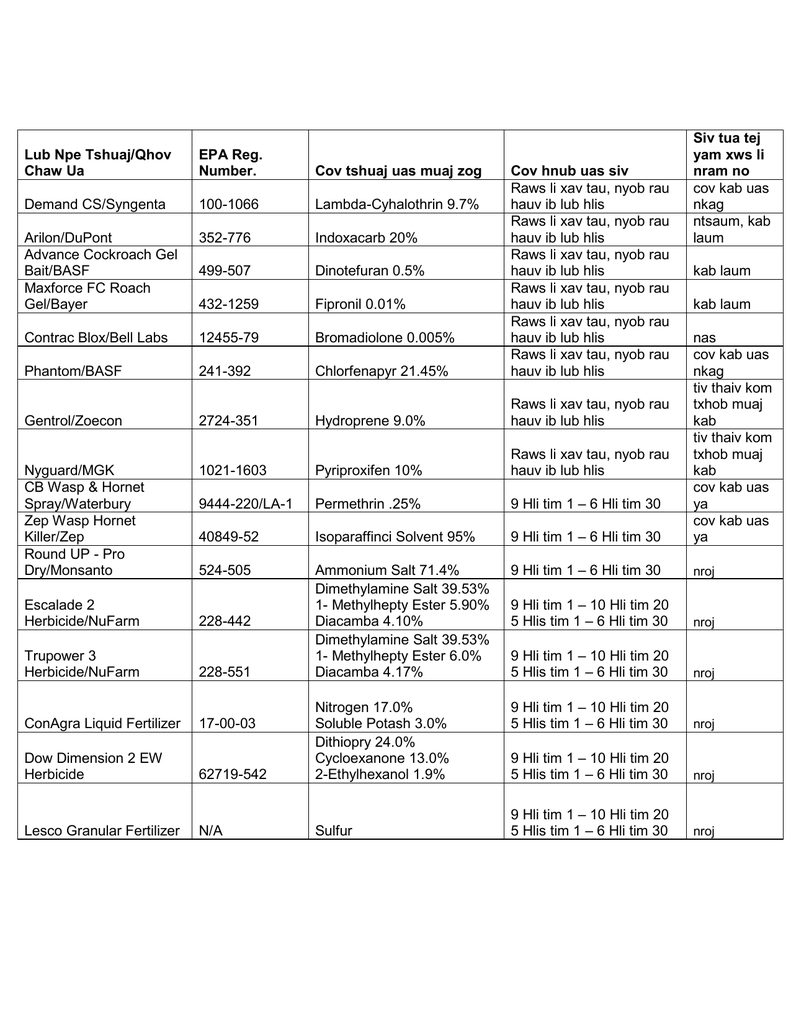 Siv tua tej yam xws li nram no cov kab uas nkag ntsaum, kab laum Lub Npe Tshuaj/Qhov Chaw Ua EPA Reg. Number. Cov tshuaj uas muaj zog Demand CS/Syngenta 100-1066 Lambda-Cyhalothrin 9.7% Arilon/DuPont Advance Cockroach Gel Bait/BASF Maxforce FC Roach Gel/Bayer 352-776 Indoxacarb 20% 499-507 Dinotefuran 0.5% 432-1259 Fipronil 0.01% Contrac Blox/Bell Labs 12455-79 Bromadiolone 0.005% Phantom/BASF 241-392 Chlorfenapyr 21.45% Cov hnub uas siv Raws li xav tau, nyob rau hauv ib lub hlis Raws li xav tau, nyob rau hauv ib lub hlis Raws li xav tau, nyob rau hauv ib lub hlis Raws li xav tau, nyob rau hauv ib lub hlis Raws li xav tau, nyob rau hauv ib lub hlis Raws li xav tau, nyob rau hauv ib lub hlis Gentrol/Zoecon 2724-351 Hydroprene 9.0% Raws li xav tau, nyob rau hauv ib lub hlis Nyguard/MGK CB Wasp & Hornet Spray/Waterbury Zep Wasp Hornet Killer/Zep Round UP - Pro Dry/Monsanto 1021-1603 Pyriproxifen 10% Raws li xav tau, nyob rau hauv ib lub hlis 9444-220/LA-1 Permethrin .25% 9 Hli tim 1 – 6 Hli tim 30 40849-52 Isoparaffinci Solvent 95% 9 Hli tim 1 – 6 Hli tim 30 nas cov kab uas nkag tiv thaiv kom txhob muaj kab tiv thaiv kom txhob muaj kab cov kab uas ya cov kab uas ya 524-505 Ammonium Salt 71.4% Dimethylamine Salt 39.53% 1- Methylhepty Ester 5.90% Diacamba 4.10% Dimethylamine Salt 39.53% 1- Methylhepty Ester 6.0% Diacamba 4.17% 9 Hli tim 1 – 6 Hli tim 30 nroj 9 Hli tim 1 – 10 Hli tim 20 5 Hlis tim 1 – 6 Hli tim 30 nroj 9 Hli tim 1 – 10 Hli tim 20 5 Hlis tim 1 – 6 Hli tim 30 nroj 9 Hli tim 1 – 10 Hli tim 20 5 Hlis tim 1 – 6 Hli tim 30 nroj 9 Hli tim 1 – 10 Hli tim 20 5 Hlis tim 1 – 6 Hli tim 30 nroj 9 Hli tim 1 – 10 Hli tim 20 5 Hlis tim 1 – 6 Hli tim 30 nroj Escalade 2 Herbicide/NuFarm 228-442 Trupower 3 Herbicide/NuFarm 228-551 ConAgra Liquid Fertilizer 17-00-03 Dow Dimension 2 EW Herbicide 62719-542 Nitrogen 17.0% Soluble Potash 3.0% Dithiopry 24.0% Cycloexanone 13.0% 2-Ethylhexanol 1.9% Lesco Granular Fertilizer N/A Sulfur kab laum kab laum Lub tsev kawm ntawv no siv ib qhov chaw ua hauj lwm uas muaj ntawv pov thawj tso cai tua kab/nas thiab tsev kawm ntawv ib tug neeg ua hauj lwm uas paub zoo txog seem no los mus saib xyuas kom txhob muaj nas, kab thiab lwm yam kab uas nyob rau sab hauv thiab ib ncig ntawm peb lub tsev kawm ntawv. Nov yog xam tas nrho: A. Tshuaj ntsuam thiab saib xyuas seb puas muaj kab thiab nas thiab puas tsim nyog tua. B. Qhia seb yuav saib xyuas thiab tu li cas thiaj tsis muaj kab thiab nas thiab tsis tau siv tshuaj tua. C. Siv tej yam uas tsis yog tshuaj xws li cuab, siv kua nplaum, thiab txhaws tej qhov kom tsis txhob muaj kab thiab nas. D. Txhua yam khoom siv los tiv thaiv kom tsis txhob muaj nas thiab kab yog tau kev tso cai los ntawm Environmental Protection Agency thiab tsuas siv thaum tsim nyog xwb. Revised August 2016