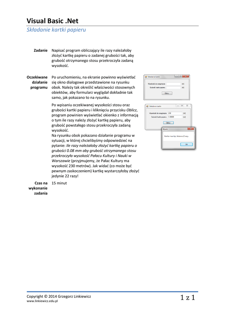 Visual Basic .Net Składanie kartki papieru Zadanie Napisać program obliczający ile razy należałoby złożyć kartkę papieru o zadanej grubości tak, aby grubość otrzymanego stosu przekroczyła zadaną wysokość. Oczekiwane Po uruchomieniu, na ekranie powinno wyświetlać działanie się okno dialogowe przedstawione na rysunku programu obok. Należy tak określić właściwości stosownych obiektów, aby formularz wyglądał dokładnie tak samo, jak pokazano to na rysunku. Po wpisaniu oczekiwanej wysokości stosu oraz grubości kartki papieru i kliknięciu przycisku Oblicz, program powinien wyświetlać okienko z informacją o tym ile razy należy złożyć kartkę papieru, aby grubość powstałego stosu przekroczyła zadaną wysokość. Na rysunku obok pokazano działanie programu w sytuacji, w której chcielibyśmy odpowiedzieć na pytanie: Ile razy należałoby złożyć kartkę papieru o grubości 0.08 mm aby grubość otrzymanego stosu przekroczyła wysokość Pałacu Kultury i Nauki w Warszawie (przyjmujemy, że Pałac Kultury ma wysokość 230 metrów). Jak widać (co może być pewnym zaskoczeniem) kartkę wystarczyłoby złożyć jedynie 22 razy! Czas na 15 minut wykonanie zadania Copyright © 2014 Grzegorz Linkiewicz www.linkiewicz.edu.pl 1z1