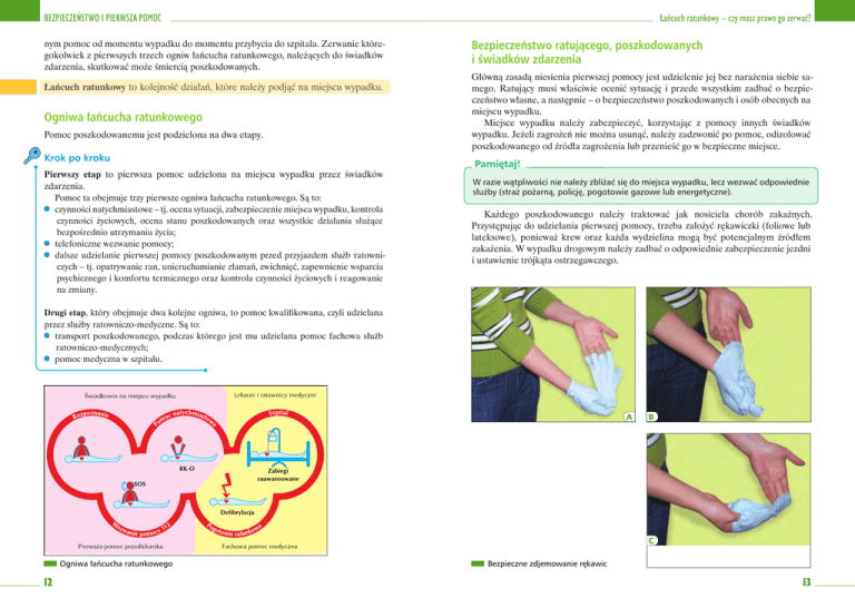 BEZPIECZEŃSTWO I PIERWSZA POMOC nym pomoc od momentu wypadku do momentu przybycia do szpitala. Zerwanie któregokolwiek z pierwszych trzech ogniw łańcucha ratunkowego, należących do świadków zdarzenia, skutkować może śmiercią poszkodowanych. Łańcuch ratunkowy to kolejność działań, które należy podjąć na miejscu wypadku. Ogniwa łańcucha ratunkowego Pomoc poszkodowanemu jest podzielona na dwa etapy. Krok po kroku Pierwszy etap to pierwsza pomoc udzielona na miejscu wypadku przez świadków zdarzenia. Pomoc ta obejmuje trzy pierwsze ogniwa łańcucha ratunkowego. Są to: z czynności natychmiastowe – tj. ocena sytuacji, zabezpieczenie miejsca wypadku, kontrola czynności życiowych, ocena stanu poszkodowanych oraz wszystkie działania służące bezpośrednio utrzymaniu życia; z telefoniczne wezwanie pomocy; z dalsze udzielanie pierwszej pomocy poszkodowanym przed przyjazdem służb ratowniczych – tj. opatrywanie ran, unieruchamianie złamań, zwichnięć, zapewnienie wsparcia psychicznego i komfortu termicznego oraz kontrola czynności życiowych i reagowanie na zmiany. Łańcuch ratunkowy – czy masz prawo go zerwać? Bezpieczeństwo ratującego, poszkodowanych i świadków zdarzenia Główną zasadą niesienia pierwszej pomocy jest udzielenie jej bez narażenia siebie samego. Ratujący musi właściwie ocenić sytuację i przede wszystkim zadbać o bezpieczeństwo własne, a następnie – o bezpieczeństwo poszkodowanych i osób obecnych na miejscu wypadku. Miejsce wypadku należy zabezpieczyć, korzystając z pomocy innych świadków wypadku. Jeżeli zagrożeń nie można usunąć, należy zadzwonić po pomoc, odizolować poszkodowanego od źródła zagrożenia lub przenieść go w bezpieczne miejsce. Pamiętaj! W razie wątpliwości nie należy zbliżać się do miejsca wypadku, lecz wezwać odpowiednie służby (straż pożarną, policję, pogotowie gazowe lub energetyczne). Każdego poszkodowanego należy traktować jak nosiciela chorób zakaźnych. Przystępując do udzielania pierwszej pomocy, trzeba założyć rękawiczki (foliowe lub lateksowe), ponieważ krew oraz każda wydzielina mogą być potencjalnym źródłem zakażenia. W wypadku drogowym należy zadbać o odpowiednie zabezpieczenie jezdni i ustawienie trójkąta ostrzegawczego. Drugi etap, który obejmuje dwa kolejne ogniwa, to pomoc kwalifikowana, czyli udzielana przez służby ratowniczo-medyczne. Są to: z transport poszkodowanego, podczas którego jest mu udzielana pomoc fachowa służb ratowniczo-medycznych; z pomoc medyczna w szpitalu. A B C Ogniwa łańcucha ratunkowego 12 Bezpieczne zdjemowanie rękawic 13