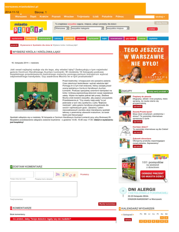 warszawa.miastodzieci.pl 2014-11-12 Strona: 1 Warszawa Śląsk Kraków Poznań Wrocław Trójmiasto Łódź Południe Północ szukaj ▸ Tu znajdziesz wszystkie zajęcia, miejsca, usługi i produkty dla dzieci: Warszawa wydarzenia powrót konkursy kolorowanki zabawy wszystkie kategorie podróże piosenki wyliczanki wszystkie miejsca bajki scenariusze gry online imiona czytelnia Wydarzenia Spektakle dla dzieci Wybierz króla i królową łąki! WYBIERZ KRÓLA I KRÓLOWĄ ŁĄKI! 16. listopada 2014 r. niedziela Jaki owad najlepiej nadaje się do tego, aby władać łąką? Zadecydują o tym najmłodsi goście Centrum Handlowego Auchan Łomianki. W niedzielę 16 listopada podczas bezpłatnego przedstawienia teatralnego maluchy pomogą polnym bohaterom wybrać odpowiedniego kandydata. Czy zazdrosna Mucha im w tym przeszkodzi? Przed biedronką i chrząszczem stoi poważne zadanie. Czas zakończyć bezkrólewie i wybrać władców łąki! Pomogą im w tym mali widzowie, którzy zasiądą przed sceną teatralną w Centrum Handlowym Auchan Łomianki. Podczas specjalnej ceremonii kandydaci na króla i królową zaprezentują dzieciom swoje największe zalety. Wybór nie będzie jednak taki prosty. Złośliwa Mucha zrobi bowiem wszystko, aby popsuć uroczystość. Przedstawienie pt. "Czy owady mają wady" to już jedenaste w tym roku spotkanie z cyklu "Bajkowe niedziele", jakie galeria handlowa przygotowała dla swoich najmłodszych gości. Zabawny i pełen nieoczekiwanych zwrotów akcji interaktywny spektakl lalkowy z pewnością udowodni maluchom, że świat teatru jest fascynujący! Spektakl odbędzie się w niedzielę 16 listopada w Centrum Handlowym Auchan Łomianki przy ulicy Brukowej 25. Bezpłatne przedstawienie odegrane zostanie trzykrotnie - o godzinie 13.00, 15.00 oraz 17.00. Udział w wydarzeniu jest bezpłatny! ZAKUPY Przybory do pisania Długopisy, ołówki i inne przybory, które sprawią, że nauka stanie się przyjemnością. sprawdź Zacznij Proste życie! Masz dość zmartwień, problemów i stresu? Te warsztaty internetowe uproszczą Ci życie sprawdź Kochasz dzieci? Te warsztaty internetowe są dla Ciebie! sprawdź Zabawki drewniane Oferujemy produkty wspomagające rozwój dziecka. Zapraszamy! sprawdź ZOSTAW KOMENTARZ Przeładuj Twoje imię lub nick Przepisz kod z obrazka Twój komentarz Wyślij komentarz KOMENTARZE Brak komentarzy KALENDARZ WYDARZEŃ listopad Pn Wt śr Cz Pt So Nd 1 2 3 4 5 6 7 8 9 dzisiaj warszawa.miastodzieci.pl 2014-11-12 Strona: 2 W każdy czwartek wysyłamy najświeższe wiadomości o imprezach dla dzieci, pomysłach na zabawy i konkursach z atrakcyjnymi nagrodami. Wśród czytelników losujemy bezpłatne zaproszenia! Zapisz się - to nic nie kosztuje! wybierz region: Warszawa wpisz email: akceptuję politykę prywatności zobacz, jak wygląda newsletter 10 11 12 13 14 15 16 17 18 19 20 21 22 23 24 25 26 27 28 29 30 zapisz się na newsletter NASI EKSPERCI Wojciech Eichelberger Psycholog, psychoterapeuta, współtwórca Instytutu Psychoimmunologii Aneta Strelau Dietetyk kliniczny z wieloletnim doświadczeniem zadaj pytanie ZABAWY DLA DZIECI DZIŚ POLECAMY Pan Jabłko NA KAŻDĄ OKAZJĘ... Jarzębinowa Wiewiórka WYDARZENIA NA WEEKEND Jesienny Ludzik • Na jesienne chłody - warsztaty czekoladowe Akwarium Z Kartonu • Moje miasto Warszawa Kolorowy Deszcz • uTKANA sobota Jabłuszkowa Łódka • Mój przyjaciel film - Pozdrowienia od Mike'a wybierz kategorię wybierz typ wybierz wiek wybierz materiał szukaj • Warsztat dla rodziców nastolatków • Sentymentalny Koncert w Teatrze Małego Widza więcej • Mali Einsteini: Bąbelkologia • Na jesienne chłody - warsztaty czekoladowe • Czas na R.O.B.O.T.Y • Zaplatane opowieści wszystkie INSPIRACJE DO LEPSZEGO ŻYCIA Emerytura - gdy wkrada się nuda i samot... Jak walczyć ze stresem? - jedzeniem!... Bez stresu? - czyli jak przeżyć upadek... Zatrzymaj się na chwilę złote myśl... miłoć i rodzina lifestyle inspiracje eko-styl praca POLECAMY W SERWISIE MIASTODZIECI.PL DLA OKOLIC WARSZAWY Kolorowanki Zabawy Grzybek kolorowanka Smakowity muchomorek W lesie W ogrodzie Jarzębinowa wiewiórka Żołędzie słonecznik Pomidory Leśny jeż Kolorowanki Disneya Gruszkowy jeżyk Polecamy: Artykuły O trudzie rozstania. Lęk separacyjny u dziecka Problemy szkolne z pisaniem i czytaniem Moje dziecko nie chce się uczyć Dekalog Janusza Korczaka dla rodziców Patronaty Drugie śniadanie do szkoły O czym śni niemowlę? Galeria Klub Bezpiecznego Puchatka - program edukacyjny dla pierwszoklasistów Cała prawda o frytkach Radosny bobas. Film na dobry dzień Plan na wymarzoną sylwetkę Czego uczymy się od dzieci? Rozszerzanie diety dziecka ze skazą białkową Dzieci należy strzec... Jeszcze dalsze burzliwe dzieje pirata Rabarbara audiobook Warsztaty Mamo To Ja Niedoparki powracają! Gry Mini Mini | Gry dla dziewczynek | Gry na Halloween | Zabawy dla dzieci - prima aprilis | WinxKlub Latajá ˇr Bloom | Ma૵chnia Kubusia Puchatka warszawa.miastodzieci.pl 2014-11-12 Strona: 3 | Zabawy dla dzieci-zima | Buty dla mamy | Puzzle Mini Mini | Gra Złap mnie Tom Jerry | Piosenki, wiersze i wierszyki dla Pani | KsiëŠ edukacyjne dla dzieci | Namiot ogrodowy - Princess | Bajki, ba鼏 bajeczki | Scenariusze zajęŚ dla dzieci | Kolorowanki: Konkursy: Katalog: Kolorowanka Wakacje! | Kolorowanka Baba Jaga | Kolorowanka Diddlina pod kwiatem | Kolorowanka DzieËŻbiet - kobieta w r北h | Kolorowanka Prezent dla dziadka | Kolorowanki Lilo i Stitch | Kolorowanka Rekin ludojad | Kolorowanka Pastuszkowie z trzodeczek | Kolorowanka 鼣iarka | Kolorowanki DzieËŻbiet | Galeria Walentynki | Galeria Portret Misia | Eko-konkurs fotograficzny | Mali Gentelmani i MaËŻbiety | Konkurs dla uczniç łzkă °odstawowych | Konkurs dla Ksi꿎iczek | Ja i mę °rzyjaciel | Moja ulubiona postać ˘ajkowa | S䍊 Buziak Twojego Dziecka | Konkurs fotograficzny Być Şak Ksi꿎iczka | Galeria Ulica Sezamkowa | Konkurs szopek bo