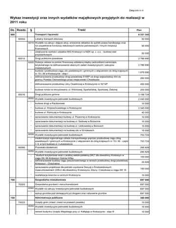 Załącznik nr 4 Wykaz inwestycji oraz innych wydatków majątkowych przyjętych do realizacji w 2011 roku Dz. Rozdz. Treść § Transport i łączność 600 Lokalny transport zbiorowy 60004 6010 Wydatki na zakup i objęcie akcji, wniesienie wkładów do spółek prawa handlowego oraz na uzupełnienie funduszy statutowych banków państwowych i innych instytucji finansowych - zwiększenie wartości udziałów MiG Krotoszyn w MZK sp. z .o.o. - budowa wiat przystankowych Drogi publiczne powiatowe 60014 6300 Dotacja celowa na pomoc finansową udzielaną między jednostkami samorządu terytorialnego na dofinansowanie własnych zadań inwestycyjnych i zakupów inwestycyjnych - budowa i przebudowa ciągu ulic powiatowych i gminnych z włączeniem do dróg krajowych nr 15 i 36 w Krotoszynie - etap I - dofinansowanie przebudowy drogi powiatowej 5165P od drogi wojewódzkiej 444 do granicy Powiatu Ostrowskiego przez miejscowość Chwaliszew dofinansowanie przebudowy ulicy Osadniczej w Krotoszynie nr 5214P - budowa ronda na skrzyżowaniu ul. Wiśniowej, Spartańskiej, Sportowej, Zielonej Drogi publiczne gminne 60016 6050 Wydatki inwestycyjne jednostek budżetowych Plan 6 331 343 50 000 50 000 50 000 2 786 690 2 786 690 1 876 690 260 000 450 000 200 000 3 198 724 2 445 000 - budowa drogi w Raciborowie - budowa ul. Wojciechowskiego w Krotoszynie - budowa ul. Rolniczej w Krotoszynie 40 000 - opracowanie dokumentacji budowy ul. Pszennej w Krotoszynie 10 000 - opracowanie dokumentacji na budowę ul. Sadowej w Bożacinie 10 000 - opracowanie dokumentacji na budowę ul. Ustkowskiej w Benicach 15 000 - opracowanie dokumentacji na budowę ulic w Wróżewach 15 000 6059 Wydatki inwestycyjne jednostek budżetowych - 60095 modernizacja regionalnego układu transportowego poprzez przebudowę ciągu dróg powiatowych i gminnych w Krotoszynie z włączeniem do dróg krajowych nr 15 i 36 - część I i II, w tym budowa ul. Łukasiewicza Pozostała działalność 6050 Wydatki inwestycyjne jednostek budżetowych - 700 70005 "studium korytarzowe wraz z analizą wielokrytelialną (SK)" dla obwodnicy Krotoszyn w ciągu DK 36 Krotoszyn Ostrów Wlkp. dofinansowanie budowy ciągu pieszorowerowego w ramach przebudowy drogi powiatowej Krotoszyn - Chachalnia opracowania projektowe dla potrzeb uzyskania Decyzji o Środowiskowych Uwarunkowaniach (DŚU) dla obwodnicy Krotoszyna, Zduny i Cieszkowa w ciągu DK 15 rewitalizacja terenów w centrum Krotoszyna 750 753 724 295 929 295 929 100 000 35 929 150 000 10 000 Gospodarka gruntami i nieruchomościami 697 000 697 000 wykup gruntów pod istniejącymi już drogami oraz nabywanie gruntów 697 000 Administracja publiczna 360 000 6050 Wydatki inwestycyjne jednostek budżetowych - 753 724 697 000 Urzędy gmin (miast i miast na prawach powiatu) 75023 2 345 000 Gospodarka mieszkaniowa 6060 Wydatki na zakupy inwestycyjne jednostek budżetowych - 10 000 remont budynku Urzędu Miejskiego przy ul. Kołłątaja w Krotoszynie - etap III 10 000 10 000 10 000 Dz. Rozdz. Treść § Pozostała działalność 75095 6010 Wydatki na zakup i objęcie akcji, wniesienie wkładów do spółek prawa handlowego oraz na uzupełnienie funduszy statutowych banków państwowych i innych instytucji finansowych - zwiększenie udziałów w Samorządowym Funduszu Poręczeń sp. z o.o. w Gostyniu Bezpieczeństwo publiczne i ochrona przeciwpożarowa 754 Komendy wojewódzkie Policji 75404 6170 Wpłaty jednostek na fundusz celowy na finansowanie i dofinansowanie zadań inwestycyjnych 75411 6620 - 75414 dofinansowanie modernizacji budynku Komendy Powiatowej Państwowej Straży Pożarnej w Krotoszynie 0 remont budynku OSP w Bożacinie 801 80101 zakup syren alarmowych ochrona najbiedniejszych mieszkańców miasta Krotoszyna przed wykluczeniem cyfrowym ochrona najbiedniejszych mieszkańców miasta Krotoszyna przed wykluczeniem cyfrowym 722 500 722 500 257 500 257 500 1 664 490 modernizacja budynków Szkoły Podstawowej Nr 4 w Krotoszynie modernizacja budynków Szkoły Podstawowej Nr 4 w Krotoszynie termomodernizacja Zespołu Szkół w Orpiszewie 6060 Wydatki na zakupy inwestycyjne jednostek budżetowych zakup tablic interakrywnych Przedszkola 6060 Wydatki na zakupy inwestycyjne jednostek budżetowych 780 963 780 963 317 923 317 923 556 104 56 104 500 000 9 500 9 500 12 880 12 880 zakup patelni elektrycznej i basenu dwukomorowego 12 880 Gimnazja 33 200 6050 Wydatki inwestycyjne jednostek budżetowych - 980 000 Szkoły podstawowe - 80110 30 000 1 710 570 modernizacja budynków Szkoły Podstawowej Nr 4 w Krotoszynie - 30 000 Oświata i wychowanie - 80104 95 000 30 000 6059 Wydatki inwestycyjne jednostek budżetowych - 9 944 Obrona cywilna 6057 Wydatki inwestycyjne jednostek budżetowych - 9 944 95 000 6050 Wydatki inwestycyjne jednostek budżetowych - 104 944 zakup specjalistycznego sprzętu 6059 Wydatki inwestycyjne jednostek budżetowych - 0 0 6057 Wydatki inwestycyjne jednostek budżetowych - 0 Dotacje celowe przekazane dla powiatu na inwestycje i zakupy inwestycyjne realizowane na podstawie porozumień (umów) między jednostkami samorządu terytorialnego Pozostała działalność 75495 1 114 944 0 6060 Wydatki na zakupy inwestycyjne jednostek budżetowych - 350 000 Komendy powiatowe Państwowej Straży Pożarnej 6060 Wydatki na zakupy inwestycyjne jednostek budżetowych - 350 000 0 6050 Wydatki inwestycyjne jednostek budżetowych - 350 000 dofinansowanie modernizacji budynku Komendy Powiatowej Policji w Krotoszynie Ochotnicze straże pożarne 75412 Plan przygotowanie dokumentacji projektowej na przebudowę drogi wraz z parkingiem przy Zespole Szkół w Chwaliszewie 6060 Wydatki na zakupy inwestycyjne jednostek budżetowych 10 000 10 000 23 200 Dz. Rozdz. Treść § - 853 85395 Plan zakup tablic interakrywnych 23 200 Pozostałe zadania w zakresie polityki społecznej 41 350 Pozostała działalność 41 350 6067 Wydatki na zakupy inwestycyjne jednostek budżetowych - 35 147 zakup oprogramowania komputerowego w ramach pro