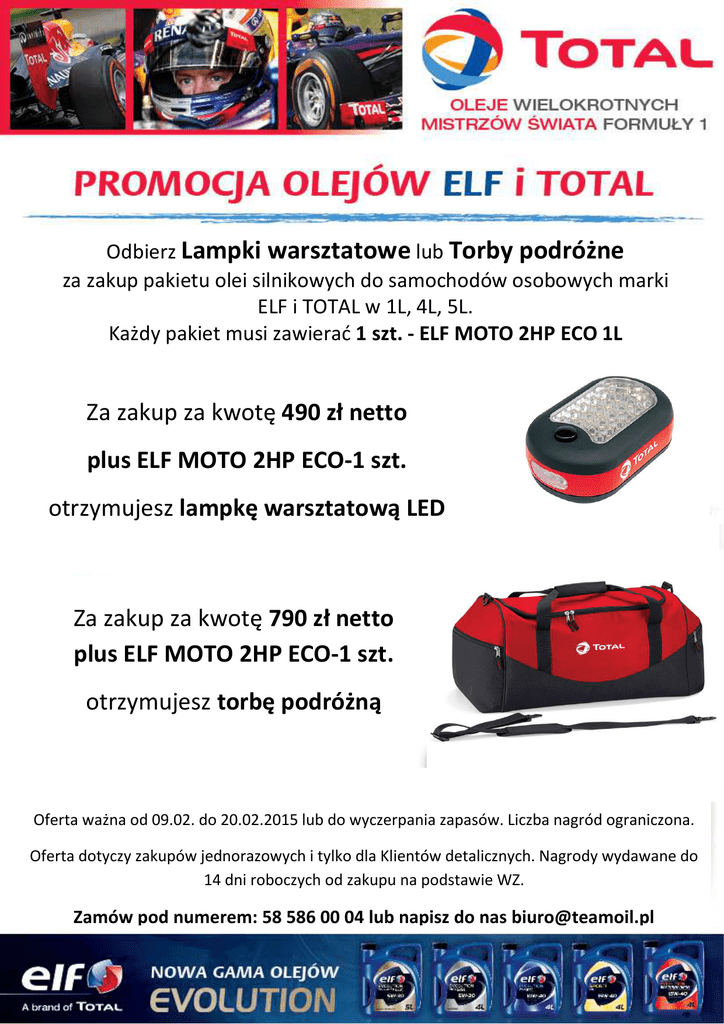 Odbierz Lampki warsztatowe lub Torby podróżne za zakup pakietu olei silnikowych do samochodów osobowych marki ELF i TOTAL w 1L, 4L, 5L. Każdy pakiet musi zawierać 1 szt. - ELF MOTO 2HP ECO 1L Za zakup za kwotę 490 zł netto plus ELF MOTO 2HP ECO-1 szt. otrzymujesz lampkę warsztatową LED Za zakup za kwotę 790 zł netto plus ELF MOTO 2HP ECO-1 szt. otrzymujesz torbę podróżną Oferta ważna od 09.02. do 20.02.2015 lub do wyczerpania zapasów. Liczba nagród ograniczona. Oferta dotyczy zakupów jednorazowych i tylko dla Klientów detalicznych. Nagrody wydawane do 14 dni roboczych od zakupu na podstawie WZ. Zamów pod numerem: 58 586 00 04 lub napisz do nas [email protected]