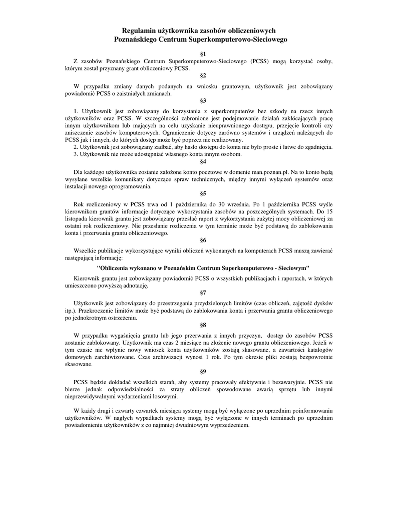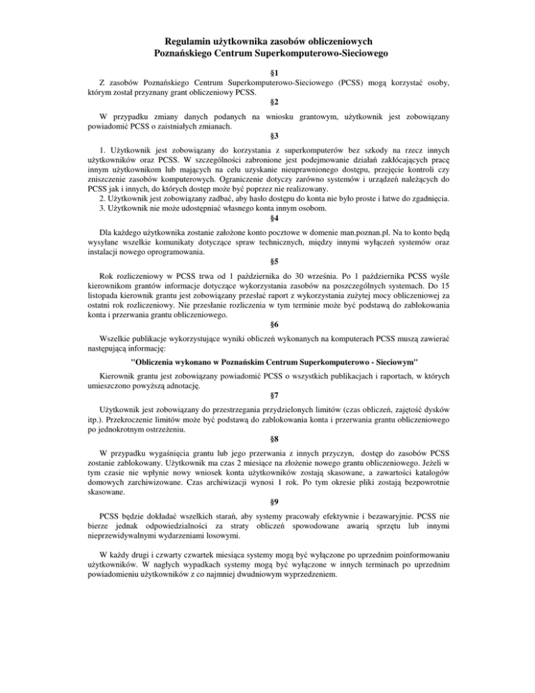 Regulamin u ytkownika zasobów obliczeniowych Pozna skiego Centrum Superkomputerowo-Sieciowego §1 Z zasobów Pozna skiego Centrum Superkomputerowo-Sieciowego (PCSS) mog którym został przyznany grant obliczeniowy PCSS. §2 korzysta osoby, W przypadku zmiany danych podanych na wniosku grantowym, u ytkownik jest zobowi zany powiadomi PCSS o zaistniałych zmianach. §3 1. U ytkownik jest zobowi zany do korzystania z superkomputerów bez szkody na rzecz innych u ytkowników oraz PCSS. W szczególno ci zabronione jest podejmowanie działa zakłócaj cych prac innym u ytkownikom lub maj cych na celu uzyskanie nieuprawnionego dost pu, przej cie kontroli czy zniszczenie zasobów komputerowych. Ograniczenie dotyczy zarówno systemów i urz dze nale cych do PCSS jak i innych, do których dost p mo e by poprzez nie realizowany. 2. U ytkownik jest zobowi zany zadba , aby hasło dost pu do konta nie było proste i łatwe do zgadni cia. 3. U ytkownik nie mo e udost pnia własnego konta innym osobom. §4 Dla ka dego u ytkownika zostanie zało one konto pocztowe w domenie man.poznan.pl. Na to konto b d wysyłane wszelkie komunikaty dotycz ce spraw technicznych, mi dzy innymi wył cze systemów oraz instalacji nowego oprogramowania. §5 Rok rozliczeniowy w PCSS trwa od 1 pa dziernika do 30 wrze nia. Po 1 pa dziernika PCSS wy le kierownikom grantów informacje dotycz ce wykorzystania zasobów na poszczególnych systemach. Do 15 listopada kierownik grantu jest zobowi zany przesła raport z wykorzystania zu ytej mocy obliczeniowej za ostatni rok rozliczeniowy. Nie przesłanie rozliczenia w tym terminie mo e by podstaw do zablokowania konta i przerwania grantu obliczeniowego. §6 Wszelkie publikacje wykorzystuj ce wyniki oblicze wykonanych na komputerach PCSS musz zawiera nast puj c informacj : "Obliczenia wykonano w Pozna skim Centrum Superkomputerowo - Sieciowym" Kierownik grantu jest zobowi zany powiadomi PCSS o wszystkich publikacjach i raportach, w których umieszczono powy sz adnotacj . §7 U ytkownik jest zobowi zany do przestrzegania przydzielonych limitów (czas oblicze , zaj to dysków itp.). Przekroczenie limitów mo e by podstaw do zablokowania konta i przerwania grantu obliczeniowego po jednokrotnym ostrze eniu. §8 W przypadku wyga ni cia grantu lub jego przerwania z innych przyczyn, dost p do zasobów PCSS zostanie zablokowany. U ytkownik ma czas 2 miesi ce na zło enie nowego grantu obliczeniowego. Je eli w tym czasie nie wpłynie nowy wniosek konta u ytkowników zostaj skasowane, a zawarto ci katalogów domowych zarchiwizowane. Czas archiwizacji wynosi 1 rok. Po tym okresie pliki zostaj bezpowrotnie skasowane. §9 PCSS b dzie dokłada wszelkich stara , aby systemy pracowały efektywnie i bezawaryjnie. PCSS nie bierze jednak odpowiedzialno ci za straty oblicze spowodowane awari sprz tu lub innymi nieprzewidywalnymi wydarzeniami losowymi. W ka dy drugi i czwarty czwartek miesi ca systemy mog by wył czone po uprzednim poinformowaniu u ytkowników. W nagłych wypadkach systemy mog by wył czone w innych terminach po uprzednim powiadomieniu u ytkowników z co najmniej dwudniowym wyprzedzeniem. §10 U ytkownik ma prawo do korzystania z dokumentacji technicznej dost pnej w PCSS, zainstalowanego i dost pnego na systemach komputerowych oprogramowania. §11 Rada U ytkowników podejmuje decyzj o nadaniu priorytetu dla przyznanego grantu obliczeniowego. Przydzielony priorytet ma znaczenie przy przydzielaniu współdzielonego czasu procesora w systemach szeregowania zada u ytkowników. §12 W razie problemów oraz pyta nale y kontaktowa si bezpo rednio z administratorami systemów komputerowych lub poprzez ogólny adres [email protected]