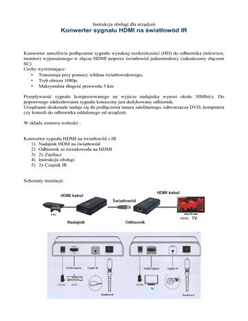 Instrukcja obsługi dla urządzeń Konwerter sygnału HDMI na światłowód IR Konwerter umożliwia podłączenie sygnału wysokiej rozdzielczości (HD) do odbiornika (telewizor, monitor) wyposażonego w złącze HDMI poprzez światłowód jednomodowy (zakończony złączem SC) Cechy wyróżniające: • Transmisja przy pomocy włókna światłowodowego, • Tryb obrazu 1080p, • Maksymalna długość przewodu 5 km Przepływność sygnału kompresowanego na wyjściu nadajnika wynosi około 30Mbit/s. Do poprawnego zdekodowania sygnału konieczny jest dedykowany odbiornik. Urządzanie doskonale nadaje się do podłączenia tunera satelitarnego, odtwarzacza DVD, komputera czy konsoli do odbiornika oddalonego od urządzeń. W składu zestawu wchodzi : Konwerter sygnału HDMI na światłowód z IR 1) Nadajnik HDM na światłowód 2) Odbiornik ze światłowodu na HDMI 3) 2x Zasilacz 4) Instrukcja obsługi 5) 2x Czujnik IR Schematy instalacji: Parametry techniczne: Nazwa Kod Obsługiwane formaty Video Maksymalna długość Temperatura pracy Wilgotność Wymiary [mm] Zasilanie Konwerter HDMI na światłowód (złącze SC) H3608 DTV/HDTV: 480i/576i/480p/576p/720p/1080i/1080p 5 km -10...60ºC 20%-90% (bez kondensacji) 130x85x24 230 V AC/ 5 V DC – IMPORTER: DIPOL 31-587 Kraków ul. Ciepłownicza 40 www.dipol.com.pl Niniejsze ogólne warunki nie wykluczają odrębnych lub dodatkowych zasad określonych przez dystrybutora, które należy traktować jako nadrzędne. Warunki gwarancyjne: 1. Produkty objęte są przez 24 miesięcy gwarancją importera: liczoną od daty zakupu nie dłużej jednak niż 26 miesięcy od daty opuszczenia Magazynu Centralnego. 2. W okresie gwarancji w razie wystąpienia uszkodzenia sprzętu nie wynikającego z winy użytkownika lub zdarzeń losowych, dokonana zostanie bezpłatna naprawa w możliwie najkrótszym czasie. 3. Wszelkie czynności regulacyjno-nastawcze urządzenia powinna dokonać specjalistyczna firma i nie wchodzą one w zakres roszczeń gwarancyjnych. 4. Po wykryciu usterki użytkownik zobowiązany jest do niezwłocznego dostarczenia produktu do Autoryzowanego Punktu Serwisowego celem dokonania naprawy, przy czym uszkodzonego produktu nie wolno użytkować pod rygorem utraty uprawnień gwarancyjnych. Wraz z reklamowanym produktem należy przesłać oryginał dokumentu zakupu oraz opis usterki. 5. Klient ma prawo ubiegać się o wymianę urządzenia na wolne od wad, jeżeli w okresie gwarancji Autoryzowany Zakład Serwisowy dokona trzech napraw istotnych a urządzenie nadal będzie wykazywać wady uniemożliwiające wykorzystanie go zgodnie z przeznaczeniem. 6. Gwarant nie będzie odpowiadał za jakąkolwiek bezpośrednią, pośrednią, przypadkową utratę podziewanych zysków lub oszczędności, wynikłą z użytkowania lub niemożności użytkowania tego produktu. Wyłączenia odpowiedzialności: 1. Urządzenie, dowód zakupu będą niezgodne ze sobą lub niemożliwe będzie odczytanie znajdujących się w nich danych 2. Uszkodzenie sprzętu spowodowane nieprawidłowym przechowywaniem, obsługą. 3. Eksploatacja w warunkach niezgodnych z danymi technicznymi, np. niewłaściwe napięcie zasilania, temperatura pracy, wilgotność, przepięcia burzowe itp. 4. Uszkodzenia wyposażenia dodatkowego które posiadają odrębną gwarancję. 5. Uszkodzenia spowodowane udarami mechanicznymi, pożarem itp. 6. Uszkodzenia spowodowane przez nieautoryzowany serwis. 7. Widoczne na obudowie uszkodzenia spowodowane upadkiem, uderzeniem. UWAGA!! Urządzenie elektroniczne nie jest odporne na uderzenia! Przy montażu należy zachować szczególną ostrożność. 8. Uszkodzenia po okresie 26 miesięcy od wyjścia rejestratora z Magazynu Centralnego.