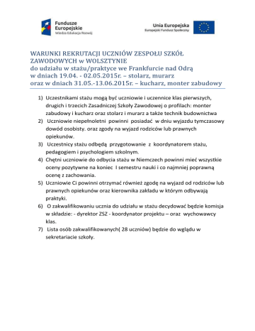 WARUNKI REKRUTACJI UCZNIÓW ZESPOŁU SZKÓŁ ZAWODOWYCH w WOLSZTYNIE do udziału w stażu/praktyce we Frankfurcie nad Odrą w dniach 19.04. - 02.05.2015r. – stolarz, murarz oraz w dniach 31.05.-13.06.2015r. – kucharz, monter zabudowy 1) Uczestnikami stażu mogą być uczniowie i uczennice klas pierwszych, drugich i trzecich Zasadniczej Szkoły Zawodowej o profilach: monter zabudowy i kucharz oraz stolarz i murarz a także technik budownictwa 2) Uczniowie niepełnoletni powinni posiadać w dniu wyjazdu tymczasowy dowód osobisty. oraz zgody na wyjazd rodziców lub prawnych opiekunów. 3) Uczestnicy stażu odbędą przygotowanie z koordynatorem stażu, pedagogiem i psychologiem szkolnym. 4) Chętni uczniowie do odbycia stażu w Niemczech powinni mieć wszystkie oceny pozytywne na koniec I semestru nauki i co najmniej poprawną ocenę z zachowania. 5) Uczniowie Ci powinni otrzymać również zgodę na wyjazd od rodziców lub prawnych opiekunów oraz kierownika zakładu w którym odbywają praktyki. 6) O zakwalifikowaniu ucznia do udziału w stażu decydować będzie komisja w składzie: - dyrektor ZSZ - koordynator projektu – oraz wychowawcy klas. 7) Lista osób zakwalifikowanych( 28 uczniów) będzie do wglądu w sekretariacie szkoły.
