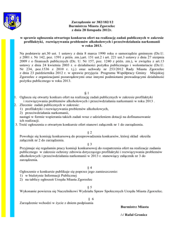 Zarządzenie nr 382/182/12 Burmistrza Miasta Zgorzelec z dnia 28 listopada 2012r. w sprawie ogłoszenia otwartego konkursu ofert na realizację zadań publicznych w zakresie profilaktyki, rozwiązywania problemów alkoholowych i przeciwdziałania narkomanii w roku 2013. Na podstawie art.30 ust. 1 ustawy z dnia 8 marca 1990 roku o samorządzie gminnym (Dz.U. z 2001 r. Nr 142, poz. 1591 z późn. zm.),art. 151 ust.2 i art. 221 ust.3 ustawy z dnia 27 sierpnia 2009 r o finansach publicznych (Dz. U. Nr 157, poz. 1240 z późn. zm.), w związku z art.13 ustawy z dnia 24 kwietnia 2003 r. o działalności pożytku publicznego i wolontariacie (Dz.U. Nr 234, poz.1536 z 2010 r. t.j.) oraz uchwały nr 253/2012 Rady Miasta Zgorzelec z dnia 23 października 2012 r. w sprawie przyjęcia Programu Współpracy Gminy Miejskiej Zgorzelec z organizacjami pozarządowymi oraz innymi podmiotami prowadzącymi działalność pożytku publicznego w roku 2013. §1 1. Ogłasza się otwarty konkurs ofert na realizację zadań publicznych w zakresie profilaktyki i rozwiązywania problemów alkoholowych i przeciwdziałania narkomanii w roku 2013 . 2. Zlecenie zadań publicznych w zakresie: 1) profilaktyki i rozwiązywania problemów alkoholowych, 2) przeciwdziałania narkomanii, nastąpi w formie wspierania takich zadań wraz z udzieleniem dotacji na dofinansowanie ich realizacji. 3. Treść ogłoszenia o otwartym konkursie ofert stanowi załącznik nr 1 do zarządzenia. §2 Powołuje się komisję konkursową do przeprowadzenia konkursów, której skład określa załącznik nr 2 do zarządzenia. §3 Przyjmuje się regulamin pracy komisji konkursowej do rozpatrzenia ofert na realizacje zadania publicznego w zakresie ochrony zdrowia dotyczącego profilaktyki i rozwiązywania problemów alkoholowych i przeciwdziałania narkomanii w 2013 r. stanowiący załącznik nr 3 do zarządzenia. §4 Ogłoszenie o konkursie publikuje się poprzez jego zamieszczenie: 1) w biuletynie Informacji Publicznej 2) na tablicy ogłoszeń Urzędu Miasta Zgorzelec §5 Wykonanie powierza się Naczelnikowi Wydziału Spraw Społecznych Urzędu Miasta Zgorzelec. § 6 Zarządzenie wchodzi w życie z dniem podpisania Burmistrz Miasta /-/ Rafał Gronicz Załącznik nr 1 do Zarządzenia Burmistrza Miasta nr382/182./12 z dnia 28 listopada.2012r. Ogłoszenie otwartego konkursu ofert na realizację zadań publicznych w zakresie profilaktyki, rozwiązywania problemów alkoholowych i przeciwdziałania narkomanii w roku 2013. Zlecanie realizacji zadań publicznych odbywać się będzie na podstawie, art. 151 ust.2 i art. 221 ust.3 ustawy z dnia 27 sierpnia 2009 r o finansach publicznych (Dz. U. Nr 157, poz. 1240 z późn. zm.), w związku z art.13 ustawy z dnia 24 kwietnia 2003 r. o działalności pożytku publicznego i wolontariacie (Dz. U. Nr 234, poz.1536 z 2010 r. t.j.) oraz uchwały nr 253/2012 Rady Miasta Zgorzelec z dnia 23 października 2012 r. w sprawie przyjęcia Programu Współpracy Gminy Miejskiej Zgorzelec z organizacjami pozarządowymi oraz innymi podmiotami prowadzącymi działalność pożytku publicznego w roku 2013. Konkurs jest adresowany do organizacji pozarządowych, oraz podmiotów wymienionych w art.3 ust.3 ustawy z dnia 24 października 2003 r. o działalności pożytku publicznego i o wolontariacie prowadzących działalność statutową na terenie Gminy Miejskiej Zgorzelec A. Prowadzenie działań związanych z profilaktyką i rozwiązywaniem problemów alkoholowych i przeciwdziałaniem narkomanii. I. Wsparcie programów psychoterapii dla osób uzależnionych od alkoholu i narkotyków Planowana wysokość środków publicznych przeznaczona na zadanie do podziału dla wybranych podmiotów na 2013 r.– 78 000 zł. Wysokość środków publicznych na zadanie w roku 2012 – 78 000 zł. Cel zadania - rozszerzenie dostępności terapii i rehabilitacji dla osób uzależnionych i członków ich rodzin, aktywizacja i integracja środowisk abstynenckich. Przedsięwzięcia realizowane w ramach zadania: działania medyczno-terapeutyczne realizowane przez placówki lecznictwa odwykowego i inne podmioty udzielające pomocy osobom uzależnionym i ich rodzinom, . Beneficjanci zadania: - osoby z problemem alkoholowym i narkotykowym oraz ich rodziny. Koszty pokrywane z budżetu Miasta Zgorzelec, w szczególności: koszty pogłębionych programów dla osób uzależnionych, niezbędny sprzęt do prowadzenia zajęć, praca terapeutów uzależnień związanych z programem pomocy osobom uzależnionym i członkom ich rodzin. II. Profilaktyka HIV/AIDS -wsparcie Punktu Konsultacyjno Diagnostycznego Planowana wysokość środków publicznych przeznaczonych na zadanie dla wybranych podmiotów na 2013 r. - 7000 zł. Wysokość środków publicznych na zadanie w 2012 r. – nie dotyczy Cel zadania - profilaktyka HIV/AIDS i chorób przenoszonych drogą płciową, zapewnienie możliwości diagnozy i terapii. Przedsięwzięcia realizowane w ramach zadania: anonimowe i bezpłatne testowanie HIV z poradnictwem przed i po teście. Beneficjenci zadania – mieszkańcy miasta Zgorzelec. Koszty pokrywane ze środków budżetu miasta, w szczególności: badania w kierunku HIV, poradnictwo przed i po teście, szkolenia personelu obsługującego PKD II. Działalność opiekuńczo – profilaktyczna świetlic dla dzieci z grup ryzyka Planowana wysokość środków publicznych przeznaczona na zadanie do podziału dla wybranych podmiotów na 2013 r.– 78 000 zł. Wysokość środków publicznych na zadanie w roku 2012 – 70 000 zł. Cel zadania - działalność informacyjna i edukacyjna w zakresie rozwiązywania problemów alkoholowych i przeciwdziałania narkomanii, w szczególności dla dzieci i młodzieży, przeciwdziałanie społecznej marginalizacji dzieci, młodzieży, rodzin, grup dotkniętych problemem alkoholizmu i narkomanii, wyrabianie nawyków aktywnego spędzania czasu wolnego. Przedsięwzięcia realizowane w ramach zadania: prowadzenie działalności świe