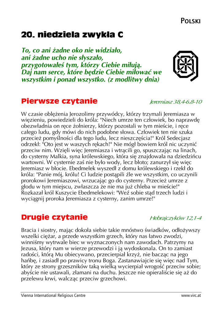 Polski To, co ani żadne oko nie widziało, ani żadne ucho nie słyszało, przygotowałeś tym, którzy Ciebie miłują. Daj nam serce, które będzie Ciebie miłować we wszystkim i ponad wszystko. (z modlitwy dnia) W czasie oblężenia Jerozolimy przywódcy, którzy trzymali Jeremiasza w więzieniu, powiedzieli do króla: "Niech umrze ten człowiek, bo naprawdę obezwładnia on ręce żołnierzy, którzy pozostali w tym mieście, i ręce całego ludu, gdy mówi do nich podobne słowa. Człowiek ten nie szuka przecież pomyślności dla tego ludu, lecz nieszczęścia!" Król Sedecjasz odrzekł: "Oto jest w waszych rękach!" Nie mógł bowiem król nic uczynić przeciw nim. Wzięli więc Jeremiasza i wtrącili go, spuszczając na linach, do cysterny Malkia, syna królewskiego, która się znajdowała na dziedzińcu wartowni. W cysternie zaś nie było wody, lecz błoto; zanurzył się więc Jeremiasz w błocie. Ebedmelek wyszedł z domu królewskiego i rzekł do króla: "Panie mój, królu! Ci ludzie postąpili źle we wszystkim, co uczynili prorokowi Jeremiaszowi, wrzucając go do cysterny. Przecież umrze z głodu w tym miejscu, zwłaszcza że nie ma już chleba w mieście!" Rozkazał król Kuszycie Ebedmelekowi: "Weź sobie stąd trzech ludzi i wyciągnij proroka Jeremiasza z cysterny, zanim umrze!" Bracia i siostry, mając dokoła siebie takie mnóstwo świadków, odłożywszy wszelki ciężar, a przede wszystkim grzech, który nas łatwo zwodzi, winniśmy wytrwale biec w wyznaczonych nam zawodach. Patrzymy na Jezusa, który nam w wierze przewodzi i ją wydoskonala. On to zamiast radości, którą Mu obiecywano, przecierpiał krzyż, nie bacząc na jego hańbę, i zasiadł po prawicy tronu Boga. Zastanawiajcie się więc nad Tym, który ze strony grzeszników taką wielką wycierpiał wrogość przeciw sobie; abyście nie ustawali, złamani na duchu. Jeszcze nie opieraliście się aż do przelewu krwi, walcząc przeciw grzechowi. Vienna International Religious Centre www.virc.at Jezus powiedział do swoich uczniów: "Przyszedłem rzucić ogień na ziemię i jakże bardzo pragnę, żeby on już zapłonął! Chrzest mam przyjąć i jakiej doznaję udręki, aż się to stanie. Czy myślicie, że przyszedłem dać ziemi pokój? Nie, powiadam wam, lecz rozłam. Odtąd bowiem pięcioro będzie rozdwojonych w jednym domu: troje stanie przeciw dwojgu, a dwoje przeciw trojgu; ojciec przeciw synowi, a syn przeciw ojcu; matka przeciw córce, a córka przeciw matce; teściowa przeciw synowej, a synowa przeciw teściowej". Dla wielu ludzi jest teraz czas urlopu. Ten czas korzystania z ciszy, przerwy w codziennym zabieganiu jest często także czasem zastanowienia się nad własnym życiem. Dobrze jest, gdy w takich dniach podejmiemy zrobienie bilansu naszej codzienności i określimy miejsce, w którym się aktualnie znajdujemy, gdyż tylko wtedy, gdy podejmujemy jednoznaczne decyzje odnośnie do kształtu naszego życia, możemy prowadzić szczęśliwe życie w odpowiedzialności. Pomocą do tego mogą być dzisiejsze fragmenty biblijne. Pierwsze czytanie opowiada o słabym królu Sedecjuszu, który był właściwie zabawką w rękach swoich doradców. Niezdolny do podejmowania decyzji, sprowadził poprzez swoją połowiczność wielkie nieszczęście na Jeremiasza. Pocieszającym dla nas jest jeden aspekt: nawet, gdy ludzki brak podejmowania decyzji spowoduje nieszczęście, Bóg wkracza jako wybawca. List do Hebrajczyków jest homilią umacniającą chrześcijan. Przytoczony fragment tekstu upomina chrześcijan, by nie popadli w opieszałość i nie pogrążyli się w rezygnacji. W perspektywie Jezusa, początku i pełni wiary, każdy powinien iść swoją drogą odważnie. Rezygnacja wielu chrześcijan w obliczu cierpienia i trudności bierze się stąd, że nie wpatrują się w pra-wzór chrześcijańskiego sposobu życia – w samego Chrystusa, którego na drodze do zmartwychwstania także nie ominął los życia i śmierci. Ewangelia wychodzi z założenia, że prawdziwe chrześcijaństwo jako naśladowanie Chrystusa, nigdy nie będzie wygodną, społeczną religią. Nie wolno spłycać radykalizmu Dobrej Nowiny. Jego słowo i Jego dzieło domagają się podjęcia decyzji i w ten sposób rozróżniają duchy. Gdy ludzie zdecydują się na drogę naśladowania Chrystusa, wówczas nie ma miejsca na letniość i leniwe kompromisy. Wprost przeciwnie: prawdziwe zdecydowanie jest często niewygodne, bolące i prowadzi do podziału i rozłamu najściślejszych ludzkich decyzji. W ten sposób wszystkie trzy teksty prowadzą nas do punktu kulminacyjnego. Świadome opowiedzenie się za Chrystusem nie znosi połowiczności. Naśladowanie Chrystusa musi być stale całościowe, wyznania warg muszą mieć potwierdzenie w świadectwie życia. Gdybyśmy, jako cały lud Boży, potrafili nawrócić się sercem do Chrystusa i przyjąć poważnie Jego Nowinę, doświadczylibyśmy szczęśliwości Radosnej Nowiny i wyzwalającej mocy budowania życia na Chrystusie. Vienna International Religious Centre [email protected]