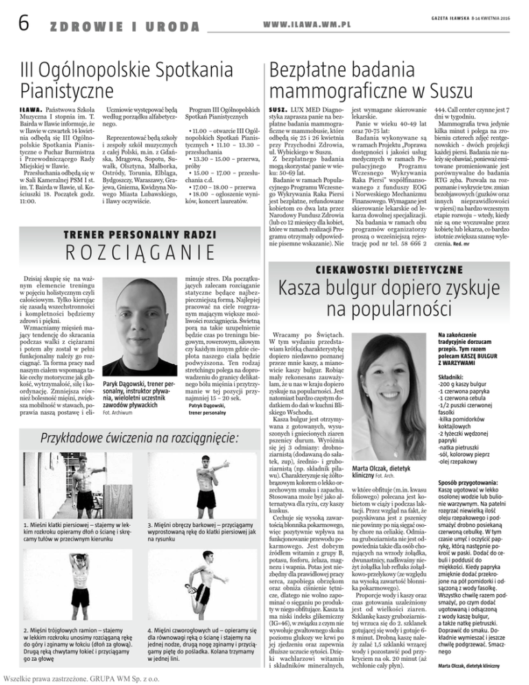 6 ZDROWIE I URODA G A Z E T A I Ł A W S K A 8-14 KWIETNIA 2016 W W W. I L A W A . W M . P L III Ogólnopolskie Spotkania Pianistyczne Bezpłatne badania mammograficzne w Suszu I Ł A W A . Państwowa Szkoła Muzyczna I stopnia im. T. Bairda w Iławie informuje, że w Iławie w czwartek 14 kwietnia odbędą się III Ogólnopolskie Spotkania Pianistyczne o Puchar Burmistrza i Przewodniczącego Rady Miejskiej w Iławie. Przesłuchania odbędą się w w Sali Kameralnej PSM I st. im. T. Bairda w Iławie, ul. Kościuszki 18. Początek godz. 11:00. S U S Z . LUX MED Diagnostyka zaprasza panie na bezpłatne badania mammograficzne w mammobusie, które odbędą się 25 i 26 kwietnia przy Przychodni Zdrowia, ul. Wybickiego w Suszu. Z bezpłatnego badania mogą skorzystać panie w wieku: 50-69 lat. Badanie w ramach Populacyjnego Programu Wczesnego Wykrywania Raka Piersi jest bezpłatne, refundowane kobietom co dwa lata przez Narodowy Fundusz Zdrowia (lub co 12 miesięcy dla kobiet, które w ramach realizacji Programu otrzymały odpowiednie pisemne wskazanie). Nie Uczniowie występować będą według porządku alfabetycznego. Reprezentować będą szkoły i zespoły szkół muzycznych z całej Polski, m.in. z Gdańska, Mrągowa, Sopotu, Suwałk, Olsztyna, Malborka, Ostródy, Torunia, Elbląga, Bydgoszczy, Waraszawy, Grajewa, Gniezna, Kwidzyna Nowego Miasta Lubawskiego, i Iławy oczywiście. Program III Ogólnopolskich Spotkań Pianistycznych • 11.00 – otwarcie III Ogólnopolskich Spotkań Pianistycznych • 11.10 – 13.30 – przesłuchania • 13.30 – 15.00 – przerwa, próby • 15.00 – 17.00 – przesłuchania c.d. • 17.00 – 18.00 – przerwa • 18.00 – ogłoszenie wyników, koncert laureatów. TRENER PERSONALNY RADZI ROZCIĄGANIE Dzisiaj skupię się na ważnym elemencie treningu w pojęciu holistycznym czyli całościowym. Tylko kierując się zasadą wszechstronności i kompletności będziemy zdrowi i piękni. Wzmacniamy mięsień mający tendencję do skracania podczas walki z ciężarami i potem aby został w pełni funkcjonalny należy go rozciągnąć. Ta forma pracy nad naszym ciałem wspomaga takie cechy motoryczne jak gibkość, wytrzymałość, siłę i koordynację. Zmniejsza również bolesność mięśni, zwiększa mobilność w stawach, poprawia naszą postawę i eli- Paryk Dągowski, trener personalny, instruktor pływania, wieloletni uczestnik zawodów pływackich Fot. Archiwum minuje stres. Dla początkujących zalecam rozciąganie statyczne będące najbezpieczniejszą formą. Najlepiej pracować na ciele rozgrzanym mającym większe możliwości rozciągnięcia. Świetną porą na takie uzupełnienie będzie czas po treningu biegowym, rowerowym, siłowym czy każdym innym gdzie ciepłota naszego ciała będzie podwyższona. Ten rodzaj stretchingu polega na doprowadzeniu do granicy delikatnego bólu mięśnia i przytrzymanie w tej pozycji przynajmniej 15 – 20 sek. Patryk Dągowski, trener personalny Przykładowe ćwiczenia na rozciągnięcie: 1. Mieśni klatki piersiowej – stajemy w lekkim rozkroku opieramy dłoń o ścianę i skręcamy tułów w przeciwnym kierunku 3. Mięśni obręczy barkowej – przyciągamy wyprostowaną rękę do klatki piersiowej jak na rysunku 2. Mięśni trójgłowych ramion – stajemy w lekkim rozkroku unosimy rozciąganą rękę do góry i zginamy w łokciu (dłoń za głową). Drugą ręką chwytamy łokieć i przyciągamy go za głowę 4. Mięśni czworogłowych ud – opieramy się dla równowagi ręką o ścianę i stajemy na jednej nodze, drugą nogę zginamy i przyciągamy piętę do pośladka. Kolana trzymamy w jednej lini. Wszelkie prawa zastrzeżone. GRUPA WM Sp. z o.o. jest wymagane skierowanie lekarskie. Panie w wieku 40-49 lat oraz 70-75 lat: Badania wykonywane są w ramach Projektu „Poprawa dostępności i jakości usług medycznych w ramach Populacyjnego Programu Wczesnego Wykrywania Raka Piersi” współfinansowanego z funduszy EOG i Norweskiego Mechanizmu Finansowego. Wymagane jest skierowanie lekarskie od lekarza dowolnej specjalizacji. Na badania w ramach obu programów organizatorzy proszą o wcześniejszą rejestrację pod nr tel. 58 666 2 444. Call center czynne jest 7 dni w tygodniu. Mammografia trwa jedynie kilka minut i polega na zrobieniu czterech zdjęć rentgenowskich - dwóch projekcji każdej piersi. Badania nie należy się obawiać, ponieważ emitowane promieniowanie jest porównywalne do badania RTG zęba. Pozwala na rozpoznanie i wykrycie tzw. zmian bezobjawowych (guzków oraz innych nieprawidłowości w piersi) na bardzo wczesnym etapie rozwoju – wtedy, kiedy nie są one wyczuwalne przez kobietę lub lekarza, co bardzo istotnie zwiększa szansę wyleczenia. Red. mr C I E K AWO S T K I D I E T E T YC Z N E Kasza bulgur dopiero zyskuje na popularności Wracamy po Świętach. W tym wydaniu przedstawiam krótką charakterystykę dopiero niedawno poznanej przeze mnie kaszy, a mianowicie kaszy bulgur. Robiąc mały rekonesans zauważyłam, że u nas w kraju dopiero zyskuje na popularności. Jest natomiast bardzo częstym dodatkiem do dań w kuchni Bliskiego Wschodu. Kasza bulgur jest otrzymywana z gotowanych, wysuszonych i gniecionych ziaren pszenicy durum. Wyróżnia się jej 3 odmiany: drobnoziarnistą (dodawaną do sałatek, zup), średnio- i gruboziarnistą (np. składnik pilawu). Charakteryzuje się żółtobrązowym kolorem o lekko orzechowym smaku i zapachu. Stosowana może być jako alternatywa dla ryżu, czy kaszy kuskus. Cechuje się wysoką zawartością błonnika pokarmowego, więc pozytywnie wpływa na funkcjonowanie przewodu pokarmowego. Jest dobrym źródłem witamin z grupy B, potasu, fosforu, żelaza, magnezu i wapnia. Potas jest niezbędny dla prawidłowej pracy serca, zapobiega obrzękom oraz obniża ciśnienie tętnicze, dlatego nie wolno zapominać o sięganiu po produkty w niego obfitujące. Kasza ta ma niski indeks glikemiczny (IG=46), w związku z czym nie wywołuje gwa