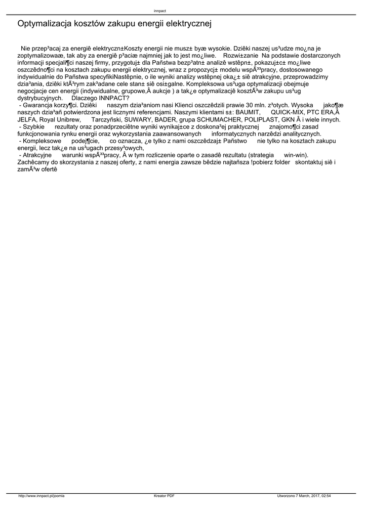 innpact Optymalizacja kosztów zakupu energii elektrycznej Nie przep³acaj za energiê elektryczn±Koszty energii nie musz± byæ wysokie. Dziêki naszej us³udze mo¿na je zoptymalizowaæ, tak aby za energiê p³aciæ najmniej jak to jest mo¿liwe. Rozwi±zanie Na podstawie dostarczonych informacji specjali¶ci naszej firmy, przygotuj± dla Pañstwa bezp³atn± analizê wstêpn±, pokazuj±c± mo¿liwe oszczêdno¶ci na kosztach zakupu energii elektrycznej, wraz z propozycj± modelu wspó³pracy, dostosowanego indywidualnie do Pañstwa specyfikiNastêpnie, o ile wyniki analizy wstêpnej oka¿± siê atrakcyjne, przeprowadzimy dzia³ania, dziêki którym zak³adane cele stan± siê osi±galne. Kompleksowa us³uga optymalizacji obejmuje negocjacje cen energii (indywidualne, grupowe, aukcje ) a tak¿e optymalizacjê kosztów zakupu us³ug dystrybucyjnych. Dlaczego INNPACT? - Gwarancja korzy¶ci. Dziêki naszym dzia³aniom nasi Klienci oszczêdzili prawie 30 mln. z³otych. Wysoka jako¶æ naszych dzia³añ potwierdzona jest licznymi referencjami. Naszymi klientami s±: BAUMIT, QUICK-MIX, PTC ERA, JELFA, Royal Unibrew, Tarczyñski, SUWARY, BADER, grupa SCHUMACHER, POLIPLAST, GKN  i wiele innych. - Szybkie rezultaty oraz ponadprzeciêtne wyniki wynikaj±ce z doskona³ej praktycznej znajomo¶ci zasad funkcjonowania rynku energii oraz wykorzystania zaawansowanych informatycznych narzêdzi analitycznych. - Kompleksowe podej¶cie, co oznacza, ¿e tylko z nami oszczêdzaj± Pañstwo nie tylko na kosztach zakupu energii, lecz tak¿e na us³ugach przesy³owych, - Atrakcyjne warunki wspó³pracy,  w tym rozliczenie oparte o zasadê rezultatu (strategia win-win). Zachêcamy do skorzystania z naszej oferty, z nami energia zawsze bêdzie najtañsza !pobierz folder skontaktuj siê i zamów ofertê http://www.innpact.pl/joomla Kreator PDF Utworzono 7 March, 2017, 02:54