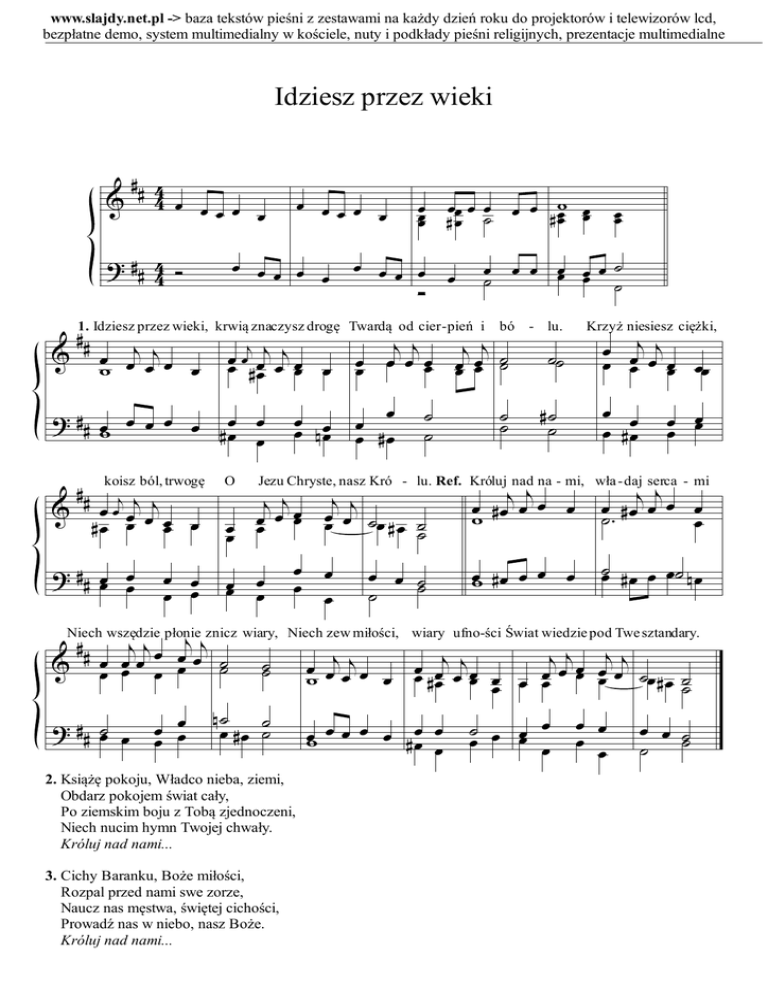 www.slajdy.net.pl -> baza tekstów pieśni z zestawami na każdy dzień roku do projektorów i telewizorów lcd, bezpłatne demo, system multimedialny w kościele, nuty i podkłady pieśni religijnych, prezentacje multimedialne Idziesz przez wieki ∀∀ 3 % 3 œ œ œ œ œ > ∀∀ 3 Ó 3 œ œœœ œ œ œœ œ œ œœ œœ œ œ œ œ ϖœ œœ ∀œ œ ∀œ ˙ œ œœ œ Ó œ œ œ œ œœ œœ œ ˙ ˙ ˙ ∀1.∀ Idziesz przez wieki, krwiąιznaczysz drogę Twardą ιodιcier-pień iι bó ιœ ˙ % œ œι ι œ œ œ œι ι œ œ œ œ œ œ œ œ œ ˙ ϖ œ œ œ ∀œ œ œ œ œ > ∀∀ œ œ œ œ œ œ œ ϖ ∀œ œ % ∀∀ œ œι œι œι ∀ œ œ œœ œ koisz ból, trwogę > ∀ ∀ œœ œ œ ∀∀ œ œ œ œ œ œ œ œ œ µœ œ ∀œ ˙ ˙ ι ιœ ι ι œ œ œœ œœ œ œ œ ˙œ ∀ œ ˙˙ œ œ œ œ ˙˙ œœ œ œ œ ˙ œ O ι ι œ œι ι œ œœ œ œ œ ˙˙ œ œ œœ ˙ ˙ - lu. ˙˙ ∀˙ ˙ ι ι œ ∀œ œ œ œ ϖ œ œι œι œ œ œœ œœ Krzyż niesiesz ciężki, œ œ œ ∀œ œ œœ œ ι ι œ ∀œ œ œ œ ˙− œ Jezu Chryste, nasz Kró - lu. Ref. Króluj nad na - mi, wła -daj serca - mi œϖ ∀ œ œ œ œ ˙œ ∀ œ œ œ˙ µ œ Niech wszędzie płonie znicz wiary, Niech zew miłości, wiary ufno-ści Świat wiedzie pod Twe sztandary. % > ∀ ∀ ˙œ œ œ œœ œ ˙˙ µ˙ ˙ œ ∀œ ˙ 2. Książę pokoju, Władco nieba, ziemi, Obdarz pokojem świat cały, Po ziemskim boju z Tobą zjednoczeni, Niech nucim hymn Twojej chwały. Króluj nad nami... 3. Cichy Baranku, Boże miłości, Rozpal przed nami swe zorze, Naucz nas męstwa, świętej cichości, Prowadź nas w niebo, nasz Boże. Króluj nad nami... ι ιœ ι ι œ œιœι œ œœ œι œιœ ϖ œ ∀ œ œ œœ œ œœ œ œ œœ œ ˙œ ∀ œ ˙˙ œϖ œ œ œ œ ∀ œœ œ œ ˙ œ œœ œ œ œ œ œ œ œ œ œ ˙ ˙ ˙ www.slajdy.net.pl -> baza tekstów pieśni z zestawami na każdy dzień roku do projektorów i telewizorów lcd, bezpłatne demo, system multimedialny w kościele, nuty i podkłady pieśni religijnych, prezentacje multimedialne Idziesz przez wieki ∀ ∀1. Idziesz przez wie - ki, % œ œι ι œ œ œ œœ œ œœ > ∀∀ œ œ ϖ œ œ krwią znaczysz dro - gę œœ œι œι œι œ œ µœ ∀œ ϖ ∀œ œ œ œ œ œ˙ œœ ∀ œœ cię - żki, ko - isz ból, trwogę O ∀ ∀Krzyż niesiesz ι ι % œœ œ œι œ œ œ œι œι œ ˙ œ ˙ ∀ œœ œ ∀ œ œ > ∀∀ ˙ œ ∀œ ∀∀ œ œ ι ι œ ∀œ œ œ ϖ œœ Ref. Kró - luj nad na - mi, % > ∀ ∀ œϖ ∀ œ œ œ œ œ ∀ ∀Niech zew mi - ło - ści, % œœ œι ι œ œ œ œ œ∀œ œ > ∀ ∀ œ˙ œ œœ œ˙ œ œ œ œ ι ι œ ∀œ œ œ ϖ ι ι œ œ œœ ι ι ˙ œœ œœ œ œ ˙œ œ Twar - dą od cier - pień i œ µ œœ œœ œ ˙ œ œ ι ι œœ œœ œœ bó - lu. œ ∀ œœ œ ∀ œ œ œ œ ι œœ œι ˙œ ∀œ ˙ Je - zu Chry - ste, nasz Kró œœ œ œœ - lu. œœ œ ∀ œœ œ µ œ ˙ œ˙ - ry, ι ι œ œι ι œ ˙ œ œ ˙ œ ∀ œ µ ˙œ œ wła - daj ser-ca - mi Niech wszędzie pło - nie znicz wia œ œœ ∀ œœ œœ œ∀ ∀ œœ œœ œ˙ ˙ œ œ œœ ∀ ∀ œœ ι ι œ œœ œœ œ œ˙ œ œ˙ œ ι ι œœ œ ˙œ ∀œ ˙ wia - ry uf - no - ści Świat wie-dzie pod Twe sztan - da œœ œι œι œ œ ∀œ œœ ϖ ∀œ œ 2. Książę pokoju, Władco nieba, ziemi, Obdarz pokojem świat cały, Po ziemskim boju z Tobą zjednoczeni, Niech nucim hymn Twojej chwały. Króluj nad nami... 3. Cichy Baranku, Boże miłości, Rozpal przed nami swe zorze, Naucz nas męstwa, świętej cichości, Prowadź nas w niebo, nasz Boże. Króluj nad nami... œœ œ œ œ œ œœ œœ œ œ œ - ry. œ œ ∀œ œµœ ˙ ˙ œ œ œ œ © Ł. DZ