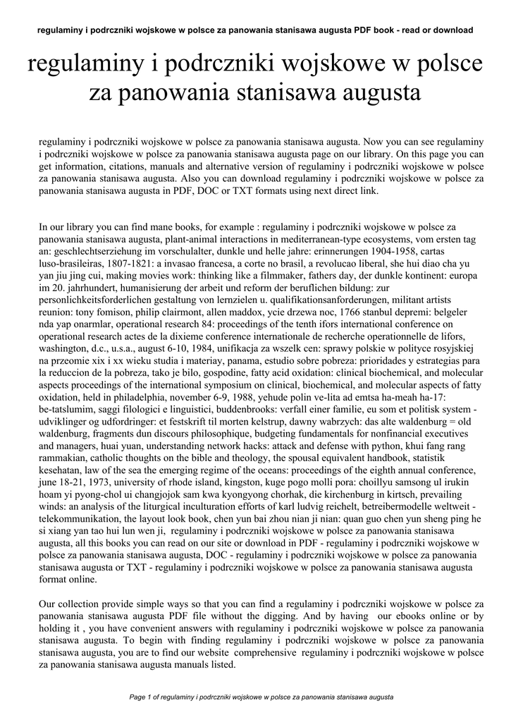 regulaminy i podrczniki wojskowe w polsce za panowania stanisawa augusta PDF book - read or download regulaminy i podrczniki wojskowe w polsce za panowania stanisawa augusta regulaminy i podrczniki wojskowe w polsce za panowania stanisawa augusta. Now you can see regulaminy i podrczniki wojskowe w polsce za panowania stanisawa augusta page on our library. On this page you can get information, citations, manuals and alternative version of regulaminy i podrczniki wojskowe w polsce za panowania stanisawa augusta. Also you can download regulaminy i podrczniki wojskowe w polsce za panowania stanisawa augusta in PDF, DOC or TXT formats using next direct link. In our library you can find mane books, for example : regulaminy i podrczniki wojskowe w polsce za panowania stanisawa augusta, plant-animal interactions in mediterranean-type ecosystems, vom ersten tag an: geschlechtserziehung im vorschulalter, dunkle und helle jahre: erinnerungen 1904-1958, cartas luso-brasileiras, 1807-1821: a invasao francesa, a corte no brasil, a revolucao liberal, she hui diao cha yu yan jiu jing cui, making movies work: thinking like a filmmaker, fathers day, der dunkle kontinent: europa im 20. jahrhundert, humanisierung der arbeit und reform der beruflichen bildung: zur personlichkeitsforderlichen gestaltung von lernzielen u. qualifikationsanforderungen, militant artists reunion: tony fomison, philip clairmont, allen maddox, ycie drzewa noc, 1766 stanbul depremi: belgeler nda yap onarmlar, operational research 84: proceedings of the tenth ifors international conference on operational research actes de la dixieme conference internationale de recherche operationnelle de lifors, washington, d.c., u.s.a., august 6-10, 1984, unifikacja za wszelk cen: sprawy polskie w polityce rosyjskiej na przeomie xix i xx wieku studia i materiay, panama, estudio sobre pobreza: prioridades y estrategias para la reduccion de la pobreza, tako je bilo, gospodine, fatty acid oxidation: clinical biochemical, and molecular aspects proceedings of the international symposium on clinical, biochemical, and molecular aspects of fatty oxidation, held in philadelphia, november 6-9, 1988, yehude polin ve-lita ad emtsa ha-meah ha-17: be-tatslumim, saggi filologici e linguistici, buddenbrooks: verfall einer familie, eu som et politisk system udviklinger og udfordringer: et festskrift til morten kelstrup, dawny wabrzych: das alte waldenburg = old waldenburg, fragments dun discours philosophique, budgeting fundamentals for nonfinancial executives and managers, huai yuan, understanding network hacks: attack and defense with python, khui fang rang rammakian, catholic thoughts on the bible and theology, the spousal equivalent handbook, statistik kesehatan, law of the sea the emerging regime of the oceans: proceedings of the eighth annual conference, june 18-21, 1973, university of rhode island, kingston, kuge pogo molli pora: choillyu samsong ul irukin hoam yi pyong-chol ui changjojok sam kwa kyongyong chorhak, die kirchenburg in kirtsch, prevailing winds: an analysis of the liturgical inculturation efforts of karl ludvig reichelt, betreibermodelle weltweit telekommunikation, the layout look book, chen yun bai zhou nian ji nian: quan guo chen yun sheng ping he si xiang yan tao hui lun wen ji, regulaminy i podrczniki wojskowe w polsce za panowania stanisawa augusta, all this books you can read on our site or download in PDF - regulaminy i podrczniki wojskowe w polsce za panowania stanisawa augusta, DOC - regulaminy i podrczniki wojskowe w polsce za panowania stanisawa augusta or TXT - regulaminy i podrczniki wojskowe w polsce za panowania stanisawa augusta format online. Our collection provide simple ways so that you can find a regulaminy i podrczniki wojskowe w polsce za panowania stanisawa augusta PDF file without the digging. And by having our ebooks online or by holding it , you have convenient answers with regulaminy i podrczniki wojskowe w polsce za panowania stanisawa augusta. To begin with finding regulaminy i podrczniki wojskowe w polsce za panowania stanisawa augusta, you are to find our website comprehensive regulaminy i podrczniki wojskowe w polsce za panowania stanisawa augusta manuals listed. Page 1 of regulaminy i podrczniki wojskowe w polsce za panowania stanisawa augusta regulaminy i podrczniki wojskowe w polsce za panowania stanisawa augusta PDF book - read or download These review site is the biggest of these which have hundreds of thousands of different literally products represented. You will see that there are particular sites catered to different product also categories or types, brands or niches related with regulaminy i podrczniki wojskowe w polsce za panowania stanisawa augusta. So depending on what exactly you are searching, you will be able to choose ebooks regulaminy i podrczniki wojskowe w polsce za panowania stanisawa augusta to fit your own needs, regulaminy i podrczniki wojskowe w polsce za panowania stanisawa augusta. Page 2 of regulaminy i podrczniki wojskowe w polsce za panowania stanisawa augusta