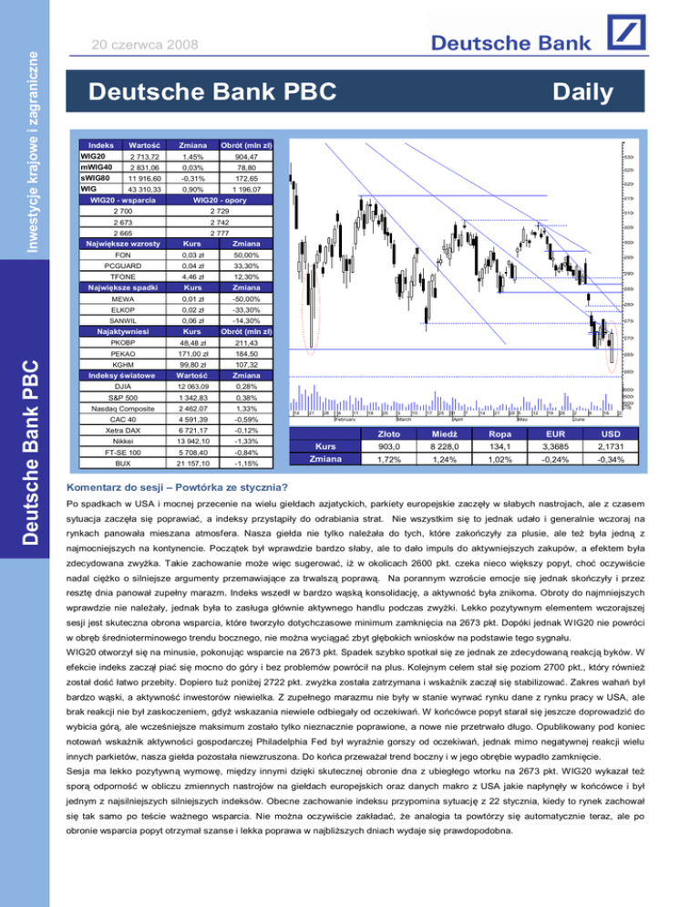 Inwestycje krajowe i zagraniczne 20 czerwca 2008 Deutsche Bank PBC Indeks Warto Daily Zmiana Obrót (mln z ) WIG20 2 713,72 1,45% 904,47 3300 mWIG40 2 831,06 0,03% 78,80 3250 sWIG80 11 916,60 -0,31% 172,65 WIG 43 310,33 0,90% 1 196,07 3200 WIG20 - wsparcia WIG20 - opory 3150 2 700 2 729 3100 2 673 2 742 2 665 2 777 3050 Najwi ksze wzrosty Kurs Zmiana 3000 FON 0,03 z 50,00% 2950 PCGUARD 0,04 z 33,30% TFONE 4,46 z 12,30% Najwi ksze spadki Kurs Zmiana MEWA 0,01 z -50,00% ELKOP 0,02 z -33,30% 2900 2850 2800 SANWIL 0,06 z -14,30% Najaktywniesi Kurs Obrót (mln z ) PKOBP 48,48 z 211,43 PEKAO 171,00 z 184,50 KGHM 99,80 z 107,32 2750 Deutsche Bank PBC 2700 Warto Indeksy wiatowe 2650 2600 Zmiana DJIA 12 063,09 0,28% S&P 500 1 342,83 0,38% Nasdaq Composite 2 462,07 1,33% CAC 40 4 591,39 -0,59% Xetra DAX 6 721,17 -0,12% Nikkei 13 942,10 -1,33% FT-SE 100 5 708,40 -0,84% BUX 21 157,10 -1,15% 20000 15000 10000 x100 14 21 28 4 11 February 18 25 3 10 March oto Kurs Zmiana 17 25 31 7 April 14 21 28 5 May 12 19 26 2 9 June 16 23 Mied Ropa EUR USD 903,0 8 228,0 134,1 3,3685 2,1731 1,72% 1,24% 1,02% -0,24% -0,34% Komentarz do sesji – Powtórka ze stycznia? Po spadkach w USA i mocnej przecenie na wielu gie dach azjatyckich, parkiety europejskie zacz y w s abych nastrojach, ale z czasem sytuacja zacz a si poprawia , a indeksy przyst pi y do odrabiania strat. Nie wszystkim si rynkach panowa a mieszana atmosfera. Nasza gie da nie tylko nale to jednak uda o i generalnie wczoraj na a do tych, które zako czy y za plusie, ale te by a jedn z najmocniejszych na kontynencie. Pocz tek by wprawdzie bardzo s aby, ale to da o impuls do aktywniejszych zakupów, a efektem by a zdecydowana zwy ka. Takie zachowanie mo e wi c sugerowa , i w okolicach 2600 pkt. czeka nieco wi kszy popyt, cho oczywi cie nadal ci ko o silniejsze argumenty przemawiaj ce za trwalsz popraw . Na porannym wzro cie emocje si jednak sko czy y i przez reszt dnia panowa zupe ny marazm. Indeks wszed w bardzo w sk konsolidacj , a aktywno wprawdzie nie nale by a znikoma. Obroty do najmniejszych y, jednak by a to zas uga g ównie aktywnego handlu podczas zwy ki. Lekko pozytywnym elementem wczorajszej sesji jest skuteczna obrona wsparcia, które tworzy o dotychczasowe minimum zamkni cia na 2673 pkt. Dopóki jednak WIG20 nie powróci w obr b rednioterminowego trendu bocznego, nie mo na wyci ga zbyt g bokich wniosków na podstawie tego sygna u. WIG20 otworzy si na minusie, pokonuj c wsparcie na 2673 pkt. Spadek szybko spotka si ze jednak ze zdecydowan reakcj byków. W efekcie indeks zacz zosta do pia si mocno do góry i bez problemów powróci na plus. Kolejnym celem sta si poziom 2700 pkt., który równie atwo przebity. Dopiero tu poni ej 2722 pkt. zwy ka zosta a zatrzymana i wska nik zacz bardzo w ski, a aktywno si stabilizowa . Zakres waha by inwestorów niewielka. Z zupe nego marazmu nie by y w stanie wyrwa rynku dane z rynku pracy w USA, ale brak reakcji nie by zaskoczeniem, gdy wskazania niewiele odbiega y od oczekiwa . W ko cówce popyt stara si jeszcze doprowadzi do wybicia gór , ale wcze niejsze maksimum zosta o tylko nieznacznie poprawione, a nowe nie przetrwa o d ugo. Opublikowany pod koniec notowa wska nik aktywno ci gospodarczej Philadelphia Fed by wyra nie gorszy od oczekiwa , jednak mimo negatywnej reakcji wielu innych parkietów, nasza gie da pozosta a niewzruszona. Do ko ca przewa trend boczny i w jego obr bie wypad o zamkni cie. Sesja ma lekko pozytywn wymow , mi dzy innymi dzi ki skutecznej obronie dna z ubieg ego wtorku na 2673 pkt. WIG20 wykaza te spor odporno w obliczu zmiennych nastrojów na gie dach europejskich oraz danych makro z USA jakie nap yn y w ko cówce i by jednym z najsilniejszych silniejszych indeksów. Obecne zachowanie indeksu przypomina sytuacj z 22 stycznia, kiedy to rynek zachowa si tak samo po te cie wa nego wsparcia. Nie mo na oczywi cie zak ada , e analogia ta powtórzy si obronie wsparcia popyt otrzyma szanse i lekka poprawa w najbli szych dniach wydaje si prawdopodobna. automatycznie teraz, ale po Informacje ze spó ek WIELTON Close: 8,60 z Wielton poinformowa , i czna warto Change: 0,00% zamówie od podmiotów z grupy Scania CV AB dotycz cych rynku ukrai skiego i rosyjskiego za okres od 11 stycznia 2008 roku do dnia 18 czerwca 2008 roku wynosi 4.887.715,00 Euro, co po przeliczeniu wed ug redniego kursu og oszonego przez NBP na dzie 19 czerwca 2008r. odpowiada kwocie 16.464.267,98 z . DB PBC Rozwój wspó pracy z jednym z kluczowych klientów ma pozytywn zawar a pod koniec maja br., a czna warto wymow . Najwi ksz z umów z tym partnerem spó ka kontraktów przekroczy a 10 proc. kapita ów w asnych. Trudno jednak obecnie szacowa precyzyjniej wp yw na wyniki finansowe i jest to jeden z powodów, dla których nie nale y raczej oczekiwa w zwi zku z t wiadomo ci mocniejszej reakcji rynku. LC CORP Close: 2,65 z Change: - 1,49% Przewodnicz cy rady nadzorczej LC Corp S.A., Pan Leszek Czarnecki poinformowa , i podmiot z nim zwi zany - spó ka LC Corp, naby 50.000 sztuk akcji spó ki LC Corp S.A. po cenie 2,736 z za sztuk . czna kwota transakcji bez prowizji wynios a 136.837,94 z . DB PBC Informacja lekko pozytywna, ale nie jest dla rynku zaskoczeniem. Spó ka kontrolowana przez Pana Leszka Czarneckiego sukcesywnie zwi ksza zaanga owanie w LC Corp S.A., zgodnie z zapowiedziami. Kwoty transakcji s jednak niezbyt du e, a zakupy nie robi na rynku wi kszego wra enia. Mo na wi c przypuszcza , wiadomo e i tym razem b dzie podobnie i inwestorzy nie zareaguj na t . TRAKCJA POLSKA Close: 5,21 z PKP Polskie Linie Kolejowe S.A., uzna y za najkorzystniejsz ofert z Change: 3,37% on przez Konsorcjum PRKiI – OBIEKTY CMK w sk ad którego wchodz : Przedsi biorstwo Robót Kolejowych i In ynieryjnych S.A. (Lider) – spó ka zale na Trakcji Polskiej, Przedsi biorstwo Us ug Technicznych Intercor Sp. z o.o. oraz Przedsi biorstwo Robót In ynieryjnych BUD-MOST Sp. z o.o. Oferta wykonania robót budowlanych polegaj cych na modernizacji obiekt