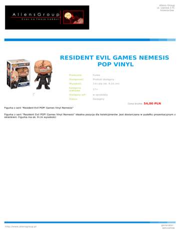 Aliens Group ul. Lipowa 17C Inowrocław RESIDENT EVIL GAMES NEMESIS POP VINYL Producent: Funko Dostępność: Produkt dostępny Wysokość: 3.6 cala (ok. 9,14 cm) Kategoria wiekowa: 17+ Dostępny od*: w sprzedaży Status: Dostępny Cena brutto: 54,00 PLN Figurka z serii "Resident Evil POP! Games Vinyl Nemesis" Figurka z serii "Resident Evil POP! Games Vinyl Nemesis" Idealna pozycja dla kolekcjonerów. Jest dostarczana w pudełku prezentacyjnym z okienkiem. Figurka ma ok. 9 cm wysokości http://www.aliensgroup.pl generator: aptusshop