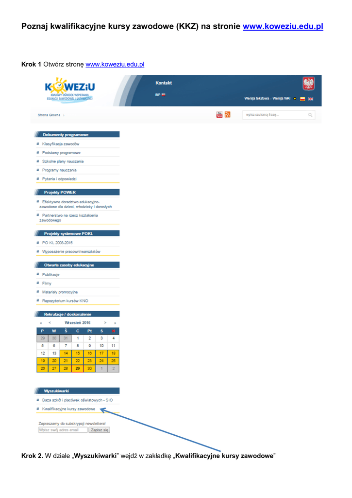 Poznaj kwalifikacyjne kursy zawodowe (KKZ) na stronie www.koweziu.edu.pl Krok 1 Otwórz stronę www.koweziu.edu.pl Krok 2. W dziale „Wyszukiwarki” wejdź w zakładkę „Kwalifikacyjne kursy zawodowe” Krok 3. Rozwiń listę zawodów i wybierz np. „Operator obrabiarek skrawających” oraz rozwiń listę województw i wybierz „DOLNOŚLĄSKIE” Krok 4. Na ekranie pojawi się wykaz szkół organizujących kwalifikacyjne kursy zawodowe dla zawodu „Operator obrabiarek skrawających”.