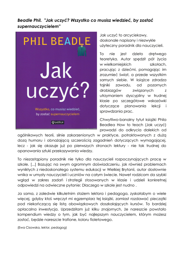 Beadle Phil. "Jak uczyć? Wszystko co musisz wiedzieć, by zostać supernauczycielem" Jak uczyć to arcyciekawy, doskonale napisany i niezwykle użyteczny poradnik dla nauczycieli. To nie jest dzieło drętwego teoretyka. Autor spędził pół życia w wielkomiejskich szkołach, pracując z dziećmi, pomagając im zrozumieć świat, a przede wszystkim samych siebie. W książce zdradza tajniki zawodu, od pozornych drobiazgów związanych z utrzymaniem dyscypliny w trudnej klasie po szczegółowe wskazówki dotyczące planowania lekcji i sprawdzania prac. Chwytliwo-banalny tytuł książki Phila Beadlea How to teach (Jak uczyć) prowadzi do odkrycia dalekich od ogólnikowych teorii, silnie zakorzenionych w praktyce, potraktowanych z dużą dozą humoru i obnażającą szczerością zagadnień dotyczących wymagającej, lecz - jak się okazuje już po pierwszych stronach lektury - nie tak trudnej do opanowania sztuki przekazywania wiedzy. To niezastąpiony poradnik nie tylko dla nauczycieli rozpoczynających pracę w szkole. [...] Bazując na swym ogromnym doświadczeniu, jak również problemach wynikłych z niedoskonałego systemu edukacji w Wielkiej Brytanii, autor dosłownie wnika w umysły nauczycieli i uczniów na całym świecie. Nawet rodzicom da szybki wgląd w zakres zadań i strategii stosowanych w klasie i udzieli konkretnej odpowiedzi na odwieczne pytanie: Dlaczego w szkole jest nudno . Ja sama, z zaledwie kilkuletnim stażem lektora i pedagoga, zyskałabym o wiele więcej, gdyby ktoś wręczył mi egzemplarz tej książki, zamiast rozdawać pieczątki pod niekończącą się listą obowiązkowych doszkalających kursów. To bardziej opłacalna inwestycja. Uprzedziłam już kilku znajomych, że nareszcie powstało kompendium wiedzy o tym, jak być najlepszym nauczycielem, którym możesz zostać, będzie nareszcie trafione, koloru fioletowego. (Ewa Cisowska, lektor, pedagog)