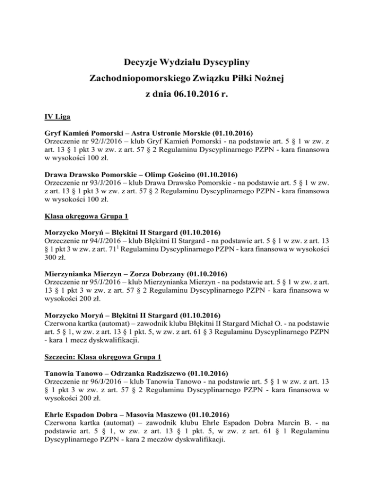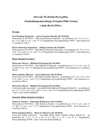 Decyzje Wydziału Dyscypliny Zachodniopomorskiego Związku Piłki Nożnej z dnia 06.10.2016 r. IV Liga Gryf Kamień Pomorski – Astra Ustronie Morskie (01.10.2016) Orzeczenie nr 92/J/2016 – klub Gryf Kamień Pomorski - na podstawie art. 5 § 1 w zw. z art. 13 § 1 pkt 3 w zw. z art. 57 § 2 Regulaminu Dyscyplinarnego PZPN - kara finansowa w wysokości 100 zł. Drawa Drawsko Pomorskie – Olimp Gościno (01.10.2016) Orzeczenie nr 93/J/2016 – klub Drawa Drawsko Pomorskie - na podstawie art. 5 § 1 w zw. z art. 13 § 1 pkt 3 w zw. z art. 57 § 2 Regulaminu Dyscyplinarnego PZPN - kara finansowa w wysokości 100 zł. Klasa okręgowa Grupa 1 Morzycko Moryń – Błękitni II Stargard (01.10.2016) Orzeczenie nr 94/J/2016 – klub Błękitni II Stargard - na podstawie art. 5 § 1 w zw. z art. 13 § 1 pkt 3 w zw. z art. 711 Regulaminu Dyscyplinarnego PZPN - kara finansowa w wysokości 300 zł. Mierzynianka Mierzyn – Zorza Dobrzany (01.10.2016) Orzeczenie nr 95/J/2016 – klub Mierzynianka Mierzyn - na podstawie art. 5 § 1 w zw. z art. 13 § 1 pkt 3 w zw. z art. 57 § 2 Regulaminu Dyscyplinarnego PZPN - kara finansowa w wysokości 200 zł. Morzycko Moryń – Błękitni II Stargard (01.10.2016) Czerwona kartka (automat) – zawodnik klubu Błękitni II Stargard Michał O. - na podstawie art. 5 § 1, w zw. z art. 13 § 1 pkt. 5, w zw. z art. 61 § 3 Regulaminu Dyscyplinarnego PZPN - kara 1 mecz dyskwalifikacji. Szczecin: Klasa okręgowa Grupa 1 Tanowia Tanowo – Odrzanka Radziszewo (01.10.2016) Orzeczenie nr 96/J/2016 – klub Tanowia Tanowo - na podstawie art. 5 § 1 w zw. z art. 13 § 1 pkt 3 w zw. z art. 57 § 2 Regulaminu Dyscyplinarnego PZPN - kara finansowa w wysokości 200 zł. Ehrle Espadon Dobra – Masovia Maszewo (01.10.2016) Czerwona kartka (automat) – zawodnik klubu Ehrle Espadon Dobra Marcin B. - na podstawie art. 5 § 1, w zw. z art. 13 § 1 pkt. 5, w zw. z art. 61 § 1 Regulaminu Dyscyplinarnego PZPN - kara 2 meczów dyskwalifikacji. Szczecin: Klasa okręgowa Grupa 2 Biali Sądów – AP Gavia Choszczno (01.10.2016) Orzeczenie nr 104/J/2016 – klub AP Gavia Choszczno - na podstawie art. 5 § 1 w zw. z art. 13 § 1 pkt 3 w zw. z art. 57 § 2 Regulaminu Dyscyplinarnego PZPN - kara finansowa w wysokości 100 zł. SCRS Barlinek – Unia Dolice (01.10.2016) Czerwona kartka (automat) – zawodnik klubu Unia Dolice Tomasz R. - na podstawie art. 5 § 1, w zw. z art. 13 § 1 pkt. 5, w zw. z art. 61 § 3 Regulaminu Dyscyplinarnego PZPN kara 1 meczu dyskwalifikacji. Klasa A Grupa 1 Radowia Radowo Małe – Jastrząb Łosośnica (02.10.2016) Orzeczenie nr 106/J/2016 – klub Prawobrzeże Świnoujście - na podstawie art. 5 § 1 w zw. z art. 13 § 1 pkt 3 w zw. z art. 57 § 2 Regulaminu Dyscyplinarnego PZPN - kara finansowa w wysokości 100 zł. Prawobrzeże Świnoujście – Pionier Żarnowo (01.10.2016) Orzeczenie nr 106/J/2016 – klub Prawobrzeże Świnoujście - na podstawie art. 5 § 1 w zw. z art. 13 § 1 pkt 3 w zw. z art. 57 § 2 Regulaminu Dyscyplinarnego PZPN - kara finansowa w wysokości 100 zł. Intermarche Rega II Trzebiatów – Zieloni Wyszobór (0.10.2016) Czerwona kartka (automat) – zawodnik klubu Zieloni Wyszobór Radosław M. - na podstawie art. 5 § 1, w zw. z art. 13 § 1 pkt. 5, w zw. z art. 61 § 3 Regulaminu Dyscyplinarnego PZPN - kara 1 mecz dyskwalifikacji. Czerwona kartka (automat) – zawodnik klubu Zieloni Wyszobór Mateusz B. - na podstawie art. 5 § 1, w zw. z art. 13 § 1 pkt. 5, w zw. z art. 61 § 3 Regulaminu Dyscyplinarnego PZPN - kara 1 meczu dyskwalifikacji. Klasa A Grupa 3 Kasta Majowe – Center MD Goleniów (01.10.2016) Orzeczenie nr 107/J/2016 – klub Kasta Majowe - na podstawie art. 5 § 1 w zw. z art. 13 § 1 pkt 3 w zw. z art. 57 § 2 Regulaminu Dyscyplinarnego PZPN - kara finansowa w wysokości 100 zł. Czerwona kartka (automat) – zawodnik klubu Kasta Majowe Kamil N. - na podstawie art. 5 § 1, w zw. z art. 13 § 1 pkt. 5, w zw. z art. 61 § 1 Regulaminu Dyscyplinarnego PZPN kara 2 meczów dyskwalifikacji. Klasa A Grupa 4 LUKS Krzywin – Rurzyca Nawodna (02.10.2016) Orzeczenie nr 97/J/2016 – trener drużyny LUKS Krzywin Dariusz M. - na podstawie art. 5 § 1, w zw. z art. 13 § 1 pkt. 5, w zw. z art. 62 § 3 Regulaminu Dyscyplinarnego PZPN kara 4 meczów dyskwalifikacji oraz na podstawie art. 5 § 1, w zw. z art. 13 § 1 pkt. 3, w zw. z art. 62 § 4 Regulaminu Dyscyplinarnego PZPN – kara finansowa w wysokości 500 zł. Orzeczenie nr 98/J/2016 – trener klubu LUKS Krzywin Mateusz P. - na podstawie art. 5 § 1, w zw. z art. 13 § 1 pkt. 5, w zw. z art. 110 Regulaminu Dyscyplinarnego PZPN - kara 3 meczów dyskwalifikacji. Klasa A Grupa 5 Saturn Szadzko – Iskra Warszyn (02.10.2016) Orzeczenie nr 100/J/2016 – prezes klubu Iskra Warszyn Jarosław G. - na podstawie art. 5 § 1, w zw. z art. 13 § 1 pkt. 5, w zw. z art. 62 § 3 Regulaminu Dyscyplinarnego PZPN - kara 4 meczów dyskwalifikacji oraz na podstawie art. 5 § 1, w zw. z art. 13 § 1 pkt. 3, w zw. z art. 62 § 4 Regulaminu Dyscyplinarnego PZPN – kara finansowa w wysokości 300 zł. Gryf Objezierze – Pomorzanin Zamęcin (02.10.2016) Orzeczenie nr 116/J/2016 – zawodnik klubu Pomorzanin Zamęcin Paweł P.. - na podstawie art. 5 § 1, w zw. z art. 13 § 1 pkt. 5, w zw. z art. 61 § 2 pkt 1 Regulaminu Dyscyplinarnego PZPN - kara 4 meczów dyskwalifikacji. Klasa A Grupa 6 GKS Golenice – Myśla Dargomyśl (02.10.2016) Orzeczenie nr 101/J/2016 – klub GKS Golenice - na podstawie art. 5 § 1 w zw. z art. 13 § 1 pkt 3 w zw. z art. 64 § 1 ust. 1 Regulaminu Dyscyplinarnego PZPN - kara finansowa w wysokości 200 zł. Orzeczenie nr 102/J/2016 – klub GKS Golenice - na podstawie § 17 ust. 5 Regulaminu Rozgrywek Mistrzowskich ZZPN - kara finansowa w wysokości 100 zł. Wicher Przelewice – Stal Lipiany (02.10.2016) Orzeczenie nr 103/J/2016 – klub Wicher Przelewice - na podstawie § 17 ust. 5 Regulaminu Rozgrywek Mistrzowskich ZZPN - kara finansowa w wysokości 100 zł. Klas