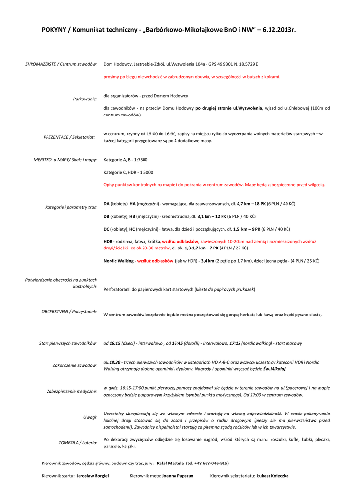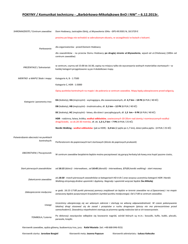 POKYNY / Komunikat techniczny - „Barbórkowo-Mikołajkowe BnO i NW” – 6.12.2013r. SHROMAZDISTE / Centrum zawodów: Dom Hodowcy, Jastrzębie-Zdrój, ul.Wyzwolenia 104a - GPS 49.9301 N, 18.5729 E prosimy po biegu nie wchodzić w zabrudzonym obuwiu, w szczególności w butach z kolcami. Parkowanie: dla organizatorów - przed Domem Hodowcy dla zawodników - na przeciw Domu Hodowcy po drugiej stronie ul.Wyzwolenia, wjazd od ul.Chlebowej (100m od centrum zawodów) PREZENTACE / Sekretariat: MERITKO a MAPY/ Skale i mapy: w centrum, czynny od 15:00 do 16:30, zapisy na miejscu tylko do wyczerpania wolnych materiałów startowych – w każdej kategorii przygotowane są po 4 dodatkowe mapy. Kategorie A, B - 1:7500 Kategorie C, HDR - 1:5000 Opisy punktów kontrolnych na mapie i do pobrania w centrum zawodów. Mapy będą zabezpieczone przed wilgocią. Kategorie i parametry tras: DA (kobiety), HA (mężczyźni) - wymagająca, dla zaawansowanych, dł. 4,7 km – 18 PK (6 PLN / 40 KĆ) DB (kobiety), HB (mężczyźni) - średniotrudna, dł. 3,1 km – 12 PK (6 PLN / 40 KĆ) DC (kobiety), HC (mężczyźni) - łatwa, dla dzieci i początkujących, dł. 1,5 km – 9 PK (6 PLN / 40 KĆ) HDR - rodzinna, łatwa, krótka, wzdłuż odblasków, zawieszonych 10-20cm nad ziemią i rozmieszczonych wzdłuż drogi/ścieżki, co ok.20-30 metrów, dł. ok. 1,3-1,7 km – 7 PK (4 PLN / 25 KĆ) Nordic Walking - wzdłuż odblasków (jak w HDR) - 3,4 km (2 pętle po 1,7 km), dzieci jedna pętla - (4 PLN / 25 KĆ) Potwierdzanie obecności na punktach kontrolnych: OBCERSTVENI / Poczęstunek: Start pierwszych zawodników: Zakończenie zawodów: Zabezpieczenie medyczne: Uwagi: TOMBOLA / Loteria: Perforatorami do papierowych kart startowych (kleste do papirovych prukazek) W centrum zawodów bezpłatnie będzie można poczęstować się gorącą herbatą lub kawą oraz kupić pyszne ciasto, od 16:15 (dzieci) - interwałowo , od 16:45 (dorośli) - interwałowo, 17:15 (nordic walking) - start masowy ok.18:30 - trzech pierwszych zawodników w kategoriach HD A-B-C oraz wszyscy uczestnicy kategorii HDR i Nordic Walking otrzymają drobne upominki i dyplomy. Nagrody i upominki wręczać będzie Św.Mikołaj. w godz. 16:15-17:00 punkt pierwszej pomocy znajdował sie będzie w terenie zawodów na ul.Spacerowej i na mapie oznaczony będzie purpurowym krzyżykiem (symbol punktu medycznego). Od 17:00 w centrum zawodów. Uczestnicy ubezpieczają się we własnym zakresie i startują na własną odpowiedzialność. W czasie pokonywania lokalnej drogi stosować się do zasad i przepisów o ruchu drogowym (pieszy nie ma pierwszeństwa przed samochodem!). Zawodnicy niepełnoletni startują za pisemna zgodą rodziców lub w ich towarzystwie. Po dekoracji zwycięzców odbędzie się losowanie nagród, wśród których są m.in.: koszulki, kufle, kubki, plecaki, parasole, książki. Kierownik zawodów, sędzia główny, budowniczy tras, jury: Rafał Mastela (tel. +48 668-046-915) Kierownik startu: Jarosław Borgiel Kierownik mety: Joanna Papszun Kierownik sekretariatu: Łukasz Kołeczko