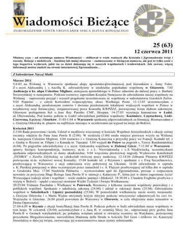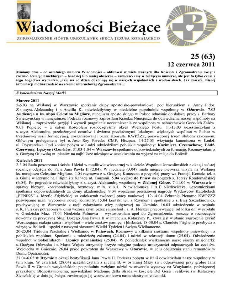 25 (63) 12 czerwca 2011 Miniony czas – od ostatniego numeru Wiadomości – obfitował w wiele ważnych dla Kościoła i Zgromadzenia świąt i rocznic. Relacje z niektórych – bardziej lub mniej obszerne – zamieszczamy w bieżącym numerze, ale jest to tylko cześć z tego bogactwa wydarzeń, jakie na co dzień dokonują się w naszych wspólnotach i środowiskach. Jak zawsze, więcej informacji można znaleźć na stronie internetowej Zgromadzenia… Z kalendarium Naszej Matki Marzec 2011 5-6.03 na Wiślanej w Warszawie spotkanie ekipy apostolsko-powołaniowej pod kierunkiem s. Anny Fidor. Z s. asyst. Aleksandrą i s. Ancillą K. odwiedziłyśmy w niedzielne popołudnie wspólnotę w Ożarowie. 7.03 Audiencja u ks. abpa Celestino Migliore, nuncjusza apostolskiego w Polsce odnośnie do dalszej pracy s. Barbary Świerzyńskiej w nuncjaturze. Podczas rozmowy zaprosiłam Księdza Nuncjusza do odwiedzenia naszej wspólnoty na Wiślanej – zaproszenie przyjął i wyraził pragnienie uczestniczenia ze wspólnotą w nabożeństwie Gorzkich Żalów. 9.03 Popielec – z całym Kościołem rozpoczęłyśmy okres Wielkiego Postu. 11-13.03 uczestniczyłam z s. asyst. Aleksandrą, przełożonymi centrów i dwiema przełożonymi lokalnymi większych wspólnot w Polsce w trzydniowej sesji formacyjnej, zorganizowanej przez Konsultę KWPŻZZ, poświęconej trzem ślubom zakonnym. Głównym prelegentem był o. Jose Rey Paredes CMF, Hiszpan. 14-27.03 wizytacja kanoniczna w Łodzi, ul. Obywatelska. Pod koniec pobytu w Łodzi odwiedziłam pobliskie wspólnoty: Kazimierz, Częstochowę, ŁódźCzerwoną, Łęczycę i Ozorków. 31.03-1.04 w Warszawie spotkanie odpowiedzialnych za formację. Rozmawiałam z s. Grażyną Otlewską nt. planów na najbliższe miesiące w oczekiwaniu na wyjazd na misje do Boliwii. Kwiecień 2011 2-3.04 Rada poszerzona i ścisła. Udział w modlitwie wieczornej w kościele Wspólnot Jerozolimskich z okazji szóstej rocznicy odejścia do Pana Jana Pawła II (2.04). W niedzielę (3.04) miała miejsce pierwsza wizyta na Wiślanej ks. nuncjusza Celestino Migliore. 4.04 rozmowa z s. Grażyną Koneczną o przyszłej pracy we Francji. Kontakt tel. z s. Giulią w Rzymie nt. Filipin i z Kanadą nt. Tanzanii. 5.04 wyjazd do Pniew na pogrzeb s. Teresy Rondomańskiej (6.04). Po pogrzebie odwiedziłyśmy z s. asyst. Aleksandrą wspólnotę w Zielonej Górze. 7-11.04 w Warszawie – sprawy bieżące, korespondencja, rozmowy, m.in. z s. L. Niewiadomską i s. E. Niedźwiecką, uczestniczkami spotkania odpowiedzialnych za domy akademickie; 9.04 wręczenie prestiżowej nagrody Wydawców Katolickich „FENIKS” s. Józefie Zdybickiej za całokształt twórczej pracy naukowej. 12-14.04 Zebranie Plenarne KWPŻZZ poświęcone m.in. wyborowi nowej Konsulty. 15.04 kontakt tel. z Rzymem i spotkanie z s. Ewą Szczefanowicz, przebywającą w Warszawie z racji załatwiania wizy pobytowej na Ukrainie. 16.04 odwiedzenie w szpitalu s. K. Purskiej potrąconej w dniu wczorajszym przez samochód i s. A. Flejszer przebywającej od kilku dni w szpitalu w Grodzisku Maz. 17.04 Niedziela Palmowa – wystosowałam apel do Zgromadzenia, prosząc o rozpoczęcie nowenny za przyczyną Sługi Bożego Jana Pawła II w intencji s. Katarzyny P., która jest w stanie zagrożenia życia! Wzruszająca reakcja sióstr i wspólnot – wiele znaków pamięci i bliskości. 18-30.04 s. Claudete Frighetto przebywa z wizytą w Boliwii – spędzi z naszymi siostrami Wielki Tydzień i Święta Wielkanocne. 20-25.04 Triduum Paschalne i Wielkanoc w Pniewach. Rozmowy z kilkoma siostrami wspólnoty pniewskiej i z pobliskich wspólnot. Spotkanie z młodzieżą zakonną (24.04) i udział w rekreacji domu (25.04). Odwiedzenie wspólnot w Sokolnikach i Lipnicy poznańskiej (25.04). W poniedziałek wielkanocny nasze siostry misjonarki: s. Grażyna Otlewska i s. Marta Wojtas otrzymały krzyże misyjne podczas uroczystości odpustowych ku czci św. Wojciecha w Gnieźnie. 26.04 przed powrotem do Warszawy w Otorowie, w celu obejrzenia stanu remontów w Domu Opatrzności. 27.04-6.05 w Rzymie z okazji beatyfikacji Jana Pawła II. Podczas pobytu w Italii odwiedziłam nasze wspólnoty w tym kraju. W czwartek (28.04) uczestniczyłam z s. Janą B. w ostatniej Mszy św., odprawianej przy grobie Jana Pawła II w Grotach watykańskich; po południu wzięłam udział w otwarciu wystawy na Watykanie, poświęconej przyszłemu Błogosławionemu; nawiedziłam Madonnę della Strada w kościele Del Gesù i relikwie św. Katarzyny Sieneńskiej w dniu jej święta, zawierzając jej wstawiennictwu nasze siostry solenizantki. Maj 2011 1.05 na Mszy św. beatyfikacyjnej Jana Pawła II z kilkoma siostrami wspólnot rzymskich, a także z przybyłymi na tę uroczystość siostrami z Polski, m.in. z s. J. Zdybicką, i z Francji s. Zofią Szubert. Ogromne i niezapomniane przeżycie… Sercem i modlitwą ogarniałam całe nasze Zgromadzenie, nasze wspólnoty i kraje, poszczególne siostry, a także inne osoby, które poleciły się mojej modlitwie. 2.05 przedłużona modlitwa przy relikwiach błogosławionego Jana Pawła II w Bazylice św. Piotra i uczestniczenie we Mszy św. – dziękczynieniu za dar beatyfikacji. 5.05 w przededniu powrotu do Polski uczestniczyłam razem z s. Janą B. i s. Zofią Sz. we Mszy św. przy ołtarzu relikwii bł. Jana Pawła II. Odwiedziłam ciężko chorego chłopca w szpitalu Dzieciątka Jezus, byłego ucznia naszej szkoły na Primavalle. 9-14.05 z s. asyst. Aleksandrą i s. przeł. Marią L. odwiedziłam kilka wspólnot na południu Polski: Zakopane, Ludźmierz, Lipnicę Murowaną, Tarnów i Radom. W Lipnicy Murowanej uczestniczyłam w pogrzebie s. Joanny Otręby. 15.05 w Warszawie – spotkanie z s. Mają Makowską nt. planów na następny rok. 16.05 w święto św. Andrzeja Boboli, Patrona Polski – ponad 20 sióstr wspólnoty warszawskiej pielgrzymowało pieszo do kościoła oo. jezuitów, aby się pomodlić przy relikwiach Świętego 