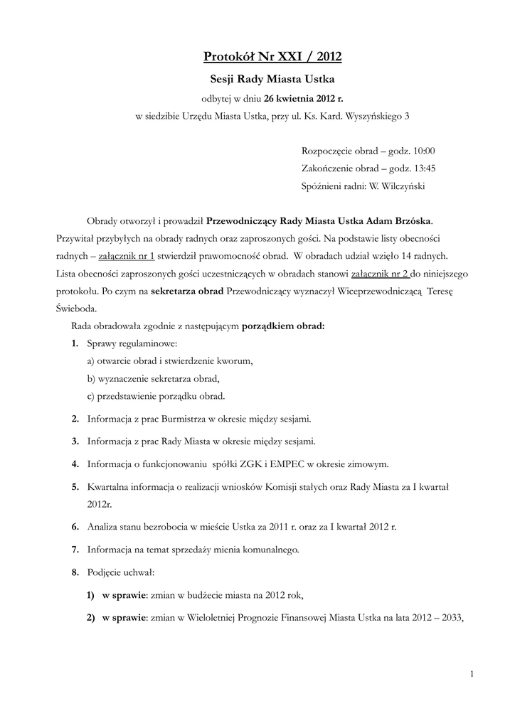 Protokół Nr XXI / 2012 Sesji Rady Miasta Ustka odbytej w dniu 26 kwietnia 2012 r. w siedzibie Urzędu Miasta Ustka, przy ul. Ks. Kard. Wyszyńskiego 3 Rozpoczęcie obrad – godz. 10:00 Zakończenie obrad – godz. 13:45 Spóźnieni radni: W. Wilczyński Obrady otworzył i prowadził Przewodniczący Rady Miasta Ustka Adam Brzóska. Przywitał przybyłych na obrady radnych oraz zaproszonych gości. Na podstawie listy obecności radnych – załącznik nr 1 stwierdził prawomocność obrad. W obradach udział wzięło 14 radnych. Lista obecności zaproszonych gości uczestniczących w obradach stanowi załącznik nr 2 do niniejszego protokołu. Po czym na sekretarza obrad Przewodniczący wyznaczył Wiceprzewodniczącą Teresę Świeboda. Rada obradowała zgodnie z następującym porządkiem obrad: 1. Sprawy regulaminowe: a) otwarcie obrad i stwierdzenie kworum, b) wyznaczenie sekretarza obrad, c) przedstawienie porządku obrad. 2. Informacja z prac Burmistrza w okresie między sesjami. 3. Informacja z prac Rady Miasta w okresie między sesjami. 4. Informacja o funkcjonowaniu spółki ZGK i EMPEC w okresie zimowym. 5. Kwartalna informacja o realizacji wniosków Komisji stałych oraz Rady Miasta za I kwartał 2012r. 6. Analiza stanu bezrobocia w mieście Ustka za 2011 r. oraz za I kwartał 2012 r. 7. Informacja na temat sprzedaży mienia komunalnego. 8. Podjęcie uchwał: 1) w sprawie: zmian w budżecie miasta na 2012 rok, 2) w sprawie: zmian w Wieloletniej Prognozie Finansowej Miasta Ustka na lata 2012 – 2033, 1 3) w sprawie: zmiany uchwały Nr XLVII/382/2006 Rady Miejskiej w Ustce z dnia 31 sierpnia 2006 r. w sprawie Statutu Miasta Ustki, 4) w sprawie: określenia tygodniowego obowiązkowego wymiaru godzin zajęć pedagogów, psychologów, logopedów i doradców zawodowych zatrudnionych w jednostkach oświatowych prowadzonych przez Gminę Miasto Ustka, 5) w sprawie: zmiany uchwały Nr XIV/125/2011 Rady Miasta Ustka z dnia 27 października 2011 r. w sprawie zawarcia Porozumienia Międzygminnego pomiędzy Gminą Miasto Ustka a Miastem Słupsk w sprawie działań z zakresu planowania przestrzennego na trenach położonych w granicach administracyjnych miasta Ustka, 6) w sprawie: odstąpienia od przetargowego trybu wydzierżawienia na okres 8 lat nieruchomości zabudowanej stanowiącej własność Gminy Miasto Ustka, położonej w Ustce przy Promenadzie Nadmorskiej, 7) w sprawie: wniesienia w formie wkładu niepieniężnego (aportu) prawa własności nieruchomości będących własnością Gminy Miasto Ustka. 9. Interpelacje i zapytania radnych. 10. Wolne wnioski i oświadczenia. 11. Zakończenie obrad. Ad 2 Informacja z prac Burmistrza w okresie między sesjami ( I cz. czas 3:22 ) Burmistrz Jan Olech w uzupełnieniu pisemnej informacji stanowiącej załącznik nr 3 do niniejszego protokołu dodał: - wysłał pismo do firmy Polo market o umożliwienie utworzenia parkingu na terenach po Konserwiarni przy ul. Słupskiej. Jest wstępna deklaracja, w maju sytuacja wyjaśni się ; - Burmistrz wystąpił z wnioskiem do Starosty o użyczenie tzw. „czerwonej szopy” i terenu przyległego na okres 10 lat. Miasto chce rozbudować obiekt i umieścić tam Centrum Informacji Morskiej. Burmistrz w rozmowie ze Starostą i Wicestarostą na miejscu przy „czerwonej szopie” uzyskał wstępną akceptację Starosty. W imieniu własnym i Rady Burmistrz podziękował Staroście ; - została podpisana umowa sponsorska z kampanią piwowarską na trzy lata na sto tysięcy rocznie. Burmistrz podziękował Wydziałowi Promocji, Naczelnikowi Cegle za dobry start. G. Koski jakie ustalenia przyjęto w trakcie spotkania Burmistrza z radnym Wojewódzkim p. Biernackim w sprawie remontu ulicy Darłowskiej. 2 Radny zapytał, kiedy rozpocznie się remont ulicy, która część będzie remontowało miasto, czy tylko poniesie koszty dokumentacji? Następnie zapytał o wniosek BWA rozpatrzony negatywnie o 10 miejsc postojowych przy ul. Chopina . Teren pod kioskiem przy Kinie wyrażono zgodę na zmianę dzierżawcy w drodze cesji, dlaczego nie w przetargu? Burmistrz odpowiedział, że spotkał się z Radnym Wojewódzkim p. Biernackim, aby nadać bieg sprawie budowy ścieżki rowerowej z oświetleniem wzdłuż ulicy Darłowskiej. Burmistrz wstępnie uzyskał deklarację, że w maju Marszałek przyjedzie do Ustki na wizję lokalną, aby droga była modernizowana. Przy ulicy Polnej powstało duże osiedle mieszkaniowe, Przedszkole. Duży ruch przy ul. Darłowskiej zagraża bezpieczeństwu. Do odbycia wspólnej z Marszałkiem wizji w terenie Burmistrz poprosi przedstawicieli Rady. W sprawie wniosku BWA Burmistrz odpowiedział, że Rada podjęła uchwalę w sprawie stref płatnego parkowania. BWA chce uzyskać do swojej dyspozycji 10 miejsc parkingowych, wówczas byłby zajęty cały parking. Nie ma więc takiej możliwości. Naczelnik Wydz. G.N. S. Tymińska - Brożek odpowiedziała, że chodzi o przepisanie cesją prawa dzierżawy terenu pod kioskiem na rzecz innej osoby zainteresowanej prowadzeniem dalszej działalności. G. Koski zwrócił uwagę, że jeżeli następuje zmiana podmiotu, to automatycznie powinien być ogłoszony przetarg. Pieniędzy w budżecie nie ma i teren należy sprzedać w drodze przetargu. Jeżeli jest możliwość prawna radny zaproponował powrócić do tematu. S. Tymińska - Brożek powiedziała, że takie cesje stosowane są od lat. Gdyby obiekt był własnością miasta, to nie wyrażono by zgody na cesję. G. Koski oznajmił, że nie zgadza się z takim stanowiskiem. Przewodniczący odpowiedział, że w tym przypadku radny ma prawo złożyć interpelację. A. Bednarczyk poprosił o informację o spotkaniu z Dyrektorem Urzędu Morskiego oraz na temat refulacji plaży. Burmistrz odpowiedział, że każde spotkanie z Dyrektorem Urzędu Morskiego dotyczy aktualnej sytuacji remontu nabrzeża wschodniego. Urzędnikom zależy , aby plac do końca czerwca został wykonany. Refulacja plaży będzie wyko