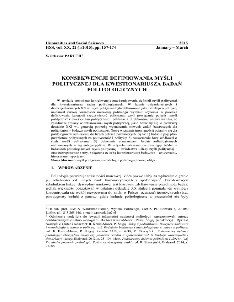Humanities and Social Sciences HSS, vol. XX, 22 (1/2015), pp. 157-174 2015 January – March Waldemar PARUCH1 KONSEKWENCJE DEFINIOWANIA MYŚLI POLITYCZNEJ DLA KWESTIONARIUSZA BADAŃ POLITOLOGICZNYCH W artykule omówiono konsekwencje zmodernizowania definicji myśli politycznej dla kwestionariusza badań politologicznych. W latach osiemdziesiątych i dziewięćdziesiątych XX w. myśl polityczna była definiowana jako refleksja o polityce, natomiast rozwój tożsamości naukowej politologii wymusił używanie w procesie definiowania kategorii rzeczywistość polityczna, czyli powiązanie pojęcia „myśl polityczna” z określeniami polityczność i polityzacja. Z dokonanej analizy wynika, że zasadnicze zmiany w definiowaniu myśli politycznej, jakie dokonały się w pierwszej dekadzie XXI w., generują potrzebę wyznaczania nowych zadań badawczych dla politologów – badaczy myśli politycznej. Nowe wyzwania (powinności) pojawiły się dla politologów w odniesieniu do trzech potrzeb poznawczych. Są to: 1) badanie poglądów podmiotów politycznych na polityczność i politykę; 2) rozszerzenie bazy źródłowej o ślady myśli politycznej; 3) dokonanie standaryzacji badań politologicznych realizowanych w tej subdyscyplinie. W artykule wskazano na dwa typy źródeł w badaniach politologicznych myśli politycznej – świadectwa i ślady myśli politycznej – oraz zaproponowano trzy, połączone ze sobą kwestionariusze badawcze – uniwersalny, historyczny i specjalny. Słowa kluczowe: myśl polityczna, metodologia politologii, teoria polityki. 1. WPROWADZENIE Politologia potrzebuje tożsamości naukowej, która pozwoliłaby na wykreślenie granic jej odrębności od innych nauk humanistycznych i społecznych2. Podstawowym składnikiem każdej dyscypliny naukowej jest klarowne zdefiniowanie przedmiotu badań, jednak większość poszukiwań w ostatniej dekadzie XX stulecia pomijała ten wymóg i koncentrowała się wokół recypowania do nauki w Polsce rozwiązań teoretycznych (tzw. paradygmaty badań) z państw, gdzie badania politologiczne w przeszłości nie były 1 Dr hab. prof. UMCS, Waldemar Paruch, Wydział Politologii, UMCS, Pl. Litewski 3, 20–080 Lublin, tel.: 815 265 146, e-mail: [email protected] 2 Odmiennie podejście do kwestii tożsamości naukowej politologii zaprezentowali autorzy opublikowanych ostatnio monografii: Barbara Krauz-Mozer i Paweł Ścigaj (redaktorzy) i Ryszard Skarzyński (autor i redaktor): B. Krauz-Mozer, P. Ścigaj, Sklep z podróbkami? Podejścia badawcze i metodologie w nauce o polityce, [w:] Podejścia badawcze i metodologiczne w nauce o polityce, red. B. Krauz-Mozer, P. Ścigaj, Kraków 2013, s. 9–30; R. Skarzyński, Podstawowy dylemat politologii: Dyscyplina nauki czy potoczna wiedza o społeczeństwie? O tradycji uniwersytetu i demarkacji wiedzy, Białystok 2012, s. 25–104; idem, Podstawowy dylemat politologii I (2010), [w:] Przedmiot poznania politologii: Podstawy dyscypliny nauki, red. R. Skarzyński, Białystok 2014, s. 77–88. 158 W. Paruch bezpośrednio zdeterminowane przez system polityczny. W konsekwencji powstało zjawisko błądzenia ontologicznego i epistemologicznego, którego efektem było przeświadczenie, że poszukiwanie odrębności politologii na podstawie przedmiotu badań wydaje się nieskuteczne3. Zdecydowanie bliższe jest nam przekonanie inne, że wyznaczanie granic politologii jest „zrozumiałym i oczywistym przejawem dojrzewania każdej nauki”4. Pisano w ważnych opracowaniach naukowych o politologii empirycznej, teoretycznej, behawioralnej, postmodernistycznej i ideologicznej lub wracano do pojęć „nauka o polityce”/„nauki o polityce”/„nauki polityczne”. Warto wymienić chociażby publikacje: Barbary Krauz-Mozer, Władysława Szostaka, Ziemowita Jacka Pietrasia i Tadeusza Klementewicza5. Przywołane uwagi odnoszą się nie tylko do politologii jako dyscypliny naukowej, ale również do jej podstawowych subdyscyplin. Jedną z nich jest myśl polityczna – oprócz systemów politycznych, stosunków międzynarodowych, ruchów i partii politycznych, teorii polityki, polityki szczegółowej różnego typu. Wymienione pojęcia oznaczają z jednej strony subdyscyplinę politologii, z drugiej zaś kategorię podstawową dla politologii. W każdej z wymienionych subdyscyplin starano się: 1) zdefiniować przedmiot poznania; 2) opracować strukturę pojęciową; 3) wyznaczyć podstawowe założenia metodologiczne; 4) sformułować katalog celów/oczekiwań badawczych6. Na gruncie wymienionych subdyscyplin powstała dość zastanawiająca sytuacja: w odróżnieniu od politologii, zasadniczo nie pisano o braku możliwości określenia przedmiotu badań, lecz koncentrowano uwagę na rozstrzyganiu konkretnych dylematów poznawczych. W latach 1975–1976 dwaj badacze – Henryk Zieliński i Marek Sobolewski – sformułowali sugestie wyjątkowo inspirujące dla następnych pokoleń zorientowanych na poznawanie myśli politycznej. Pierwszy z nich wskazał na potrzebę badania myśli politycznej w ujęciu historycznym i politologicznym7, drugi zaś zasugerował rezygnację z definiowania myśli politycznej, uznając takie rozważania za nieprzynoszące pożytku8. O ile stosunkowo wcześnie, bo w 1985 r., Michał Jaskólski zanegował zasadność poglądu 3 B. Krauz-Mozer, P. Ścigaj, op. cit., s. 14. J.H. Kołodziej, Wartości polityczne – problem badawczy dla politologa, [w:] Podejścia badawcze i metodologiczne…, s. 199; podobne stanowisko w: R. Skarzyński, Monizm i pluralizm w rozwoju dyscypliny nauki: politologia i pseudopolitologia, [w:] Przedmiot poznania politologii…, s. 10. 5 Zob. B. Krauz-Mozer, W. Szostak, Teoria polityki: podstawy metodologiczne politologii empirycznej, Kraków 1993, passim; T. Klementewicz, Spór o model metodologiczny nauki o polityce, Warszawa 1991, passim; idem, Politologia tradycyjna a politologia teoretyczna w poszukiwaniu modelu metodologicznego nauki o polityce, 