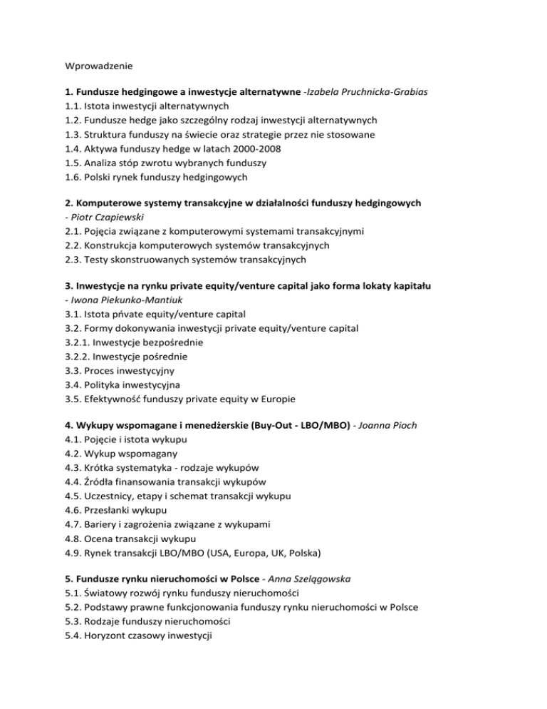 Wprowadzenie 1. Fundusze hedgingowe a inwestycje alternatywne