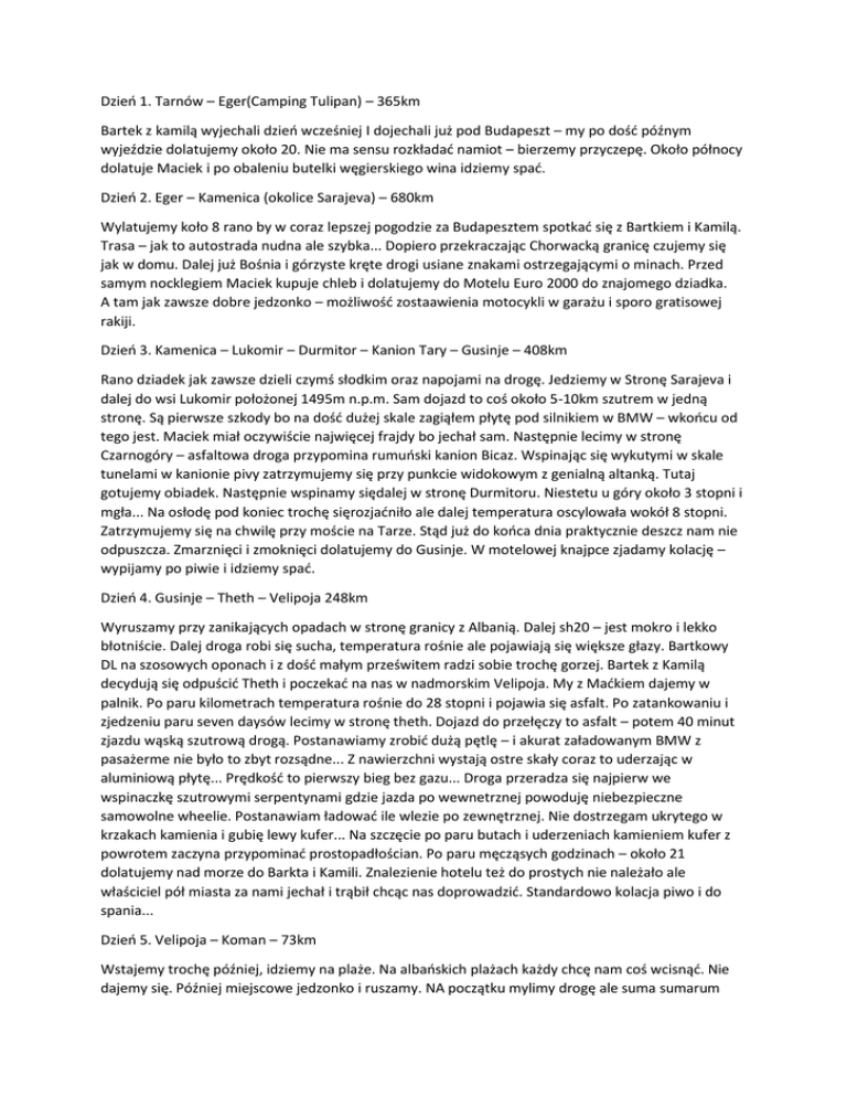 Dzień 1. Tarnów – Eger(Camping Tulipan) – 365km Bartek z kamilą wyjechali dzień wcześniej I dojechali już pod Budapeszt – my po dość późnym wyjeździe dolatujemy około 20. Nie ma sensu rozkładać namiot – bierzemy przyczepę. Około północy dolatuje Maciek i po obaleniu butelki węgierskiego wina idziemy spać. Dzień 2. Eger – Kamenica (okolice Sarajeva) – 680km Wylatujemy koło 8 rano by w coraz lepszej pogodzie za Budapesztem spotkać się z Bartkiem i Kamilą. Trasa – jak to autostrada nudna ale szybka... Dopiero przekraczając Chorwacką granicę czujemy się jak w domu. Dalej już Bośnia i górzyste kręte drogi usiane znakami ostrzegającymi o minach. Przed samym nocklegiem Maciek kupuje chleb i dolatujemy do Motelu Euro 2000 do znajomego dziadka. A tam jak zawsze dobre jedzonko – możliwość zostaawienia motocykli w garażu i sporo gratisowej rakiji. Dzień 3. Kamenica – Lukomir – Durmitor – Kanion Tary – Gusinje – 408km Rano dziadek jak zawsze dzieli czymś słodkim oraz napojami na drogę. Jedziemy w Stronę Sarajeva i dalej do wsi Lukomir położonej 1495m n.p.m. Sam dojazd to coś około 5-10km szutrem w jedną stronę. Są pierwsze szkody bo na dość dużej skale zagiąłem płytę pod silnikiem w BMW – wkońcu od tego jest. Maciek miał oczywiście najwięcej frajdy bo jechał sam. Następnie lecimy w stronę Czarnogóry – asfaltowa droga przypomina rumuński kanion Bicaz. Wspinając się wykutymi w skale tunelami w kanionie pivy zatrzymujemy się przy punkcie widokowym z genialną altanką. Tutaj gotujemy obiadek. Następnie wspinamy siędalej w stronę Durmitoru. Niestetu u góry około 3 stopni i mgła... Na osłodę pod koniec trochę sięrozjaćniło ale dalej temperatura oscylowała wokół 8 stopni. Zatrzymujemy się na chwilę przy moście na Tarze. Stąd już do końca dnia praktycznie deszcz nam nie odpuszcza. Zmarznięci i zmoknięci dolatujemy do Gusinje. W motelowej knajpce zjadamy kolację – wypijamy po piwie i idziemy spać. Dzień 4. Gusinje – Theth – Velipoja 248km Wyruszamy przy zanikających opadach w stronę granicy z Albanią. Dalej sh20 – jest mokro i lekko błotniście. Dalej droga robi się sucha, temperatura rośnie ale pojawiają się większe głazy. Bartkowy DL na szosowych oponach i z dość małym prześwitem radzi sobie trochę gorzej. Bartek z Kamilą decydują się odpuścić Theth i poczekać na nas w nadmorskim Velipoja. My z Maćkiem dajemy w palnik. Po paru kilometrach temperatura rośnie do 28 stopni i pojawia się asfalt. Po zatankowaniu i zjedzeniu paru seven daysów lecimy w stronę theth. Dojazd do przełęczy to asfalt – potem 40 minut zjazdu wąską szutrową drogą. Postanawiamy zrobić dużą pętlę – i akurat załadowanym BMW z pasażerme nie było to zbyt rozsądne... Z nawierzchni wystają ostre skały coraz to uderzając w aluminiową płytę... Prędkość to pierwszy bieg bez gazu... Droga przeradza się najpierw we wspinaczkę szutrowymi serpentynami gdzie jazda po wewnetrznej powoduję niebezpieczne samowolne wheelie. Postanawiam ładować ile wlezie po zewnętrznej. Nie dostrzegam ukrytego w krzakach kamienia i gubię lewy kufer... Na szczęcie po paru butach i uderzeniach kamieniem kufer z powrotem zaczyna przypominać prostopadłościan. Po paru męcząsych godzinach – około 21 dolatujemy nad morze do Barkta i Kamili. Znalezienie hotelu też do prostych nie należało ale właściciel pół miasta za nami jechał i trąbił chcąc nas doprowadzić. Standardowo kolacja piwo i do spania... Dzień 5. Velipoja – Koman – 73km Wstajemy trochę później, idziemy na plaże. Na albańskich plażach każdy chcę nam coś wcisnąć. Nie dajemy się. Później miejscowe jedzonko i ruszamy. NA początku mylimy drogę ale suma sumarum trafiamy na kamping pod mostem u Włocha... Nie chce nam się rozkłądać namiotów a oferowane pokoje są genialne – dosłownie wkomponowane pod mostem. Potem wyżerka – najlepsza na całym wyjeździe – porcje starczyły dla nas oraz miejscowych kotów. Do tego po piwku. Trochę porozmawialiśmy z innymi „mieszkańcami” campingu. Dzień 6. Koman – Podgora 367km Rozdzielamy się – Kasia ma już dość szutrów – część urlopu trzeba też spędzić nad morzem. Po drodze znajomy Kotor, Dubrovnik. W podgorze zatrzymujemy się na campingu 50m od morza. To bardzo fajne miejsce gdzie słońce zachodzi nad samym morzem. Kolacja i do spania. Dzień 7,8,9 Podgora – Sv. Jure(Biokovo) – Okrug Gornij – 142km Wstajemy i jedziemy na SvJure w rezerwacie Biokovo. Dosłownei w pół godziny wylatujemy z poziomu morza na 1300m. Super widoki – po drodze kawa w towarzystwie dwóch osiołków. Po poworcie na Camping pakowanie i lecimy znaną magsistralą na wyspę Ciovo. Nie mieliśmy nic zarezerwowanego ale Kasię zatrzymuje na skuterku chorwat mówiący łamaną polszczyzną. Pokazuje nam swoje apartamenty. Cena kusząca do tego żona miłego pana to polka. Bierzemy na 3 noce apartament z 2 sypialniami i ogromnym tarasem. Następnego dnia dolatuje do nas reszta ekipy. Korzystamy z ciepłego morza, nurkujemy, zwiedzamy. Na nieobładowanych motocyklech objeżdżamy wyspę. Dzień 10 Okrug Gornij – Senj – 302km Znaną nam magistralą adriatycką udajemy się do Senj na Camp Ujca. Na genialnych zakrętch szlifujemy podnóżki a na samym campingu mamy okazję ostatni raz zamoczyć się w morzu. Gotujemy coś we słasnym zakresie, pijemy piwko i do spania. Dzień 11. Senj – Tarnów – 965km Dzień powrotu – po 30 km pożegnanie z widokiem morza i 90% autostrady do domu... Po drodze pare razy mijamy się z ekipą polaków na plastikach – widać, że nie sątak wygodne jak nasze. Na obwodnicy budapesztu dolewam trochę oleju – u Bartka okazuje się, że łąncych się kończy ale ostatecznie dolatujemy do domu. Bartek robi jeszcze przelot obwodnicą aby pobić swój dzienny rekord i 1000km u niego pęka