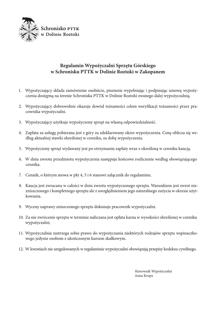 Regulamin Wypożyczalni Sprzętu Górskiego w Schronisku PTTK w Dolinie Roztoki w Zakopanem 1. Wypożyczający składa zamówienie osobiście, pisemnie wypełniając i podpisując umowę wypożyczenia dostępną na terenie Schroniska PTTK w Dolinie Roztoki zwanego dalej wypożyczalnią. 2. Wypożyczający dobrowolnie okazuje dowód tożsamości celem weryfikacji tożsamości przez pracownika wypożyczalni. 3. Wypożyczający użytkuje wypożyczony sprzęt na własną odpowiedzialność. 4. Zapłata za usługę pobierana jest z góry za zdeklarowany okres wypożyczenia. Cenę oblicza się według aktualnej stawki określonej w cenniku, za dobę wypożyczenia. 5. Wypożyczony sprzęt wydawany jest po otrzymaniu zapłaty wraz z określoną w cenniku kaucją. 6. W dniu zwrotu przedmiotu wypożyczenia następuje końcowe rozliczenie według obowiązującego cennika. 7. Cennik, o którym mowa w pkt 4, 5 i 6 stanowi załącznik do regulaminu. 8. Kaucja jest zwracana w całości w dniu zwrotu wypożyczonego sprzętu. Warunkiem jest zwrot niezniszczonego i kompletnego sprzętu ale z uwzględnieniem jego naturalnego zużycia w okresie użytkowania. 9. Wyceny naprawy zniszczonego sprzętu dokonuje pracownik wypożyczalni. 10. Za nie zwrócenie sprzętu w terminie naliczana jest opłata karna w wysokości określonej w cenniku wypożyczalni; 11. Wypożyczalnia zastrzega sobie prawo do wypożyczania niektórych rodzajów sprzętu wspinaczkowego jedynie osobom z ukończonym kursem skałkowym. 12. W kwestiach nie uregulowanych w regulaminie wypożyczalni obowiązują przepisy kodeksu cywilnego. Kierownik Wypożyczalni Anna Krupa