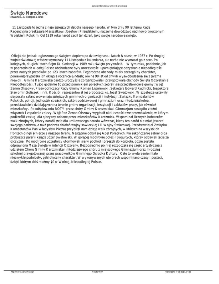 Serwis internetowy Gminy Karczmiska Święto Narodowe czwartek, 27 listopada 2008 11 Listopada to jedna z najważniejszych dat dla naszego narodu. W tym dniu 90 lat temu Rada Regencyjna przekazała Marszałkowi Józefowi Piłsudskiemu naczelne dowództwo nad nowo tworzonym Wojskiem Polskim. Od 1919 roku naród czcił ten dzień, jako swoje narodowe święto. Oficjalnie jednak ogłoszono go świętem dopiero po dziewiętnastu latach – w 1937 r. Po drugiej wojnie światowej władze wymazały 11 Listopada z kalendarza, ale naród nie wymazał go z serc. Po kolejnych, długich latach Sejm IX Kadencji w 1989 roku święto przywrócił. W tym roku, podobnie, jak w poprzednich w całej Polsce obchodzone były uroczystości upamiętniające odzyskanie niepodległości przez naszych przodków po 123 latach zaborów. Tegoroczne obchody miały szczególny charakter, ponieważ przypadała ich okrągła rocznica – równe 90 lat od chwili wyswobodzenia się z jarzma niewoli. Gmina Karczmiska bardzo uroczyście zorganizowała i przygotowała obchody Święta Odzyskania Niepodległości. Tuż po godzinie 10 przed pomnikiem poległych zebrali się przedstawiciele gminy: Wójt Zenon Olszowy, Przewodniczący Rady Gminy Roman Lipniewski, Sekretarz Edward Rudnicki, Inspektora Sławomir Goliszek i inni. Kościół reprezentował jej proboszcz ks. Józef Swatowski. W szpalerze ustawiły się poczty sztandarowe najważniejszych gminnych organizacji i instytucji: Związku Kombatantów Polskich, policji, jednostek strażackich, szkół: podstawowej i gimnazjum oraz młodzież szkolna, przedstawiciele działających na terenie gminy organizacji, instytucji i zakładów pracy, jak również mieszkańcy. Po odśpiewaniu ROTY przez chóry Gminy Karczmiska i Gimnazjum nastąpiło złożeni wiązanek i zapalenie zniczy. Wójt Pan Zenon Olszowy wygłosił okolicznościowe przemówienie, w którym podkreślił zasługi dla ojczyzny oddane przez mieszkańców Karczmisk. Wspominał licznych bohaterów walk zbrojnych, którzy narażali życie dla umiłowanego narodu wówczas, kiedy ten naród nie miał jeszcze swojego państwa, a także podczas działań wojny sowieckiej i II Wojny Światowej. Przedstawiciel Związku Kombatantów Pan Władysław Pietras przybliżył nam dzieje walk zbrojnych, w których na wszystkich frontach ginęli żołnierze z naszego terenu. Następnie odbył się Apel Poległych. Na zakończenie zabrał głos proboszcz parafii ksiądz Józef Swatowski. W gorącej modlitwie polecił Bogu tych, którzy oddawali życie za ojczyznę. Po modlitwie uczestnicy uformowali się w pochód i przeszli do kościoła, gdzie została odprawiona Msza Święta w intencji Ojczyzny. Bezpośrednio po niej rozpoczęła się część artystyczna z udziałem Chóru Gminy Karczmiska i młodzieżowego chóru z miejscowego Gimnazjum oraz młodzieży szkolnej przygotowanej przez pracowników Gminnego Ośrodka Kultury. Całe to wydarzenie miało niezwykle podniosły, patriotyczny charakter. W wykonywanych utworach wspominano czasy i postaci, dzięki którym dziś możemy żyć w Wolnej, Niepodległej Polsce. http://www.karczmiska.pl Kreator PDF Utworzono 7-03-2017, 04:55