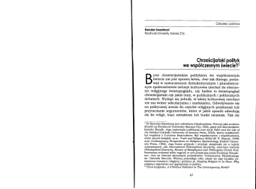 Człowiek i pofrstwo Brendon Sweelmonl Rockhurst University, Konsos City Chrześcijoski polityk we wspołczesnym świecie?2 ycie chtześcijanskim politykiem we wsp łczesnyln Świecie nie jest sprawą łatwą. Jest tak dlatego, ponieważ w nowoczesnyln demokratycznyrn i pluralistyczn5rm społeczenstwie istnieje kulturowa niechęć do obecnościreligijnego światopoglądu,czy będzie to światopogląd chrześcijariski czy jakiŚ inny, w publicznych i politycznych debatach. Wydaje się jednak, iż takiej kulturowej niechęci nie ma wobec sekular5rzmu i marksżmu. OdwoĄrwanie się na poliĘcznej arenie do czyichśreligijnych przekona lub przytaczanie argument w, ktore w jakiśsposob odwołują się do religii, trąci nietaktem lub budzi niesmak. Tak się I Dr Brendan Sweetman jest rodowitym Irlandczykiem. Pracuje jako profesor filozofii na Rockhurst University (Kansas City, USA), gdzie jest kierownikiem katedry filozofii' Jego najnowsza publikacja nosi Ęrtuł Faith and the Life of the Intellect (Catholic University of America Press, 2003), kt rej redaktorern był wspolnie z Curtisem Hancockiem. Był wspołautorem i wsp łwydawcą wielu innych książek, m.ir'. Truth and Religious Belief (M. E. Sharpe, 1998) oraz Contemporary Perspectiues on Religious Epistemologg (Oxford University Press, 1992). Jego liczne arĘrkuĘ i recenzje ukazywaĘ się w takich czasopismach, jak International Philosophical QuarterĘ, American Catholic Philosophical QuarterĘ, Reuieu'l of Metaphgsics and Philosophia Christi. Prof. sweetman ottrymał wiele nagrod, w tymprzyznarLąptzez Fundację Templeton. Jest on rownież aktualnym prezydentem Towarzystwa Filozofrcznego im. Gabriela Marcela. Wiosną przyszłego roku ukaże się jego książka poświęcona tematyce religijnej i poliĘce pt. Keeping Religion in its Place: Whg religious arguments are appropriate in politics. ' Ętuł oryginafu: A Christian Politician In The Contemporary World? 61 Chześcijoćrskipolityk we wspołczesnym świecie? Brendon Sweetmon dzieje nawet wtedy, gdy rozmawiamy o ważnych sprawach, ktore są tematem debaty publicznej i kt re znacząco wpły_ wają na społeczenstwo, jak naprzykład aborcja, eutanazja, polityka zdrowotna, sytuacja bezdomnych, kara śmierci, małżenstwa gejow orazmoralne uzasadnienie wojny. W nowoczesnej kulturze zachodniej, kulturze demokratyczflego pluralizmu, pogląd, Że czyjaśreligia powinna być sprawą prywatną i nie powinna mieć wptywu na Ęcie publiczne, na debaty polityczne w kwestiach politycznych, moralnych czy społecznych,jest obecnie niemal standardem. Niewykluczone, ż z powodu tej ,,oficja1nej'' reakcji na najmniejszą wzmiankę na temat czyichś przekonan religijnych w polityce, niekt rzy politycy i intelektualiŚci religijni czująsię jakby wyłączenizpoIiLycznejdyskusji, jakgdybynaJeŻeIidoobywateli drugiej kategorii, a nawet - jak gdyby fakĘcznie istniało urzędowe uprzedzenie wobec ich poglądow. Prawda ta dotyczy zwłaszcza pewnych obszarow Ęcia, takich jak dyskusje toczące się w partiach politycznych, uniwers5rtetach, sądach i mediach. Nie wiadomo dokładnie, dlaczego odwoływanie się do religijnych argumentow uchodzi za cośzłego, jednak przeważa pogląd, że cośz nimijest nie tak, że człowiek powinien żrywić niechęć do forowania własnych przekonan religijnych w polityce. Wśrd liberalnych filozof w poliĘki, do ktorych zaliczyłbym Johna Rawlsa, Ronalda Dworkina, Roberta Audi, Izaaka Berlina i wielu innych, przeważa obecnie zgoda co do tego, Że prezentowanie swoich religijnych przekonan na forum politycznym w społeczeistwie demokratycznym jest czymś moralnie z$rm3. Ten pogląd jest niezmiernie popularny rownież wśrod Ęch, kt rzy w Ameryce wchodzą w skład tzw. grup elitarnych, czyli wŚr d intelektualistow, dziennikar4, TId uniwersytetach, w sądach itp.! ocąrwiścietakie przekonanie stawia 3 zob. zrołaszcza R. Audi, Religious Commitment and Secular Reason, Cambridge, England: Cambridge U.P., 2000; J. Rawls, Political Liberalism, New York: Columbia U.P.. 1996. 2 w trudnym położeniunllłaszcza chrzeŚcijanskiego poliĘka. Znajduje się on w niekorzystnej sytuacji, jako że pod'czas zaangłżowania w politykę nie powinien odwoływać się do swojego światopoglądu. Nie powinien więc odwoływać się do niego, kiedy ubiega się o urząd, kiedy zabiera głos w ważnej sprawie moralnej przed parlamentem, a nawet kiedy głosuje za uch'waleniem ważnego prawa. W niekorzystnej sytuacji taki pogląd stawia rownież chrześcijaskiego obywatela, ponieważ on także nie powinien odwoływać się do swego chrzeŚcijariskiego światopoglądu podczas publicznych debat i głosowari. W mojej krotkiej refleksji chcę wyrazić sprzeciw wobec poglądu, że w demokratycznym społeczenstwie religijne przekonania nie mają do spełnienia żadnej roli politycznej. Wykazę, że jest to pogląd przewrotny, jako że nie można podać Żadnyc}r dobrych powodow na rzecz usunięcia przekona religijnych z polityki. Tym, czego domaga się zbudowanie poglądu, iż religia nie ma żadnego miejsca w debacie politycznej, są niearbitralne powody, kt re wykazaĘby, że z religijnym światopoglądem jest coś,,złego,,. Moja teza brzmi, że takich powod w nie ma. Poza tym już z racji filozoficznychjest czymŚ nie do przyjęcia, aby sekularysta odrzuclł religijne argumenty tylko dlatego, Że on nie akceptuje ich politycznych implikacji - ponieważ nie jest to pow d do wykluczenia religii z debaĘ. Podobnie nie do przyjęcia jest to, aby wyłączając przekonania religijne z poIityki kierował się swoimi przekonaniami politycznymi, a nie rozumem. Ewentualnośćta budzi wątpliwości, ponieważ ostatecznie zmierza do wykluczenia argumentow religijnych z Ęc}n samych racji co poprzednia, czyli tylko dlatego, że ktośnie tubi ich poIiĘcznych implikacji. W wolnym społecze stwie tego rodzaju powody są filozoftcznie nie do zaakceptowania - nie można przeszkadzać wwyrużaniu poglądu (chybaż