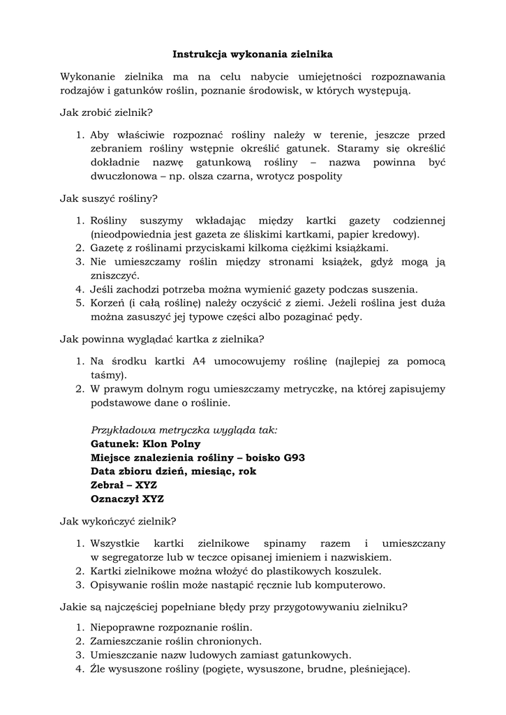 Instrukcja wykonania zielnika Wykonanie zielnika ma na celu nabycie umiejętności rozpoznawania rodzajów i gatunków roślin, poznanie środowisk, w których występują. Jak zrobić zielnik? 1. Aby właściwie rozpoznać rośliny należy w terenie, jeszcze przed zebraniem rośliny wstępnie określić gatunek. Staramy się określić dokładnie nazwę gatunkową rośliny – nazwa powinna być dwuczłonowa – np. olsza czarna, wrotycz pospolity Jak suszyć rośliny? 1. Rośliny suszymy wkładając między kartki gazety codziennej (nieodpowiednia jest gazeta ze śliskimi kartkami, papier kredowy). 2. Gazetę z roślinami przyciskami kilkoma ciężkimi książkami. 3. Nie umieszczamy roślin między stronami książek, gdyż mogą ją zniszczyć. 4. Jeśli zachodzi potrzeba można wymienić gazety podczas suszenia. 5. Korzeń (i całą roślinę) należy oczyścić z ziemi. Jeżeli roślina jest duża można zasuszyć jej typowe części albo pozaginać pędy. Jak powinna wyglądać kartka z zielnika? 1. Na środku kartki A4 umocowujemy roślinę (najlepiej za pomocą taśmy). 2. W prawym dolnym rogu umieszczamy metryczkę, na której zapisujemy podstawowe dane o roślinie. Przykładowa metryczka wygląda tak: Gatunek: Klon Polny Miejsce znalezienia rośliny – boisko G93 Data zbioru dzień, miesiąc, rok Zebrał – XYZ Oznaczył XYZ Jak wykończyć zielnik? 1. Wszystkie kartki zielnikowe spinamy razem i umieszczany w segregatorze lub w teczce opisanej imieniem i nazwiskiem. 2. Kartki zielnikowe można włożyć do plastikowych koszulek. 3. Opisywanie roślin może nastąpić ręcznie lub komputerowo. Jakie są najczęściej popełniane błędy przy przygotowywaniu zielniku? 1. 2. 3. 4. Niepoprawne rozpoznanie roślin. Zamieszczanie roślin chronionych. Umieszczanie nazw ludowych zamiast gatunkowych. Źle wysuszone rośliny (pogięte, wysuszone, brudne, pleśniejące).