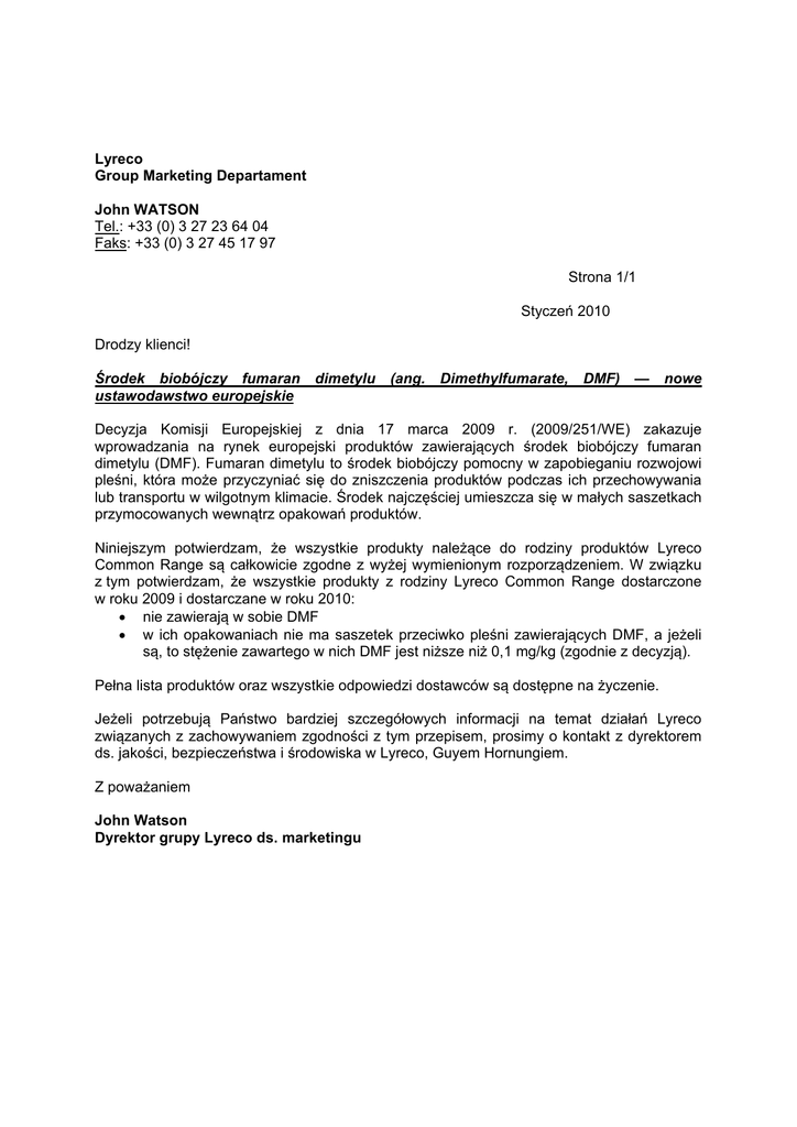 Lyreco Group Marketing Departament John WATSON Tel.: +33 (0) 3 27 23 64 04 Faks: +33 (0) 3 27 45 17 97 Strona 1/1 Styczeń 2010 Drodzy klienci! Środek biobójczy fumaran ustawodawstwo europejskie dimetylu (ang. Dimethylfumarate, DMF) — nowe Decyzja Komisji Europejskiej z dnia 17 marca 2009 r. (2009/251/WE) zakazuje wprowadzania na rynek europejski produktów zawierających środek biobójczy fumaran dimetylu (DMF). Fumaran dimetylu to środek biobójczy pomocny w zapobieganiu rozwojowi pleśni, która może przyczyniać się do zniszczenia produktów podczas ich przechowywania lub transportu w wilgotnym klimacie. Środek najczęściej umieszcza się w małych saszetkach przymocowanych wewnątrz opakowań produktów. Niniejszym potwierdzam, że wszystkie produkty należące do rodziny produktów Lyreco Common Range są całkowicie zgodne z wyżej wymienionym rozporządzeniem. W związku z tym potwierdzam, że wszystkie produkty z rodziny Lyreco Common Range dostarczone w roku 2009 i dostarczane w roku 2010: nie zawierają w sobie DMF w ich opakowaniach nie ma saszetek przeciwko pleśni zawierających DMF, a jeżeli są, to stężenie zawartego w nich DMF jest niższe niż 0,1 mg/kg (zgodnie z decyzją). Pełna lista produktów oraz wszystkie odpowiedzi dostawców są dostępne na życzenie. Jeżeli potrzebują Państwo bardziej szczegółowych informacji na temat działań Lyreco związanych z zachowywaniem zgodności z tym przepisem, prosimy o kontakt z dyrektorem ds. jakości, bezpieczeństwa i środowiska w Lyreco, Guyem Hornungiem. Z poważaniem John Watson Dyrektor grupy Lyreco ds. marketingu