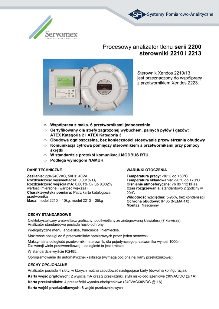 Procesowy analizator tlenu serii 2200 sterowniki 2210 i 2213 Sterownik Xendos 2210/13 jest przeznaczony do współpracy z przetwornikiem Xendos 2223. • • • • • • Współpraca z maks. 6 przetwornikami jednocześnie Certyfikowany dla strefy zagrożonej wybuchem, palnych pyłów i gazów: ATEX Kategoria 2 i ATEX Kategoria 3 Obudowa ognioszczelna, bez konieczności stosowania przewietrzania obudowy Komunikacja cyfrowa pomiędzy sterownikiem a przetwornikami przy pomocy skrętki W standardzie protokół komunikacji MODBUS RTU Podlega wymogom NAMUR DANE TECHNICZNE WARUNKI OTOCZENIA Zasilanie: 220-240VAC, 50Hz, 40VA Rozdzielczość wyświetlacza: 0,001% O2 Rozdzielczość wyjścia mA: 0,001% O2 lub 0,002% wartości mierzonej (wartość większa) Charakterystyka pomiaru: Patrz karta katalogowa przetwornika Masa: model 2210 – 10kg, model 2213 – 25kg Temperatura pracy: -10°C do +50°C Temperatura składowania: -20°C do +70°C Ciśnienie atmosferyczne: 76 do 112 kPaa Czas rozgrzewania: standardowo 2 godziny w 20°C Wilgotność względna: 5-95%, bez kondensacji Ochrona obudowy: IP 65 (NEMA 4X) Montaż: Naścienny CECHY STANDARDOWE Ciekłokrystaliczny wyświetlacz graficzny, podświetlany ze zintegrowaną klawiaturą (7 klawiszy). Analizator standardowo posiada hasło ochrony. Wielojęzyczne menu: angielskie, francuskie i niemieckie. Możliwość obsługi do 6 przetworników pomiarowych przez jeden sterownik. Maksymalna odległość przetwornik – sterownik, dla pojedynczego przetwornika wynosi 1000m. Dla wersji wielo-przetwornikowej – odległość ta jest krótsza. W standardzie wyjście RS485. Oprogramowanie do automatycznej kalibracji (wymaga opcjonalnej karty przekaźnikowej). CECHY OPCJONALNE Analizator posiada 4 sloty, w których można zabudować następujące karty (dowolna konfiguracja): Karta wyjść prądowych: 2 wyjścia mA oraz 2 przekaźniki, styki nisko-obciążeniowe (30VAC/DC @ 1A) Karta przekaźników: 4 przekaźniki wysoko-obciążeniowe (240VAC/30VDC @ 1A) Karta wejść przekaźnikowych: 8 wejść przekaźnikowych KARTY INTERFEJSU ZEWNĘTRZNEGO Karta wejść cyfrowych 8 wejść cyfrowych, konfigurowalnych przez użytkownika. Możliwe zastosowanie: inicjacja auto-kalibracji, zdalna zmiana zakresu pomiarowego, potwierdzanie wiarygodności wejść mA, współpraca z cyfrowym czujnikiem przepływu. Karta wyjść analogowych 2 izolowane galwanicznie wyjścia 0/4 -20 mA, z dowolnie konfigurowalnym zerem i zakresem. Możliwość definiowania drugiego zakresu, wyzwalanego przekaźnikiem zewnętrznym. Maksymalny opór obciążenia wynosi 1 kΩ. Wszystkie wyjścia mogą być konfigurowalne w trybie odwrotnym, maks. prąd dla wszystkich wyjść wynosi 21,5 mA. 2 nisko-obciążeniowe (30VAC/DC @ 1A) przekaźniki, konfigurowalne przez użytkownika jako alarmy stanu pracy (NAMUR), alarm, funkcja zmiany zakresu lub przekaźnik auto-kalibracji. Wyjście prądowe może przyjmować (zgodnie z NAMUR 43) wartość maks. lub min. w przypadku wystąpienia błędu pracy. Karta wyjść przekaźnikowych 4 przekaźniki wysoko-obciążeniowe (240VAC/30VDC @ 1A), konfigurowalne przez użytkownika jako alarm statusu pracy (NAMUR), alarm, błąd pracy lub przekaźnik auto-kalibracji. Wyjście cyfrowe przetwornika W standardzie: RS485 z protokołem komunikacji MODBUS ZGODNOOŚĆ Z NORMAMI EC Analizator Xendos 2213 spełnia Dyrektywy: Low Voltage Directive 73/23/EEC i EMC Directive 89/336/EEC, obie uaktualnione przez Dyrektywę 93/68/EEC. Wykonany jest zgodnie z normami EN 61010-1 i EN 61326-1. Sklasyfikowany jest zgodnie z IEC 664 jako „Installation Category II” oraz „Pollution Degree 2”. DOPUSZCZENIE DO STREFY ZAGROŻENIA WYBUCHEM: Xendos 2210: ATEX Ex II 3GD EEx nC(ia) IIC T4 (-10°C < Ta < 50C) Xendos 2213: ATEX Ex II 2GD EEx ia d IIC T4 (-10°C < Ta < 50C) Wymiary podano w mm Xendos 2210 (ATEX, kategoria 3) Xendos 2213 (ATEX, kategoria 2) Wymiary podano w mm Przedstawiciel firmy Servomex na terenie Polski: SPA Systemy Pomiarowo-Analityczne sp. z o.o. www.spa-systemy.pl; [email protected]