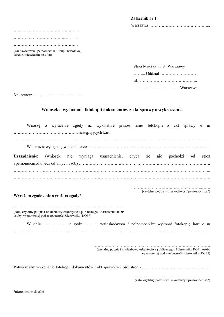 Załącznik nr 1 Warszawa ……………………………………... ………………………………………... ………………………………............... ………………………………………... (wnioskodawca / pełnomocnik – imię i nazwisko, adres zamieszkania, telefon) Straż Miejska m. st. Warszawy ……... Oddział ……………………… ul. …………………………………... …………………………….Warszawa Nr sprawy: ……………………………… Wniosek o wykonanie fotokopii dokumentów z akt sprawy o wykroczenie Wnoszę o wyrażenie zgody na wykonanie przeze mnie fotokopii z akt sprawy o nr ……………………………………….. następujących kart: …………………………………………………..………………………………………………………………………… W sprawie występuję w charakterze……………………………………………………………………………... Uzasadnienie: (wniosek nie wymaga uzasadnienia, chyba że nie pochodzi od stron i pełnomocników lecz od innych osób) ……………………………………..……………………………………………. ………………...…………………………………………………………………………………………………………... …………………………………………………………………………………………………………………………….. …………………………………………..…… (czytelny podpis wnioskodawcy / pełnomocnika*) Wyrażam zgodę / nie wyrażam zgody* ……………………………………………………………………. (data, czytelny podpis i nr służbowy oskarżyciela publicznego / Kierownika ROP / osoby wyznaczonej pod nieobecność Kierownika ROP*) W dniu ……………….o godz. ………..wnioskodawca / pełnomocnik* wykonał fotokopię kart o nr …………………………………………………………………………….......................................................................... ……………………………….………………………………………… (czytelny podpis i nr służbowy oskarżyciela publicznego / Kierownika ROP / osoby wyznaczonej pod nieobecność Kierownika ROP*) Potwierdzam wykonanie fotokopii dokumentów z akt sprawy w ilości stron - …………………………………………. …………………………………………………………… (data, czytelny podpis wnioskodawcy / pełnomocnika*) *niepotrzebne skreślić
