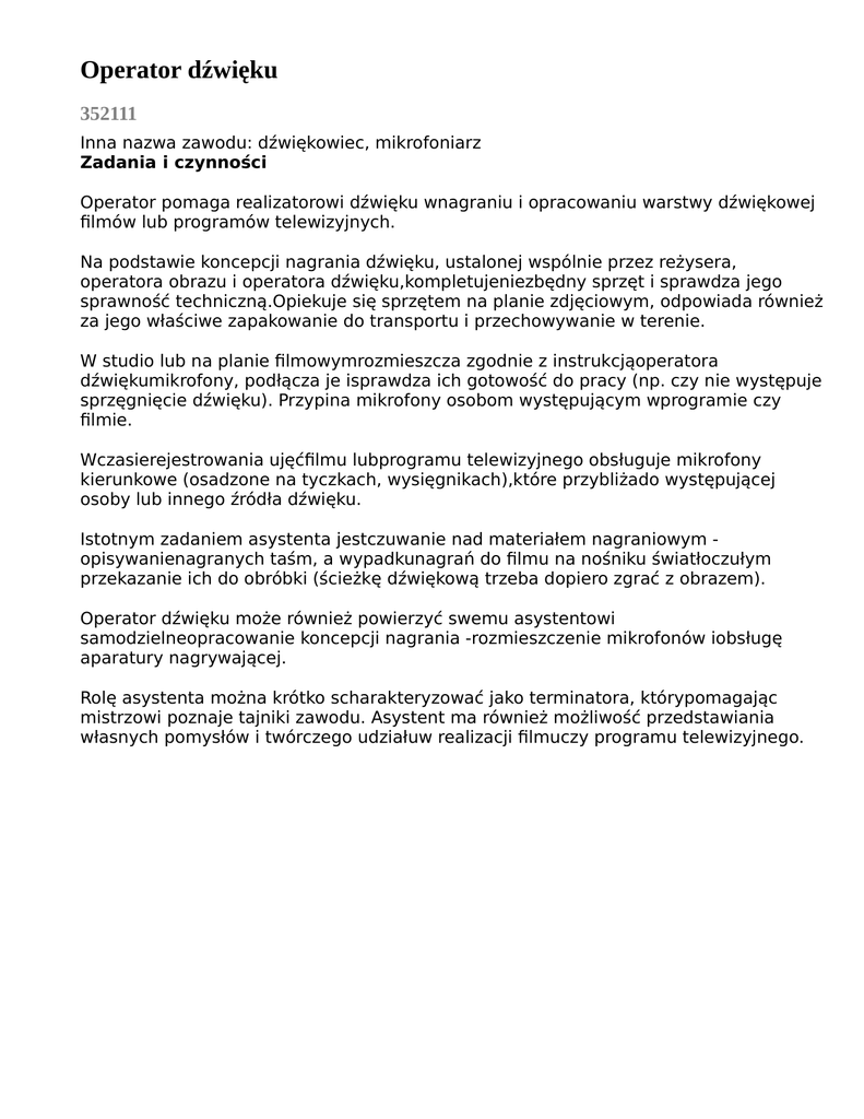 Operator dźwięku 352111 Inna nazwa zawodu: dźwiękowiec, mikrofoniarz Zadania i czynności Operator pomaga realizatorowi dźwięku wnagraniu i opracowaniu warstwy dźwiękowej filmów lub programów telewizyjnych. Na podstawie koncepcji nagrania dźwięku, ustalonej wspólnie przez reżysera, operatora obrazu i operatora dźwięku,kompletujeniezbędny sprzęt i sprawdza jego sprawność techniczną.Opiekuje się sprzętem na planie zdjęciowym, odpowiada również za jego właściwe zapakowanie do transportu i przechowywanie w terenie. W studio lub na planie filmowymrozmieszcza zgodnie z instrukcjąoperatora dźwiękumikrofony, podłącza je isprawdza ich gotowość do pracy (np. czy nie występuje sprzęgnięcie dźwięku). Przypina mikrofony osobom występującym wprogramie czy filmie. Wczasierejestrowania ujęćfilmu lubprogramu telewizyjnego obsługuje mikrofony kierunkowe (osadzone na tyczkach, wysięgnikach),które przybliżado występującej osoby lub innego źródła dźwięku. Istotnym zadaniem asystenta jestczuwanie nad materiałem nagraniowym opisywanienagranych taśm, a wypadkunagrań do filmu na nośniku światłoczułym przekazanie ich do obróbki (ścieżkę dźwiękową trzeba dopiero zgrać z obrazem). Operator dźwięku może również powierzyć swemu asystentowi samodzielneopracowanie koncepcji nagrania -rozmieszczenie mikrofonów iobsługę aparatury nagrywającej. Rolę asystenta można krótko scharakteryzować jako terminatora, którypomagając mistrzowi poznaje tajniki zawodu. Asystent ma również możliwość przedstawiania własnych pomysłów i twórczego udziałuw realizacji filmuczy programu telewizyjnego.