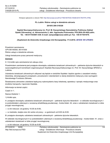 Dz.U./S S209 27/10/2010 318328-2010-PL Państwa członkowskie - Zamówienie publiczne na usługi - Dodatkowe informacje - Procedura otwarta 1/4 Niniejsze ogłoszenie w witrynie TED: http://ted.europa.eu/udl?uri=TED:NOTICE:318328-2010:TEXT:PL:HTML PL-Lublin: Różne usługi w dziedzinie zdrowia 2010/S 209-318328 Szpital Neuropsychiatryczny im. Prof. M. Kaczyńskiego Samodzielny Publiczny Zakład Opieki Zdrowotnej, ul. Abramowicka 2, attn: Agnieszka Piotrowska, POLSKA-20-442Lublin. Tel. +48 817443061-439. E-mail: [email protected]. Fax +48 817441079. (Suplement do Dziennika Urzędowego Unii Europejskiej, 17.9.2010, 2010/S 181-276367) Przedmiot zamówienia: CPV:85140000, 85141000 Różne usługi w dziedzinie zdrowia. Usługi świadczone przez personel medyczny. Zamiast: II.1.5) krótki opis zamówienia lub zakupu (ów). Przedmiotem zamówienia jest przejęcie obowiązku udzielania świadczeń zdrowotnych – pełnienia dyżurów lekarskich w wyszczególnionych komórkach organizacyjnych Szpitala Neuropsychiatrycznego im. Prof. M. Kaczyńskiego SPZOZ w Lublinie. Udzielanie świadczeń zdrowotnych odbywać się będzie w siedzibie Szpitala i będzie zgodne z zasadami wiedzy lekarskiej, obowiązującymi przepisami, procedurami i standardami w danej dziedzinie medycyny oraz wymogami Narodowego Funduszu Zdrowia. Świadczenia zdrowotne udzielane będą przy wykorzystaniu bazy lokalowej, aparatury i sprzętu medycznego oraz środków transportu i łączności Szpitala. Informacje na temat części. Część nr 1. Nazwa Zadanie 1. 1) Krótki opis. A: przejęcie obowiązku udzielania świadczeń zdrowotnych – pełnienie dyżurów lekarskich - w oddziale neurologicznym I (z pododdziałem udarowym z wczesną rehabilitacją poudarową) - liczba łóżek: 44, wraz z udzielaniem świadczeń w izbie przyjęć neurologicznej. — w dni robocze: od godziny 15:35 do 8:00, — w niedziele, święta oraz dni wolne od pracy – w godzinach od 8:00 do 8:00. B: przejęcie obowiązku udzielania świadczeń zdrowotnych - pełnienie dyżurów lekarskich. W oddziale neurologicznym II (z pododdziałem udarowym z wczesną rehabilitacją poudarową) – liczba łóżek: 41, wraz z udzielaniem świadczeń w izbie przyjęć neurologicznej. — w dni robocze: od godziny 15:35 do 8:00, 27/10/2010 S209 http://ted.europa.eu/TED Państwa członkowskie - Zamówienie publiczne na usługi - Dodatkowe informacje - Procedura otwarta Suplement do Dziennika Urzędowego Unii Europejskiej 1/4 Dz.U./S S209 27/10/2010 318328-2010-PL Państwa członkowskie - Zamówienie publiczne na usługi - Dodatkowe informacje - Procedura otwarta 2/4 — w niedziele, święta oraz dni wolne od pracy – w godzinach od 8:00 do 8:00. Szacunkowa liczba godzin dla zadania 1 wynosi: 13 667 h 40 min. Część nr 2. Nazwa Zadanie 2. 1) Krótki opis. Przejęcie obowiązku udzielania świadczeń zdrowotnych - pełnienie dyżurów lekarskich w oddziale chorób wewnętrznych z pododdziałem intensywnej terapii (liczba łóżek – 38), wraz z udzielaniem świadczeń w izbie przyjęć. — w dni robocze: od godziny 15:35 do 8:00, — w niedziele, święta oraz dni wolne od pracy – w godzinach od 8:00 do 8:00. Szacunkowa liczba godzin dla zadania 2 wynosi: 6 833 h 50 min. Część nr 3. Nazwa Zadanie 3. 1) Krótki opis. Przejęcie obowiązku udzielania świadczeń zdrowotnych - pełnienie dyżurów lekarskich w izbie przyjęć psychiatrycznej. — w dni robocze: od godziny 15:35 do 8:00, — w niedziele, święta oraz dni wolne od pracy – w godzinach od 8:00 do 8:00. Szacunkowa liczba godzin dla zadania 3 wynosi: 6 833 h 50 min. Część nr 4. Nazwa Zadanie 4. 1) Krótki opis. Przejęcie obowiązku udzielania świadczeń zdrowotnych - pełnienie dyżurów lekarskich w oddziałach psychiatrycznych i odwykowych (liczba łóżek: 664). — w dni robocze: od godziny 15:35 do 8:00, — w niedziele, święta oraz dni wolne od pracy – w godzinach od 8:00 do 8:00. Szacunkowa liczba godzin dla zadania 4 wynosi: 6 833 h 50 min. Część nr 5. Nazwa Zadanie 5. 1) Krótki opis. Przejęcie obowiązku udzielania świadczeń zdrowotnych - pełnienie dyżurów lekarskich w Zakładzie Diagnostyki Radiologicznej (w pracowni rentgenodiagnostyki ogólnej, pracowni USG i pracowni tomografii komputerowej). — w dni robocze: od godziny 18:00 do 8:00, — w niedziele, święta oraz dni wolne od pracy – w godzinach od 8:00 do 8:00. Szacunkowa liczba godzin dla zadania 5 wynosi: 6 220 h. 27/10/2010 S209 http://ted.europa.eu/TED Państwa członkowskie - Zamówienie publiczne na usługi - Dodatkowe informacje - Procedura otwarta Suplement do Dziennika Urzędowego Unii Europejskiej 2/4 Dz.U./S S209 27/10/2010 318328-2010-PL Państwa członkowskie - Zamówienie publiczne na usługi - Dodatkowe informacje - Procedura otwarta 3/4 IV.3.3) Warunki uzyskania specyfikacji i dokumentów dodatkowych. Termin składania wniosków dotyczących uzyskania dokumentów lub dostępu do dokumentów 22.10.2010 - 14:00. IV.3.4) Termin składania ofert lub wniosków o dopuszczenie do udziału w postępowaniu. 25.10.2010 - 09:00. Powinno być: II.1.5) krótki opis zamówienia lub zakupu (ów). Przedmiotem zamówienia jest pełnienie dyżurów lekarskich w wyszczególnionych komórkach organizacyjnych Szpitala Neuropsychiatrycznego im. Prof. M. Kaczyńskiego SPZOZ w Lublinie. Udzielanie świadczeń zdrowotnych odbywać się będzie w siedzibie Szpitala i będzie zgodne z zasadami wiedzy lekarskiej, obowiązującymi przepisami, procedurami i standardami w danej dziedzinie medycyny oraz wymogami Narodowego Funduszu Zdrowia. Świadczenia zdrowotne udzielane będą przy wykorzystaniu bazy lokalowej, aparatury i sprzętu medycznego oraz środków transportu i łączności Szpitala. Informacje na temat części. Część nr 1. Nazwa Zadanie 1. 1) Krótki opis. A: pełnienie dyżurów lekarskich - w oddziale neurologicznym I (z pododdziałem udarowym z wczesną rehabilitacją poudarową) - liczba łóżek: 44, w