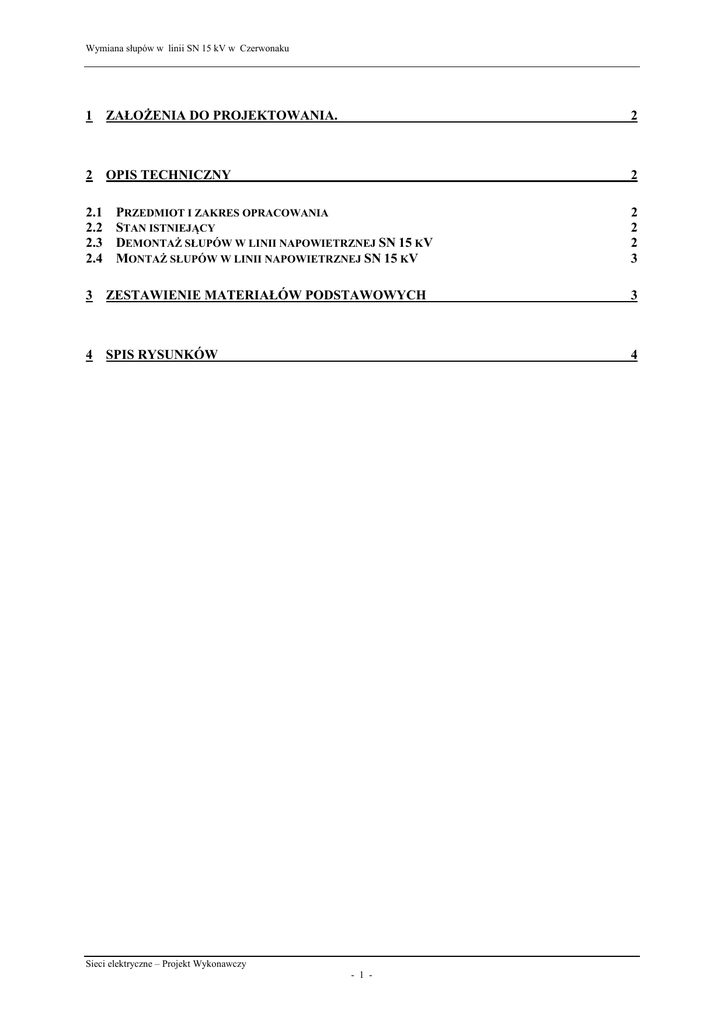 Wymiana słupów w linii SN 15 kV w Czerwonaku 1 ZAŁOŻENIA DO PROJEKTOWANIA. 2 2 OPIS TECHNICZNY 2 2.1 2.2 2.3 2.4 PRZEDMIOT I ZAKRES OPRACOWANIA STAN ISTNIEJĄCY DEMONTAŻ SŁUPÓW W LINII NAPOWIETRZNEJ SN 15 KV MONTAŻ SŁUPÓW W LINII NAPOWIETRZNEJ SN 15 KV 2 2 2 3 3 ZESTAWIENIE MATERIAŁÓW PODSTAWOWYCH 3 4 SPIS RYSUNKÓW 4 Sieci elektryczne – Projekt Wykonawczy - 1 - Wymiana słupów w linii SN 15 kV w Czerwonaku 1 Założenia do projektowania. 1. Projekt zagospodarowania działek inwestora w Czerwonaku 2. Obowiązujące przepisy i normy • Norma PN-IE 05115 Instalacje elektroenergetyczne prądu przemiennego o napięciu wyższym od 1 kV z 2002r. • Norma PN-E 05100-1;1998. Elektryczne linie napowietrzne. Projektowanie i budowa. Linie prądu przemiennego z przewodami roboczymi gołymi. • Norma N SEP-E-004 Elektroenergetyczne i sygnalizacyjne linie kablowe. Projektowanie i budowa z 9 października 2003r. • Rozporządzenie Ministra Przemysłu nr 473 z dnia 08.10.1990r. (Dz. U. nr 81) • Ustawa Prawo Budowlane z 7 lipca 1994r z • Rozporządzenie Ministra Infrastruktury z dnia 12 kwietnia 2002r. W sprawie warunków technicznych, jakim powinny odpowiadać budynki i ich usytuowanie. 3. Katalogi : • Album linii napowietrznych średniego napięcia 15-20 kV z przewodami gołymi na żerdziach wirowanych. Układ trójkątny. LSNS 70(50) TOM I – Elprojekt 2008r. • Album słupów z odłącznikami, rozłącznikami i głowicami kablowymi linii napowietrznych średniego napięcia 15-20 kV z przewodami gołymi na żerdziach wirowanych. Układ trójkątny. LSNS-og 70(50) TOM II – Elprojekt 2008r 4. Warunki usunięcia kolizji linii SN 15 kV RD-1/DZ/ZR/2009/K/0158 wydane przez ENEA 11.05.2009r. 2 Opis techniczny 2.1 Przedmiot i zakres opracowania Przedmiotem opracowania jest projekt wykonawczy wymiany słupów linii napowietrznej SN 15 kV kolidujących z planowaną inwestycją w miejscowości Czerwonak, na działkach 30 i _. 2.2 Stan istniejący Istniejąca linia SN 15 kV przechodząc przez działkę 30 koliduje z planowaną inwestycją (ogrodzenie boiska do siatkówki i koszykówki). Linia wykonana jest linką 3xAFL-6 70 mm2, w układzie trójkątnym na słupach 12m z izolatorami stojącymi(słupy przelotowe) wg albumu LSN 70-ŻN Energoprojekt Poznań oraz w przypadku słupa nr 2 – z izolatorami wiszącymi i izolatorami stojącymi na żerdzi wirowanej. 2.3 Demontaż słupów w linii napowietrznej SN 15 kV W celu usunięcia kolizji z ogrodzeniem projektowanego boiska należy : • Zdemontować słup nr 4 przelotowy P-12/ŻN stojący na działce nr _ • Zdemontować słup nr 3 rozgałęźny odporowo krańcowy ROK-12/ŻN stojący na działce nr 30 • Zdemontować słup nr 2 odporowy O-12/E stojący na działce nr 30 Sieci elektryczne – Projekt Wykonawczy - 2 - Wymiana słupów w linii SN 15 kV w Czerwonaku • Zdemontować słup nr 1 odporowy z odłącznikiem P11-707, Oo-12/ŻN stojący na działce nr 30 • Linkę od strony słupa nr 4 połączyć w przęśle pomiędzy projektowanym słupem nr 4 a istniejącym słupem nr 5 • Linkę od strony słupa nr 2 połączyć pomiędzy projektowanym słupem 1 a projektowanym słupem 2 • Zdemontować linkę pomiędzy słupami 3 i 1 • Jednostronnie zdemontować linki ze słupa nr 1w kierunku stacji MST-3101. 2.4 Montaż słupów w linii napowietrznej SN 15 kV Demontowane słupy 1,2,4 zastąpić słupami zaprojektowanymi wg katalogu LSNS 70(50) TOM I Elprojekt. Uzbrojenie słupów funkcyjnych wykonać wg LSN-og 70(50) TOM II Elprojekt. Słup nr 4 zastąpić słupem N1og-12/6. Słup wyposażyć w odłącznik z uziemnikiem OUN-p, ograniczniki przepięć, uziemienie dla odgałęzienia kablowego przewidywanego w II etapie inwestycji . Słup nr 1 zastąpić słupem RNK1o-12/17,5. Słup wyposażyć w ON oraz uziemienie. Na słupie zakończyć istniejące linki w kierunku stacji słupowej MST-3101. Słup nr 2 zastąpić słupem ON1-12/17,5. Na słupie zakończyć dotychczas zawieszone linki. Wymienić linki na długości 160m. Nową linkę poprowadzić przelotowo na słupach 4 i 1. Połączyć z istniejącą linką pomiędzy słupami 5 i 4 oraz 2 i 1.Naciągu linek dokonać z naprężeniem normalnym 83 MPa. Przęsło pomiędzy słupami 4 i 2 wykonać w obostrzeniu 1º. Zdemontowaną linkę zakończyć ponownie na słupie nr 2. Projektowany słup nr 4 N1og-12/6 wyposażyć w: • fundament U2a • uziom: dla celów odgromowych o wartości 10 Ω ; dla celów ochrony przeciwporażeniowej zapewniający napięcie rażenia UT<UTP=65V ; dla wykonania uziomu przyjąć rezystywność zastępczą gruntu 500 Ωm i uziom TP1 • komplet tablic ostrzegawczych i informacyjnych • odłącznik OUN-p III-24/4 z napędem NR-C • komplet ograniczników przepięć 15 kV (POLIM–D18N firmy ABB) Projektowany słup nr 1 RNK1o-12/17,5 wyposażyć w: • fundament U3 • uziom dla celów ochrony przeciwporażeniowej zapewniający napięcie rażenia UT<UTP=65V ; dla wykonania uziomu przyjąć rezystywność zastępczą gruntu 500 Ωm i uziom TP1 • komplet tablic ostrzegawczych i informacyjnych • odłącznik ON III-24/4 z napędem NR-C Projektowany słup nr 1 ON1-12/17,5 wyposażyć w: • fundament U3a • komplet tablic ostrzegawczych i informacyjnych Projektowane słupy zlokalizowane są na terenie działek inwestora, w miejsce słupów demontowanych z dostępem dla obsługi od wewnątrz działki inwestora. 3 Zestawienie materiałów podstawowych Tabela oraz karty katalogowe słupów i wyposażenia w załączeniu. Sieci elektryczne – Projekt Wykonawczy - 3 - Wymiana słupów w linii SN 15 kV w Czerwonaku 4 Spis rysunków 1. Plan istniejącej linii energetycznej SN 15 kV 2. Schemat linii SN Sieci elektryczne – Projekt Wykonawczy - 4 - Wymiana słupów w linii SN 15 kV w Czerwonaku SŁUP NR 1 RNK1o-12/17,5 Wyposażony w odłącznik Sieci elektryczne – Projekt Wykonawczy - 5 - Wymiana słupów w linii SN 15 kV w Czerwonaku SŁUP NR 4 N1og-12/6 Wyposażony 